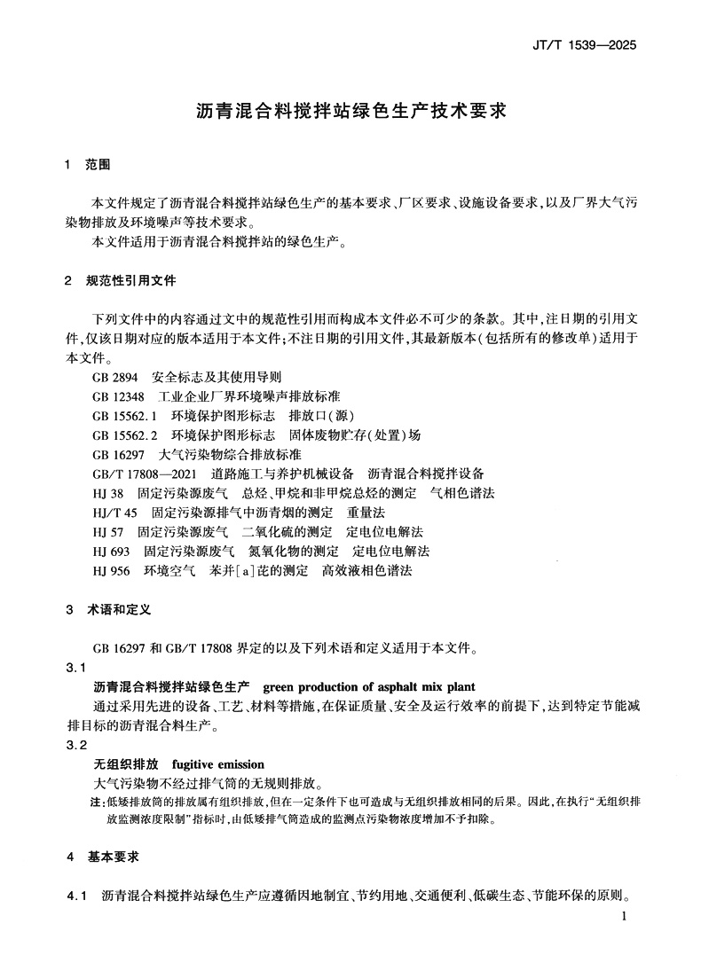 书名:沥青混合料搅拌站绿色生产技术要求(JT/T 1539—2025)