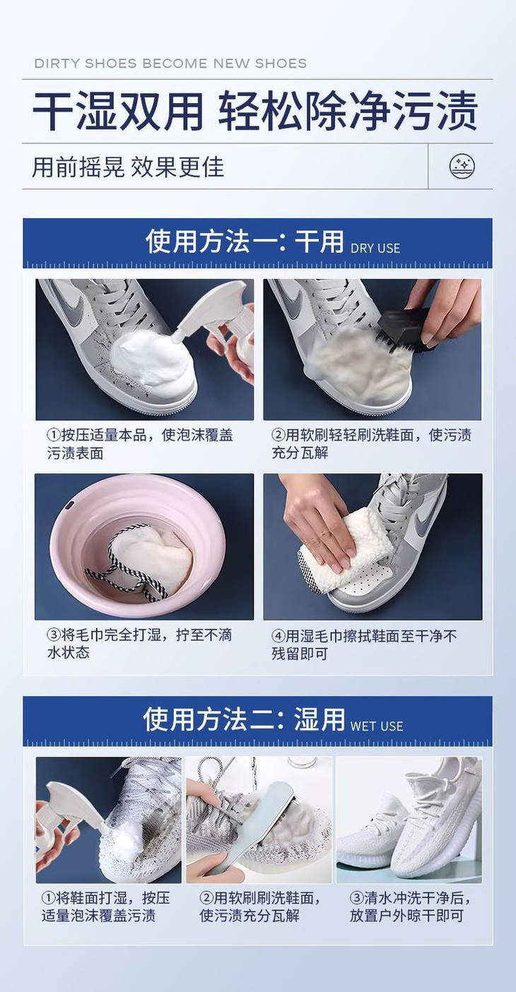 【即刷即穿!免水洗无需等晾干】天天穿“新鞋”,小白鞋清洁剂洗鞋神器免洗去渍去污增白去黄泡沫擦鞋子专用清洗剂。rc