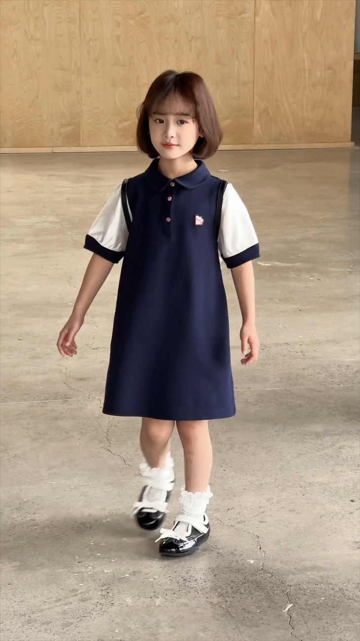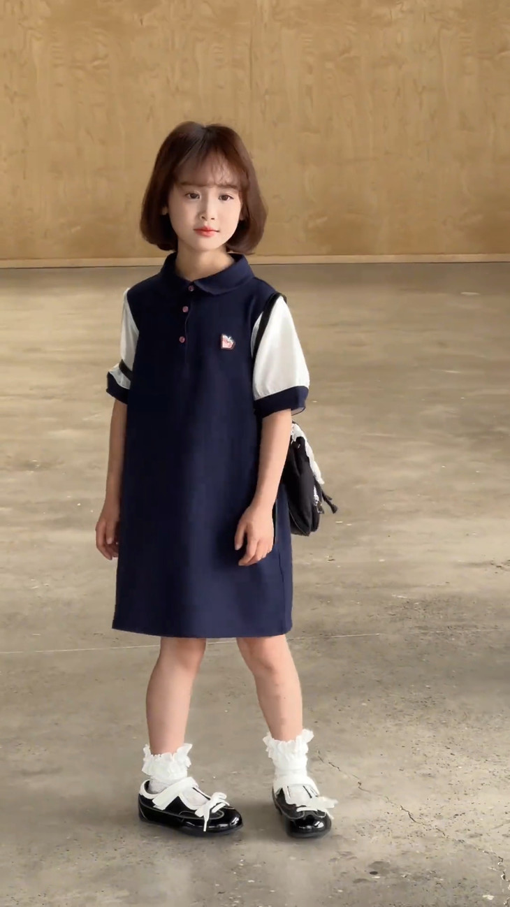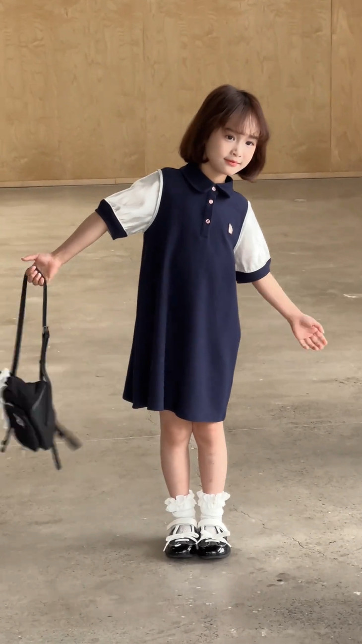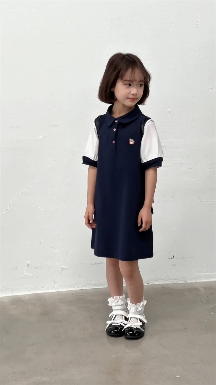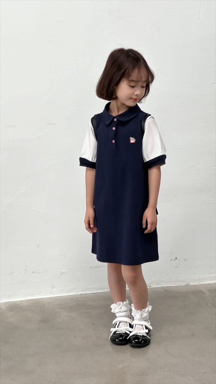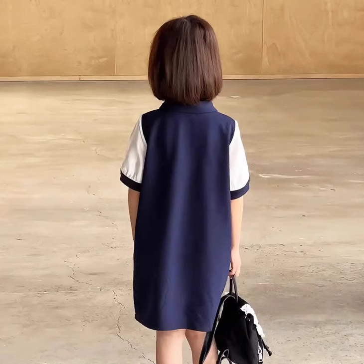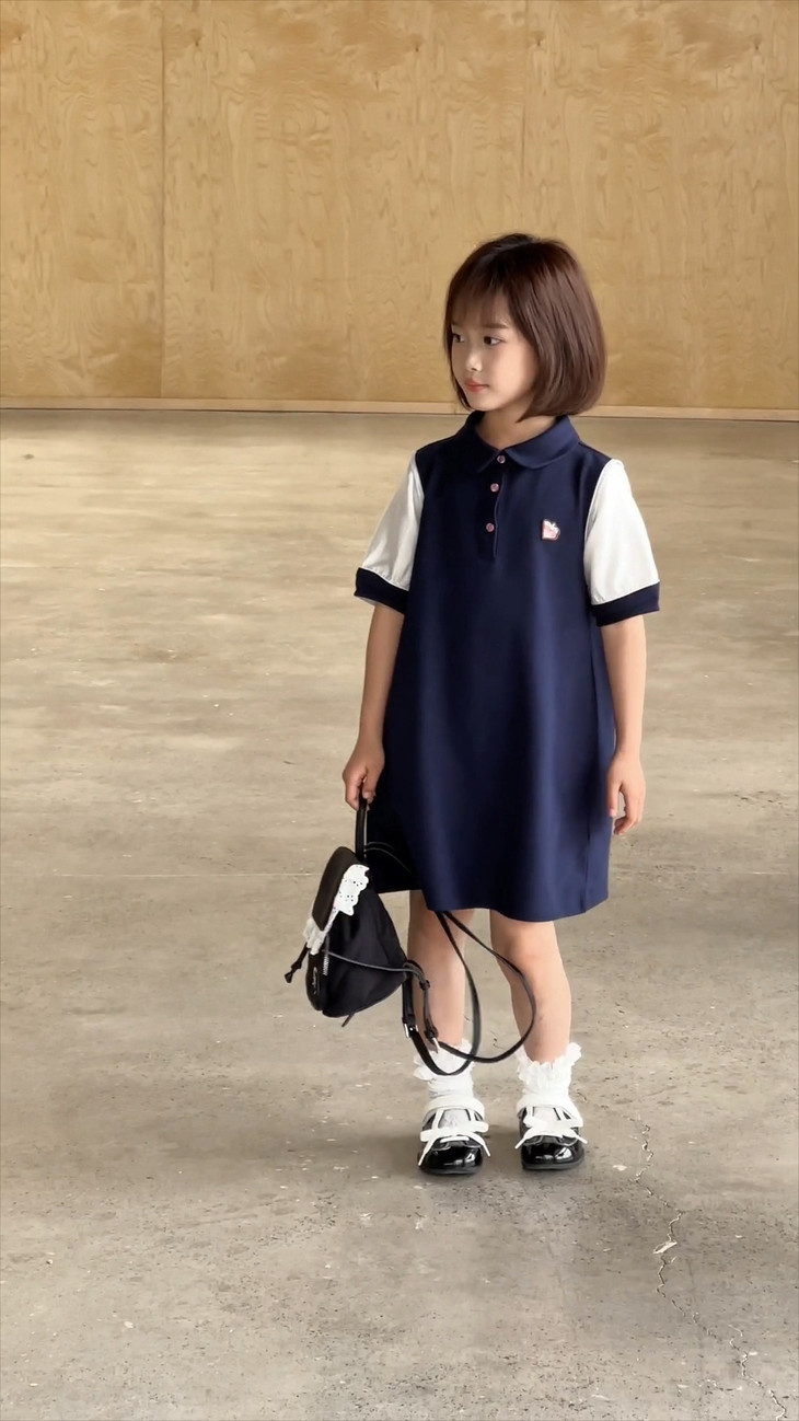 学院风满满的一条 Polo 拼接连衣裙~ 色系选做了藏青色,对比黑色没有那么沉闷, 上身显白显肤色,适合各种肤色 BB , 领口做了Polo 娃娃领+门襟纽扣设计,穿脱方便视觉上又会显脸小, 袖口处也做了亮纱拼接撞色,碰撞出独特时髦感, 袖口拼接处做了不规则打褶工艺,彰显个性不撞款~ 直筒裙型适配各种身形,跑跑跳跳无束缚,搭个小挎包, 校园元气look轻松拿捏,妥妥被同学追着问链接的宝藏裙!