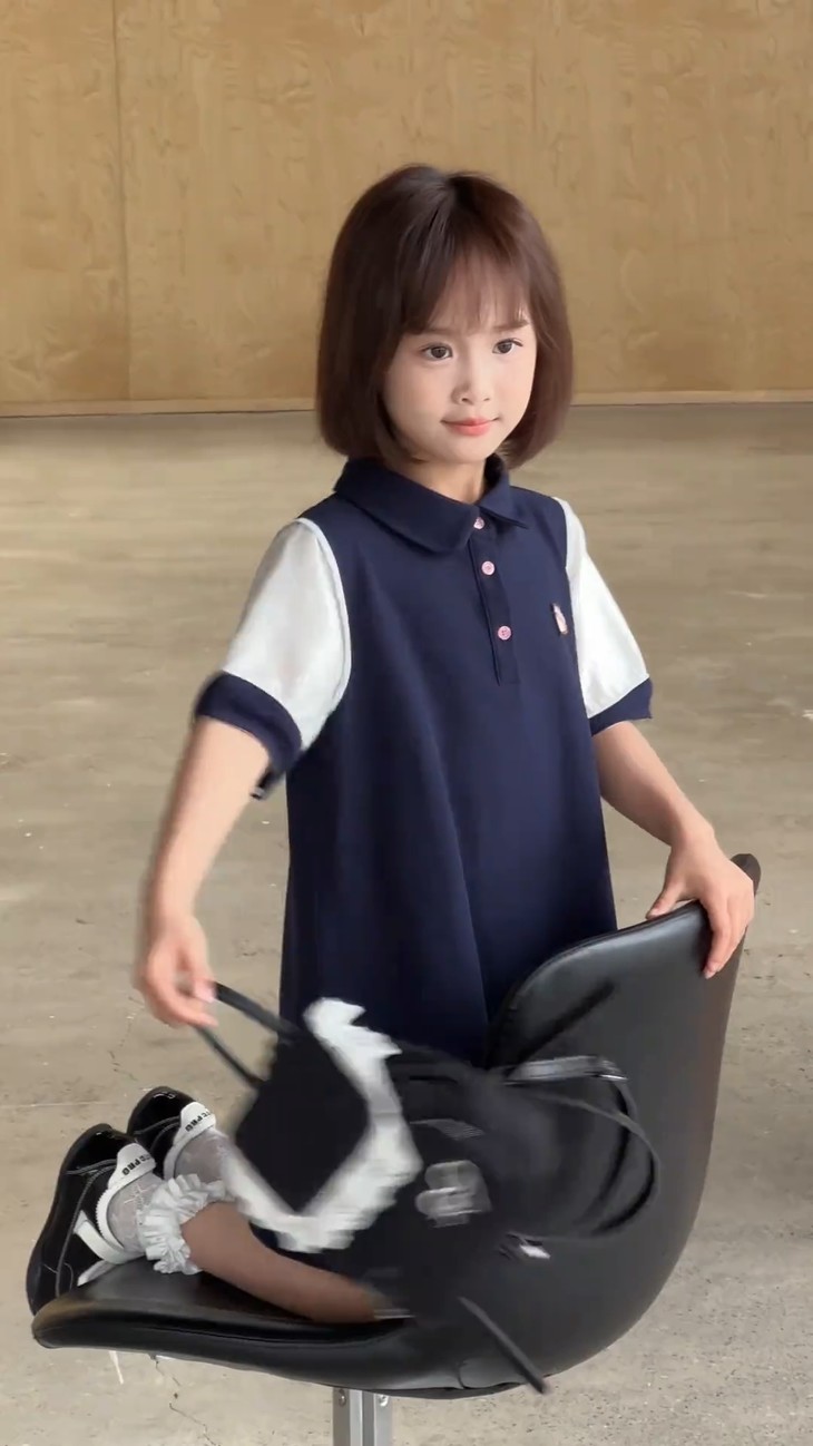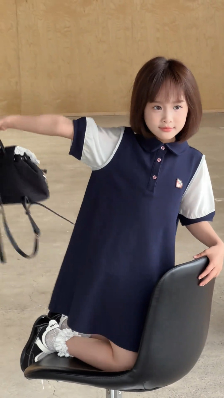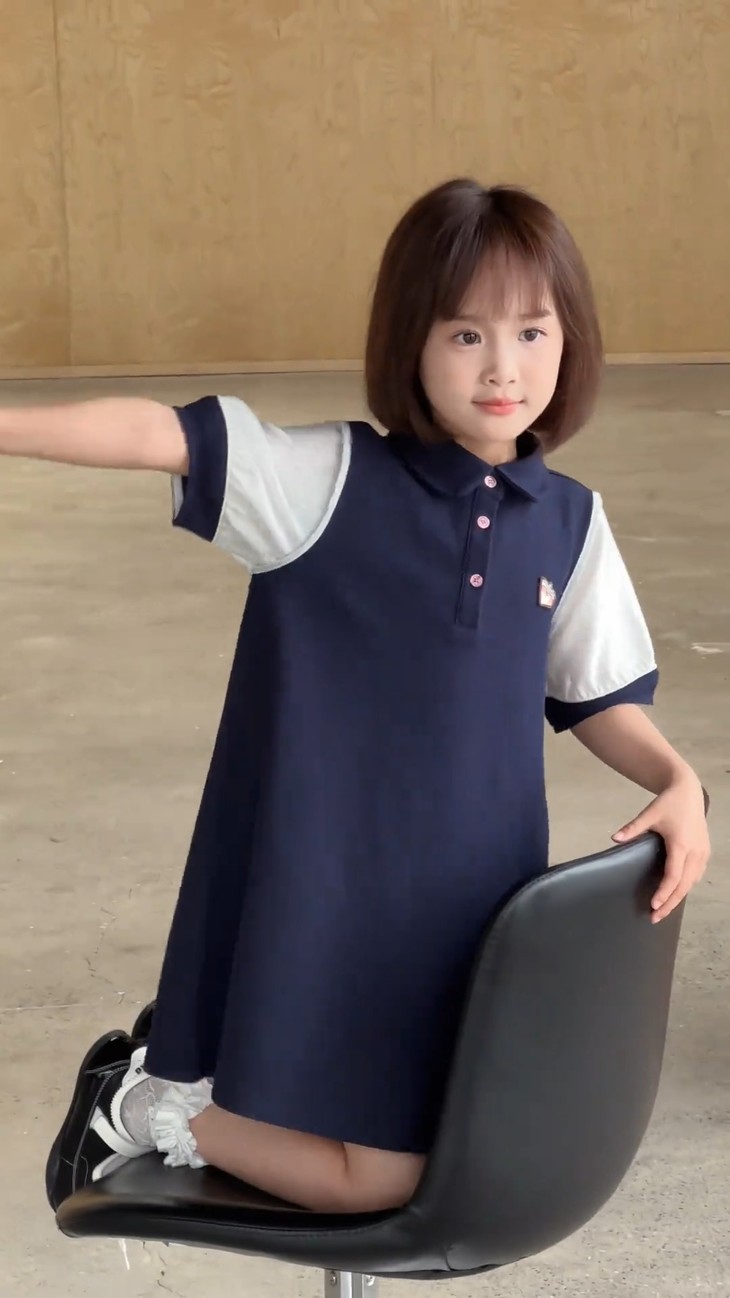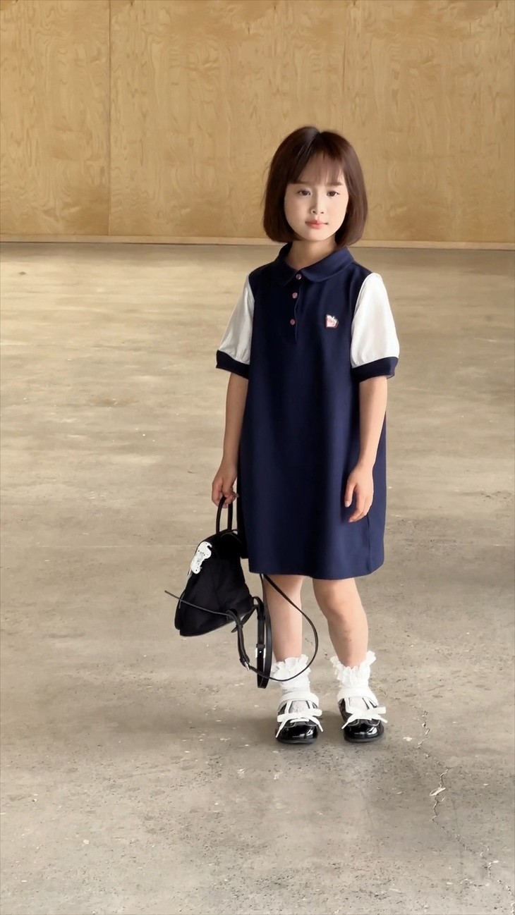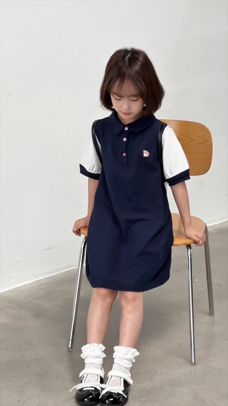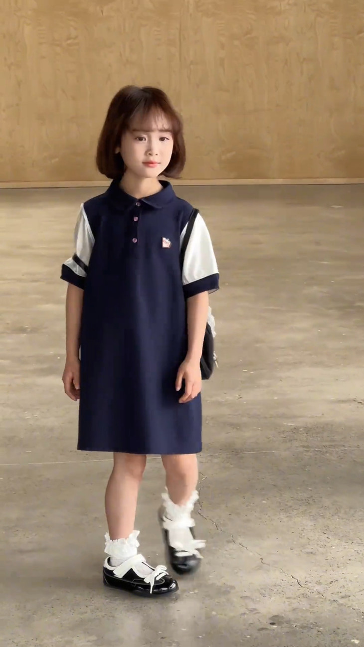 学院风满满的一条 Polo 拼接连衣裙~ 色系选做了藏青色,对比黑色没有那么沉闷, 上身显白显肤色,适合各种肤色 BB , 领口做了Polo 娃娃领+门襟纽扣设计,穿脱方便视觉上又会显脸小, 袖口处也做了亮纱拼接撞色,碰撞出独特时髦感, 袖口拼接处做了不规则打褶工艺,彰显个性不撞款~ 直筒裙型适配各种身形,跑跑跳跳无束缚,搭个小挎包, 校园元气look轻松拿捏,妥妥被同学追着问链接的宝藏裙!