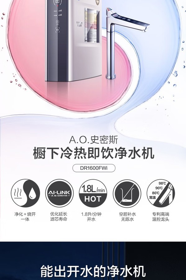 AO史密斯(510409)DR1600HF1Wi反渗透加热净水器 100℃真开水 家用直饮水机 智能优化滤芯