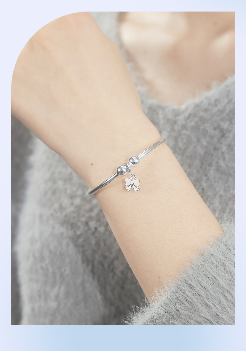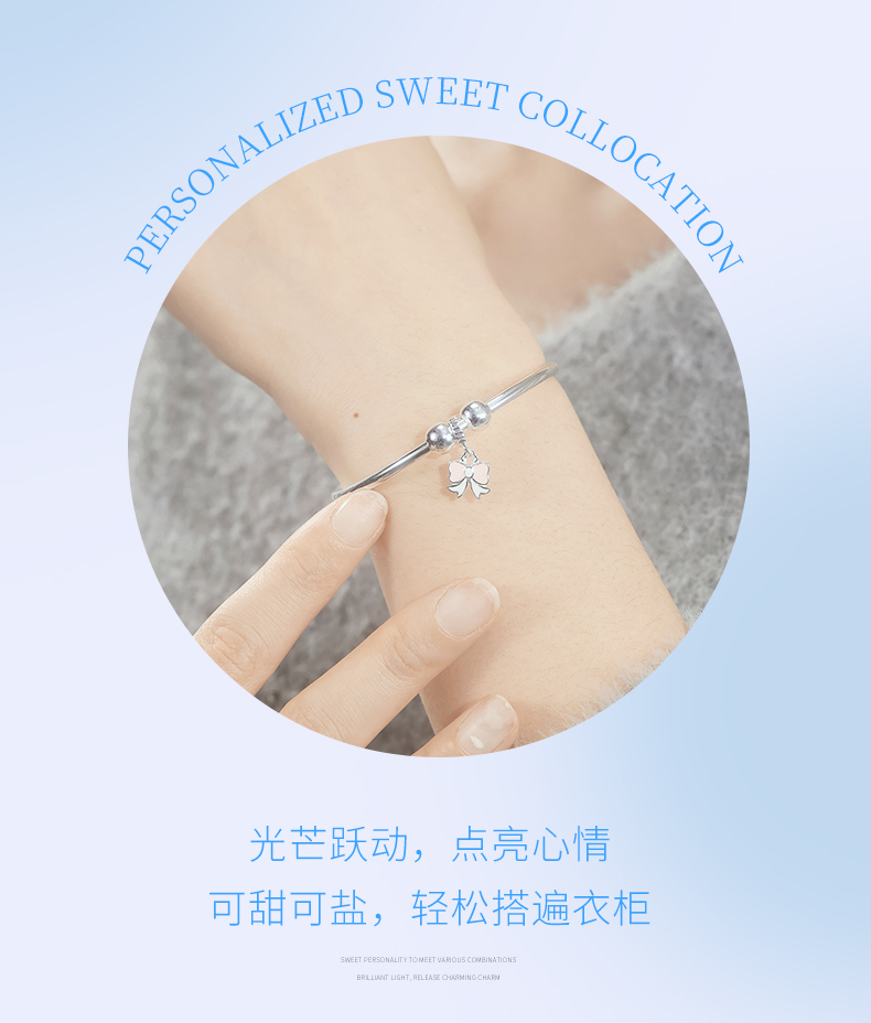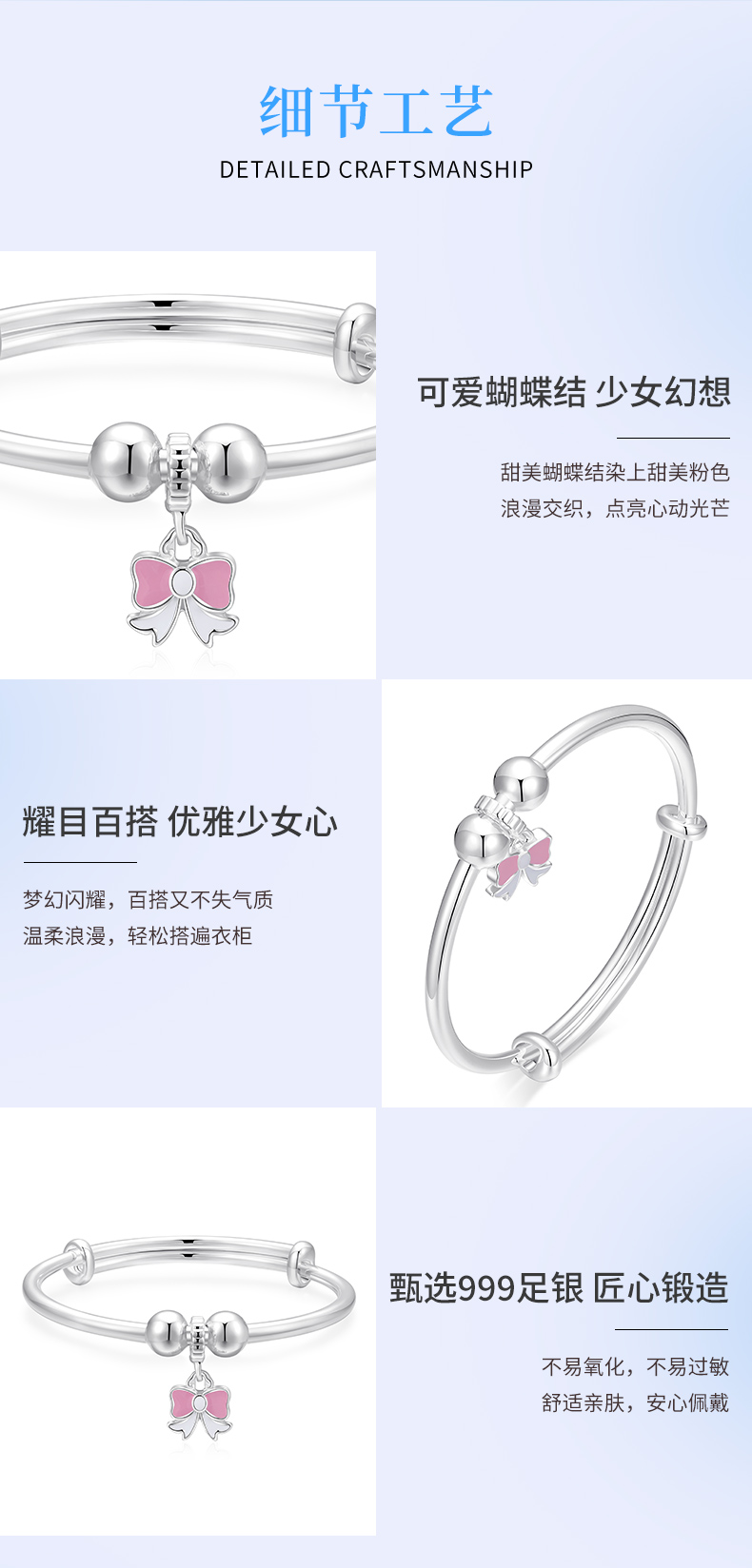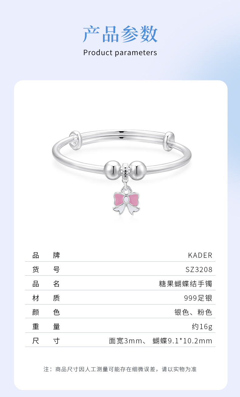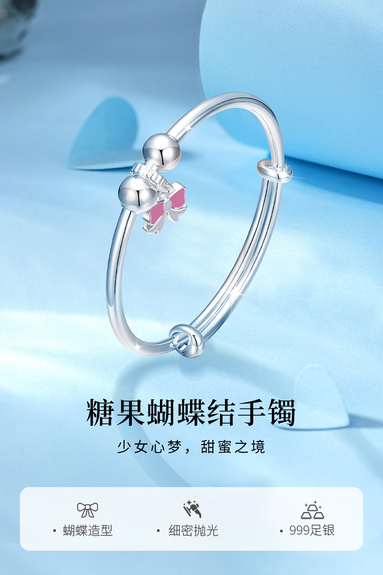 卡蒂罗/KADER 糖果蝴蝶结实心银镯 在逃公主童话风 转运珠甜美可爱粉色丝带结轻奢时尚开口可调节手饰