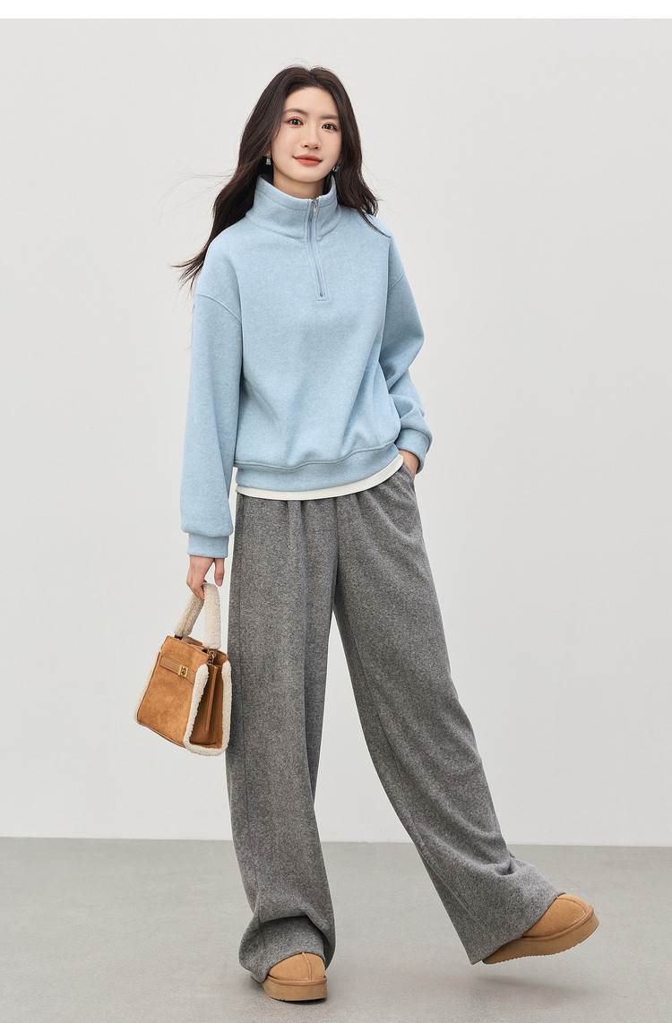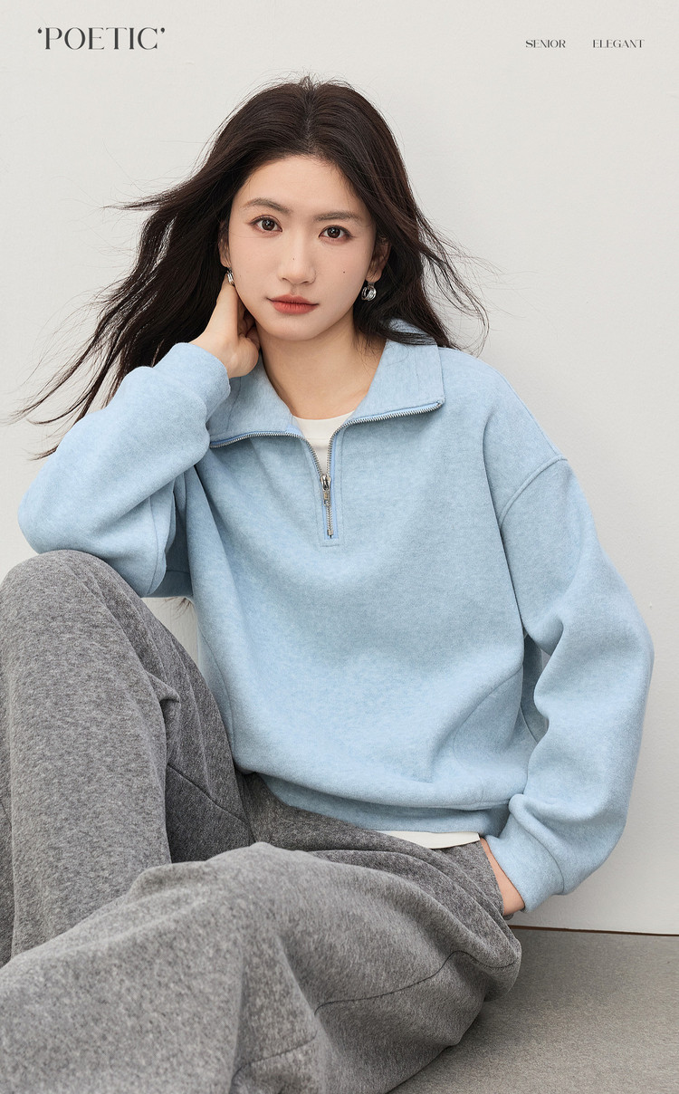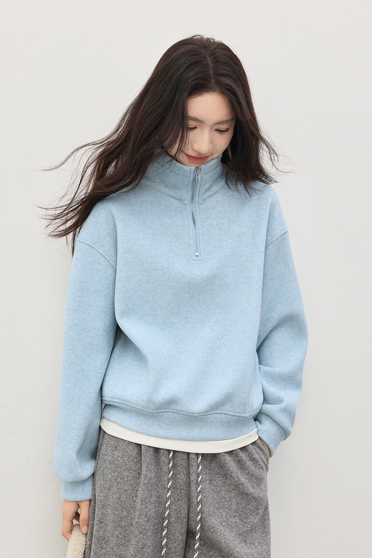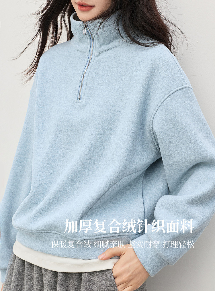 【1/21新品】熙世界盐系蓝色半拉链立领卫衣女加绒加厚秋冬运动风宽松休闲上衣