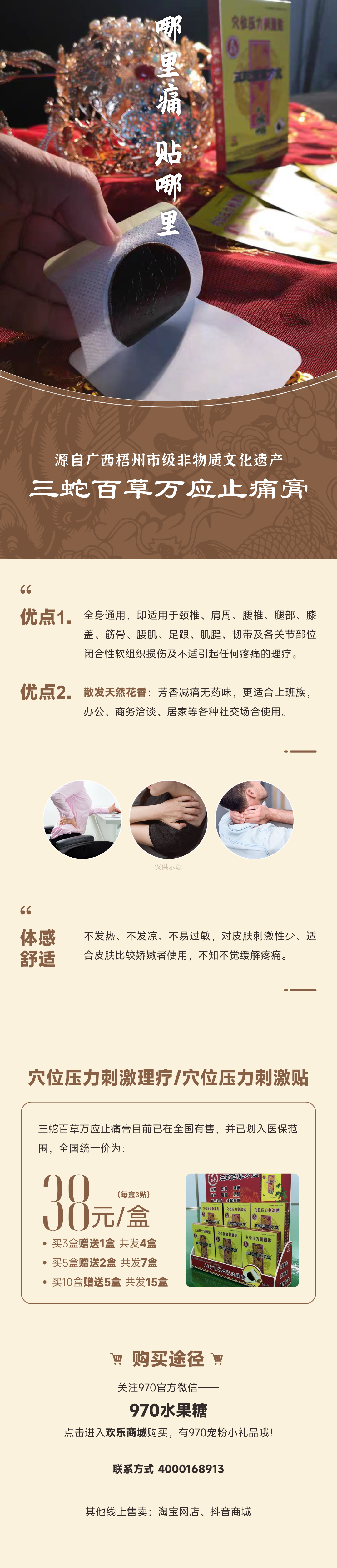 1、源自于广西梧州市非物质文化遗产三蛇百草万应止痛膏;