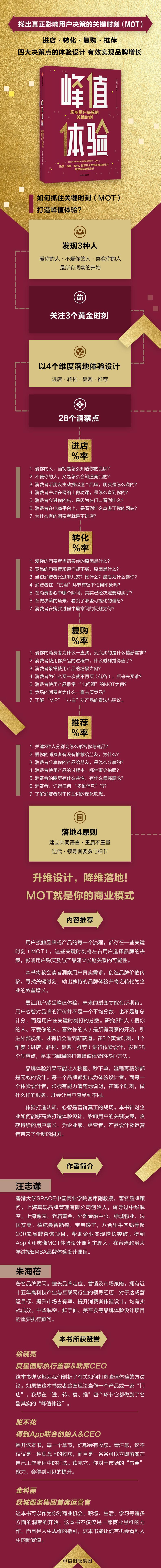 生活中我们时常会碰到一种情况,陪孩子或家人在游乐园坐过山车往往需要排队,而且很可能是一到两个小时的漫长时光,但终玩儿的时间只不过一两分钟。然而在这个过程中,我们大只会对从往下俯冲的刺激以及终结束时产生的兴奋感记忆犹新,于之前排队的事情可能早就抛之脑后,这其实就是行为经济学丹尼尔 · 卡尼曼所说的“峰终定律”。 作为一名企业管理者,如何利用“峰终定律”来找到影响用户决策的“关键时刻”,创造峰值体验并影响他们的购买行为和消费决策,进而帮助公司提升业绩是我一直在思考的问题。前不久获赠汪老师新书《峰值体验》,承蒙抬爱让我为书 作序,实不敢当,然盛情难却,只好硬着头皮应了下来。一本深入浅出、鞭辟入里又不乏很多生动案例的佳作,一气读完, 感慨良多。 书中,汪老师用“一见就进、一进就买、一买再买、一传千里”来形容一个完整且成功的品牌营销流程,这背后其实就是商业运营非常关注的进店率、转化率、复购率和推荐率的问题,每个环节有 MOT(关键时刻),能影响到用户的决策,而企业要做的就是了解“爱你的人、不爱你的人和喜欢你的人”,进而找到 MOT,从核心用户圈层(BTA)出发打透打穿,即“以 1 厘米的直径打到 1 万米的深度”,终影响更多的目标受众,完成一整套营销流程。从洞察到落地,书中详尽地为我们剖析了有关如何打造峰值体验的方法论。如果把这本书或者这套理论当作一个产品或一家“门店”,我想在“进、转、复、推”四个环节它做到了名副其实的“峰值体验”。 首先,一眼看到这本书的名字就足够抓人眼球,特别是“影响用户决策的关键时刻”直接点中所有管理者在企业经营尤其是用户经营上的痛点。的确,当下的社会信息传递极快,更新频率,用户每天在接受无数的信息,没办法对每一条信息做出及时的反馈,企业和品牌在日常经营的过程中如何用少的信息在关键的时刻精准地触达用户,并且左右用户的决策是一个巨大的考验。复星作为一家布局全球的家庭消费产业集团,旗下有非常多 To C 的消费品,我们太需要有专业的人告诉我们如何为用户经营破题,如何让流量成为留量并形成裂变,所以说封面短短几个字就足以让我“一见就进”。 何为“一进就买”?也就是品牌或商家如何用 7 秒让好不容易进到门店或网店的用户感受到这个产品如何优秀,并逐步信任。这里面的“套路”就显得重要,而套路的背后蕴含着很多心理学、行为经济学的理论基础,比如“锚定效应”“禀赋效应”等等。那么这本书以及背后的这套理论是怎么做到让人“一进就买”的?答案是成功的实践案例,华航经过一番针对峰值的体验设计后,一年后净利润扭亏为盈,增长 10 倍,这样的体验设计案例在书中不胜枚举。正因为有这些成功的案例参照,我们和汪老师合作进行体验设计,也就有了后来老庙景容楼的精彩“重生”。 现在的景容楼已经成为老庙的文化旗舰店,五运门、黄金树、黄金广场成为上海豫园的网红打卡地,很多人逛完景容楼自发地将其称为“好运楼”,正如书中所言“广告语我们一个字没有写,但好运这个信息已经进入消费者的内心”。这正是我们所需要的咨询服务,在这次合作中我们形成了对峰值体验设计理论的一个认知——“这钱花得值”。正因如此,BFC(外滩金融中心)的同学们在汪老师的带领下一起寻找到了属于BFC 用户的“MOT”,在一次成功的合作后,BFC 和真观在 2020 年展开了跨全年度的二次合作,这不就是“一买再买”吗? 而在“进店、转化、复购”三个环节有了成功的峰值体验后,“一传千里”水到渠成。 未来我们会继续借鉴学习这一套理论,更好地帮助我们服务用户,让全球每个家庭生活更幸福。 我也相信,《峰值体验》一书正式出版后,也会“一传千里”,让更多企业受益,为更多用户提供更好的峰值体验!