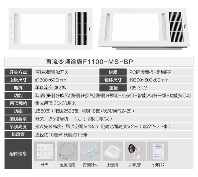 欧普(OPPLE)恒温风暖浴霸灯取暖浴室排气扇一体F1100集成吊顶卫生间暖风机F1200