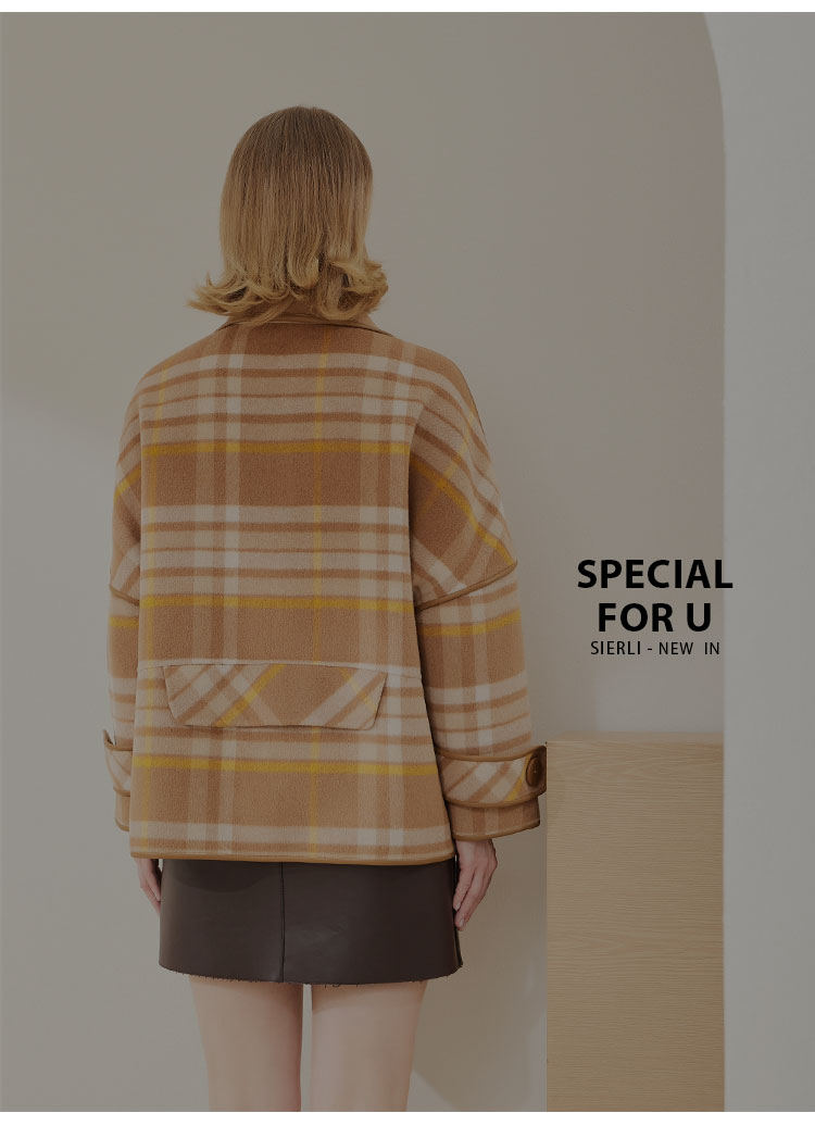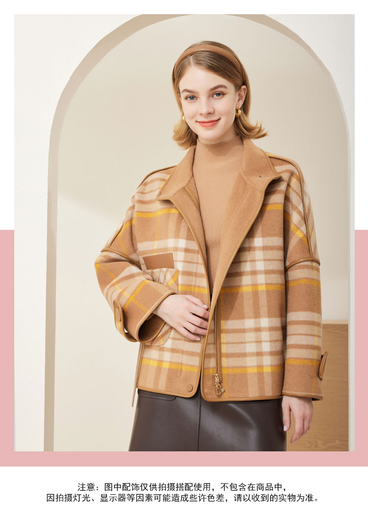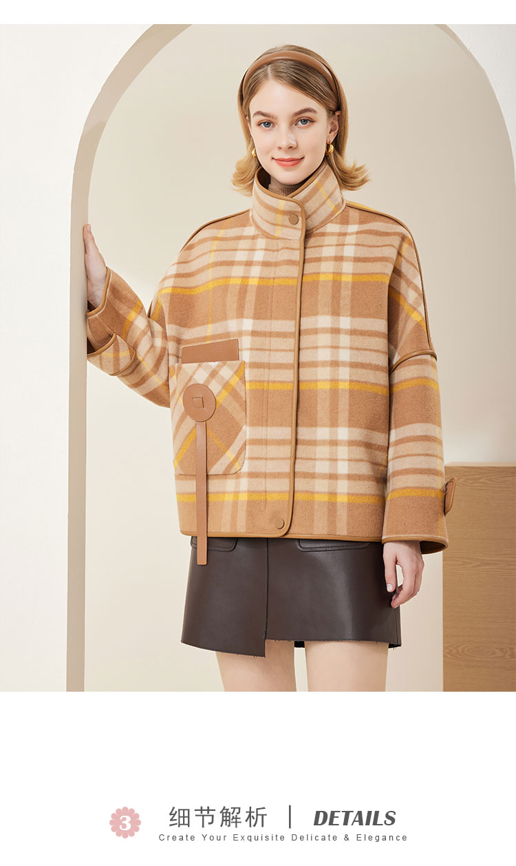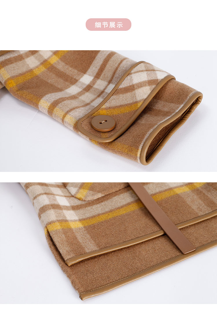 MD920斯尔丽瑟俪2022年冬季新品格子配色拼皮边外套夹克大衣