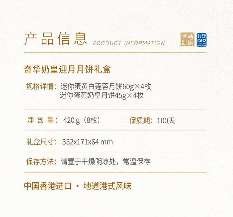 【一件包邮】奇华奶皇迎月月饼420g 奶香咸香椰香莲香 甘肃/青海/内蒙古/新疆/西藏/宁夏/海南/港澳台不发货