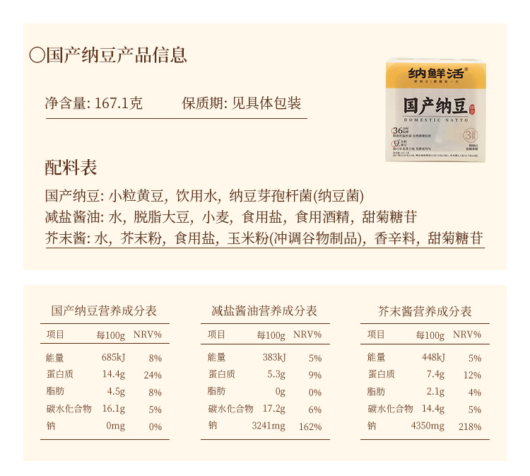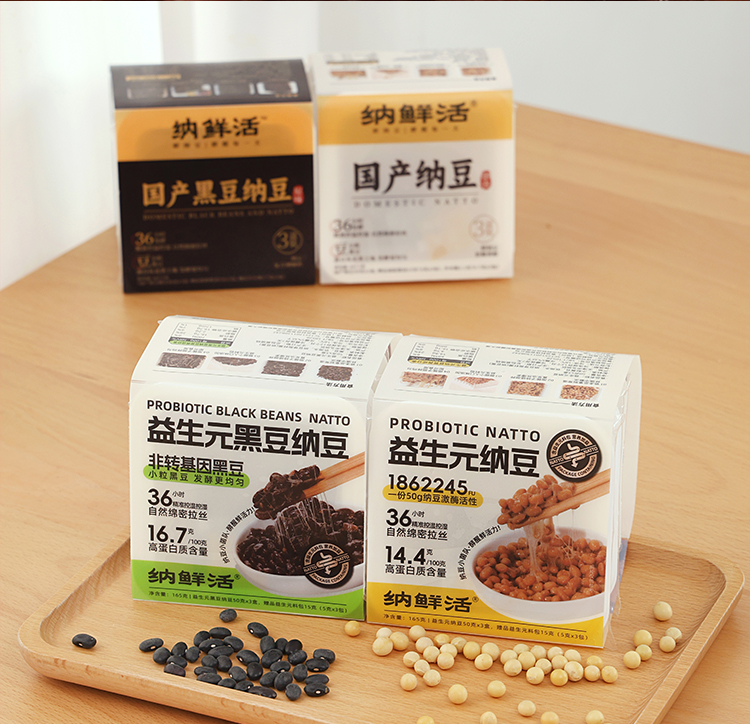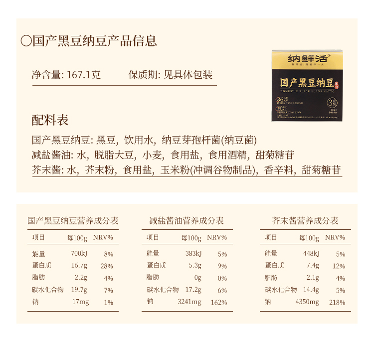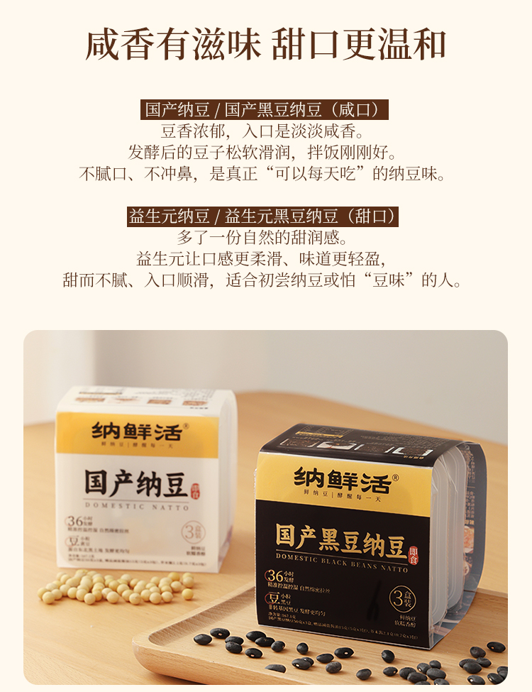 纳鲜活 国产纳豆&国产黑豆纳豆50g*3盒,赠品减盐酱油15g(5g*3包) 芥末酱2.1g(0.7g*3包))