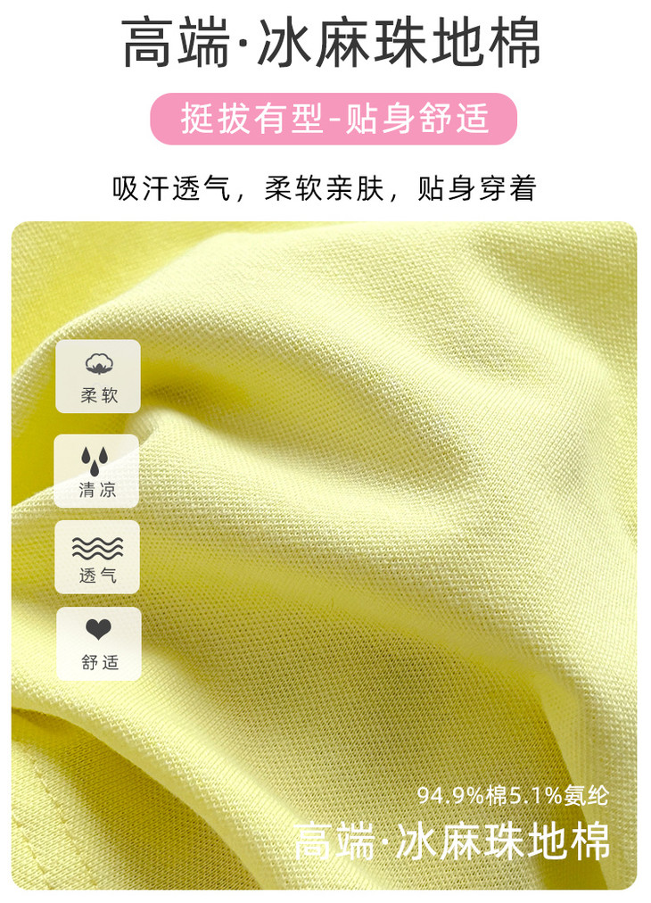 94.9% 的棉与 5.1% 氨纶完美配比,柔软度拉满,亲肤得不要不要的,宝贝娇嫩肌肤也能自在呼吸。😃 而且它超级吸汗透气,夏日小汗星人也不怕,时刻保持清爽干爽🌬。 摸起来还自带清凉感,炎炎烈日下,穿上就像给身体开了小空调🥶!