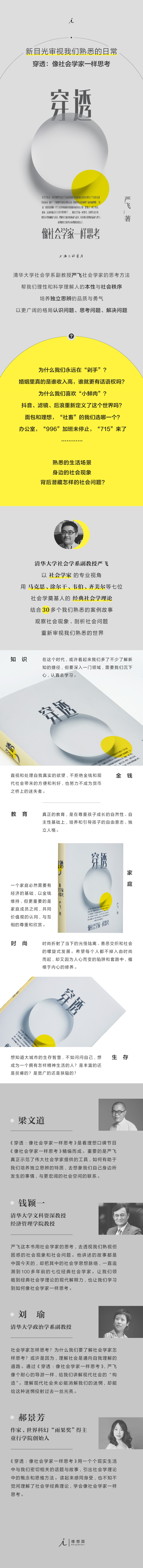 严飞的这本书,用社会学家的思考,去透视那些我们熟视但困惑的社会现象和社会问题。他讲述的故事是中国今天的,却把其中的社会学思想脉络,一直追溯到100多年前的七位经典社会学家。这不仅让我们领略到经典社会学理论的现代解释力,也让我们学习到如何像社会学家一样思考。