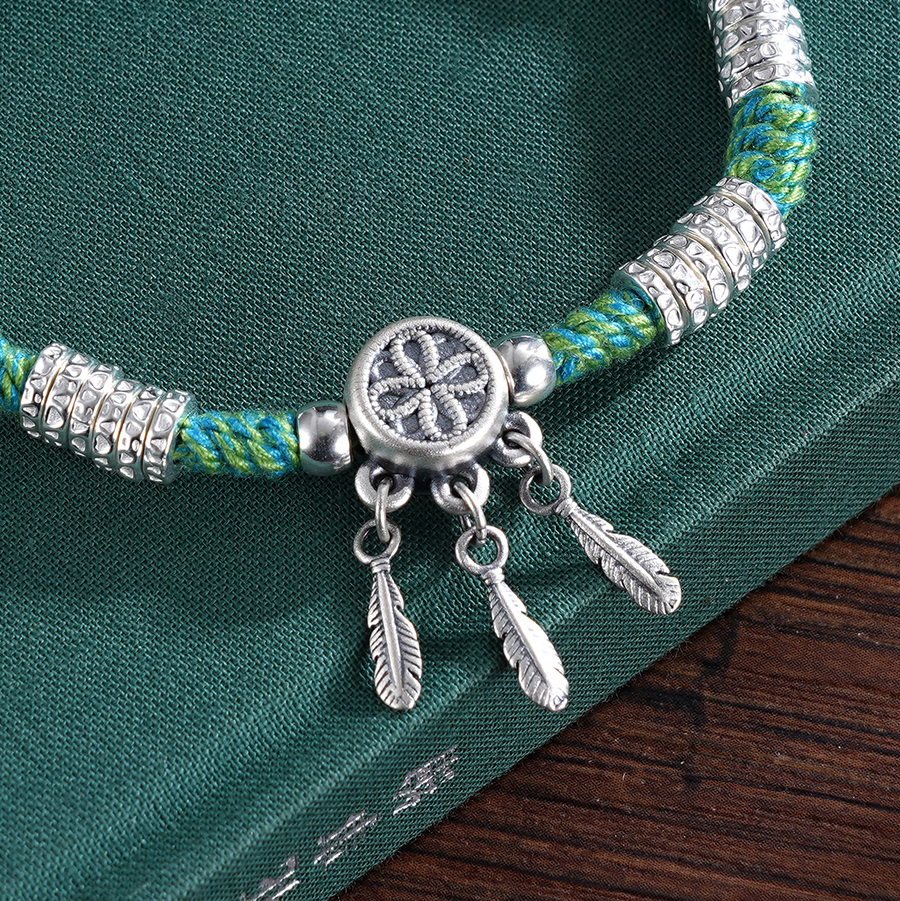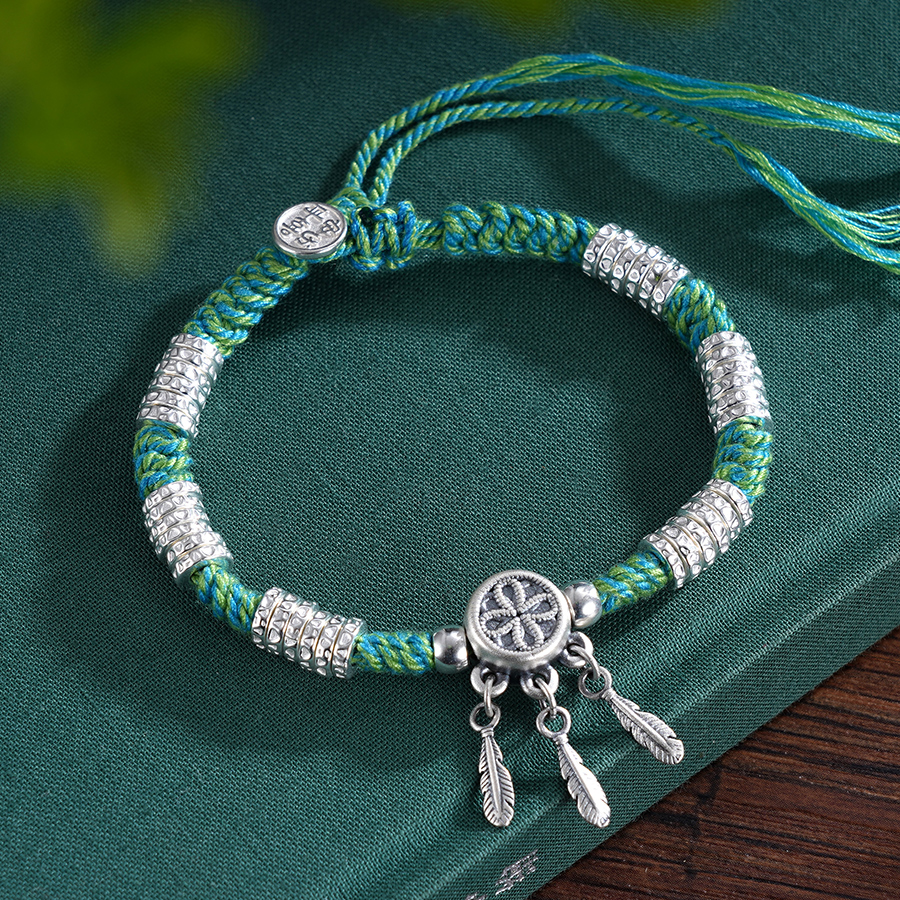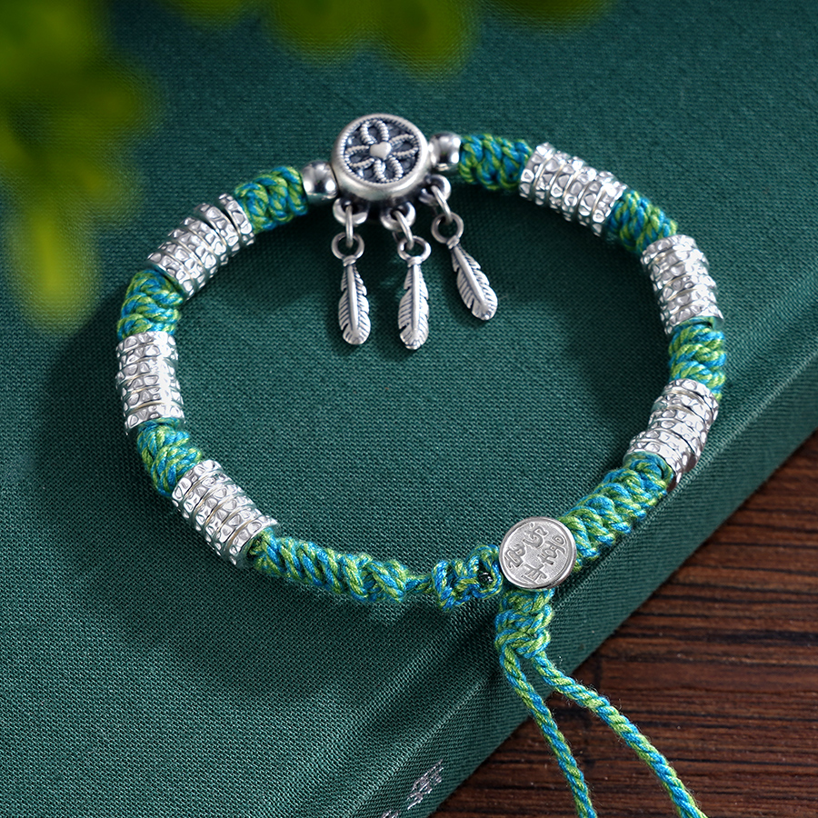 【寓意】:小众设计感盘缠手串,点缀羽毛坠饰。实心锤纹手工银圈搭配彩绳,色泽古朴温润,结实耐用。作品寓意自由与希望。