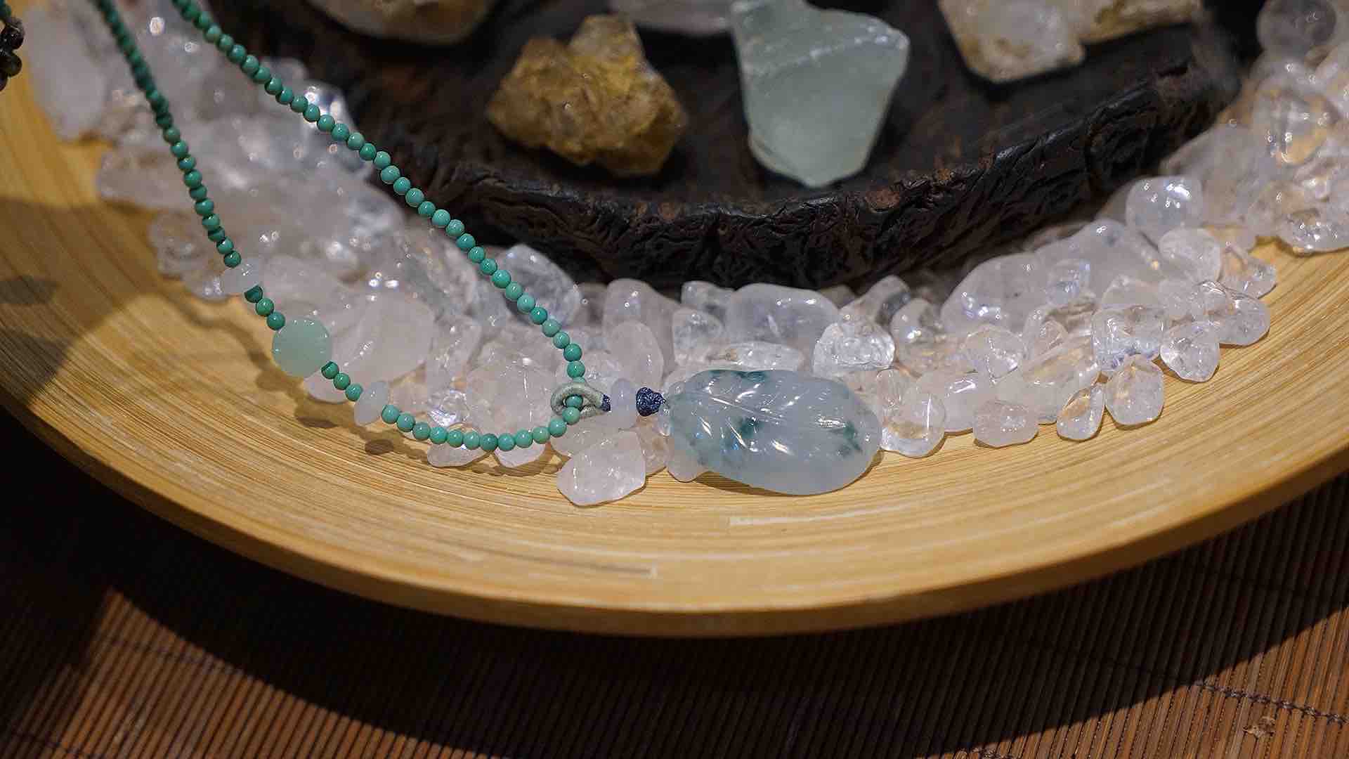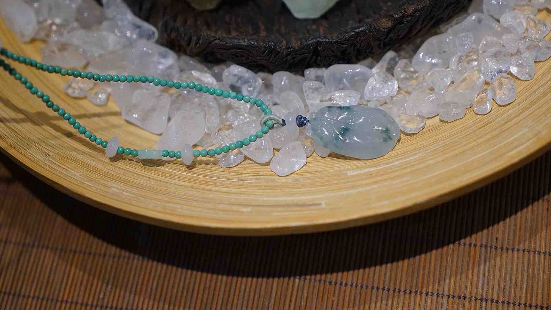 湖北原矿绿松石和冰糯种飘花肥厚的翡翠叶子🤓点缀的配件也是精细挑选,翡翠花朵和飞碟冰翡翠隔片。