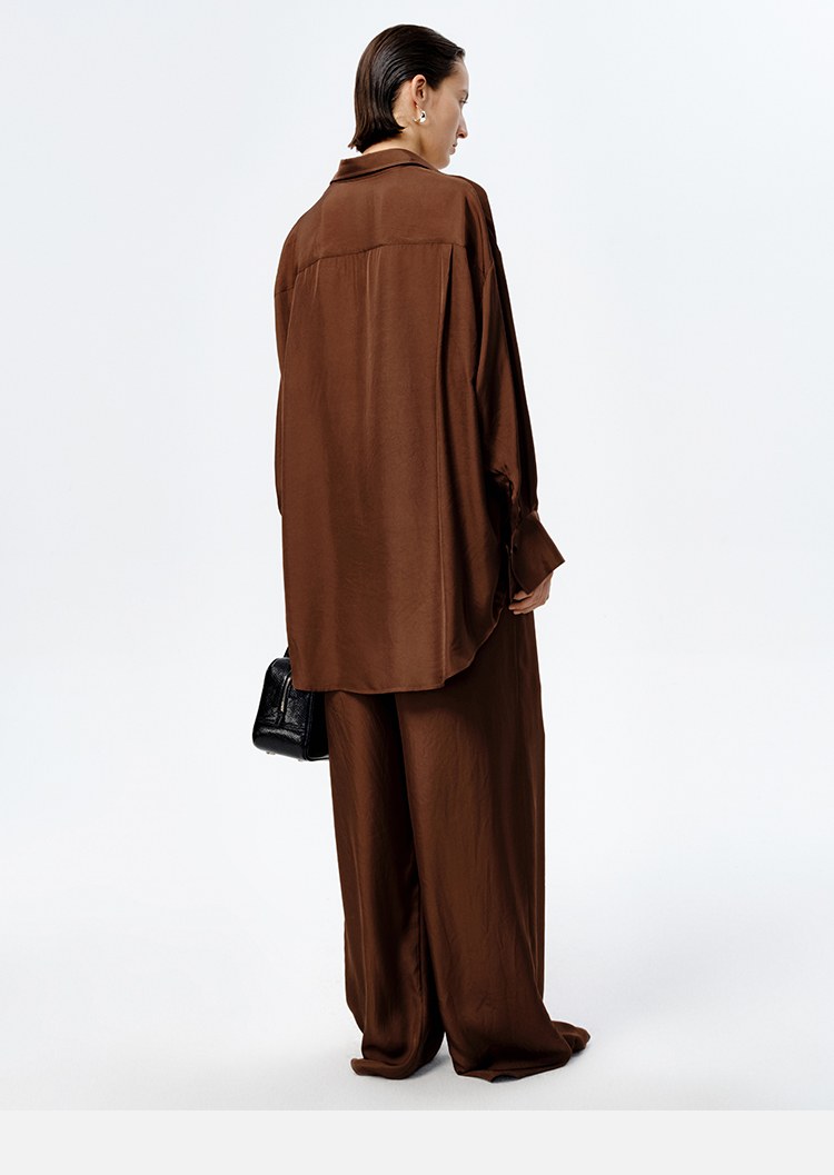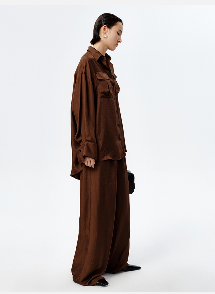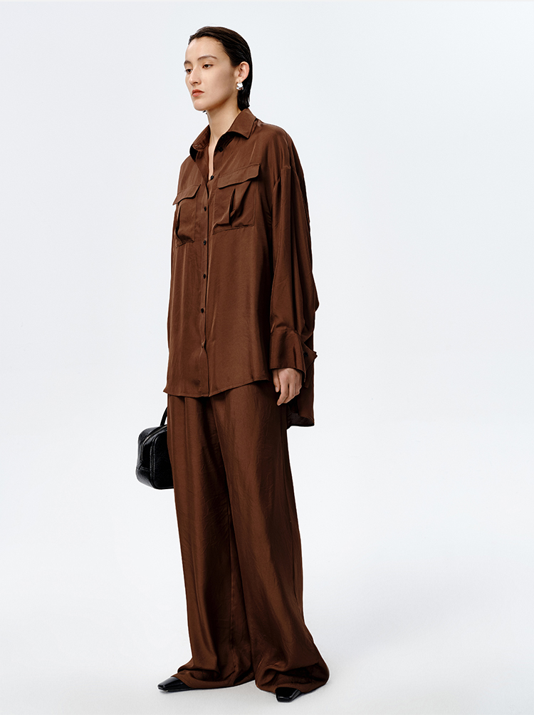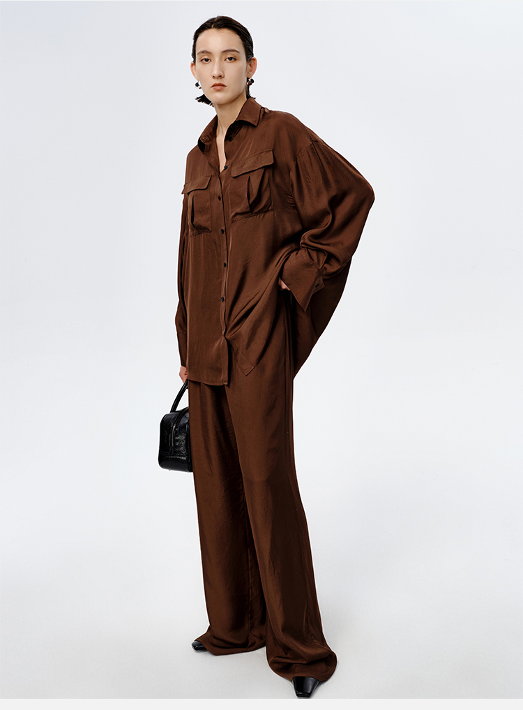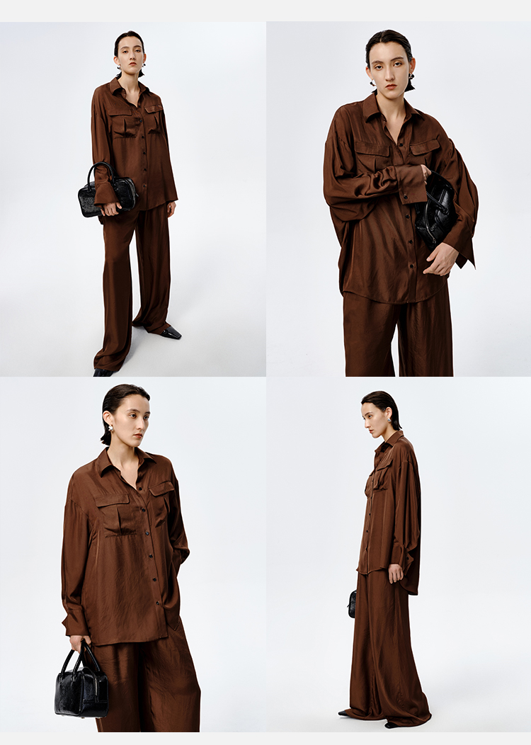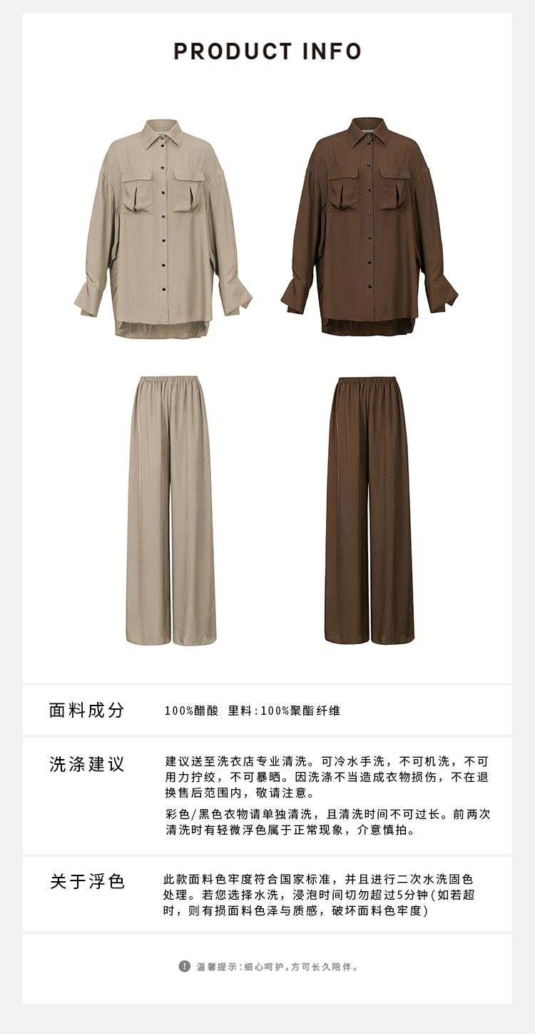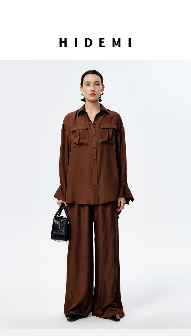 HIDEMI口袋工装感极简大廓形慵懒醋酸套装 衬衫/长裤 巧克力色/香草燕麦