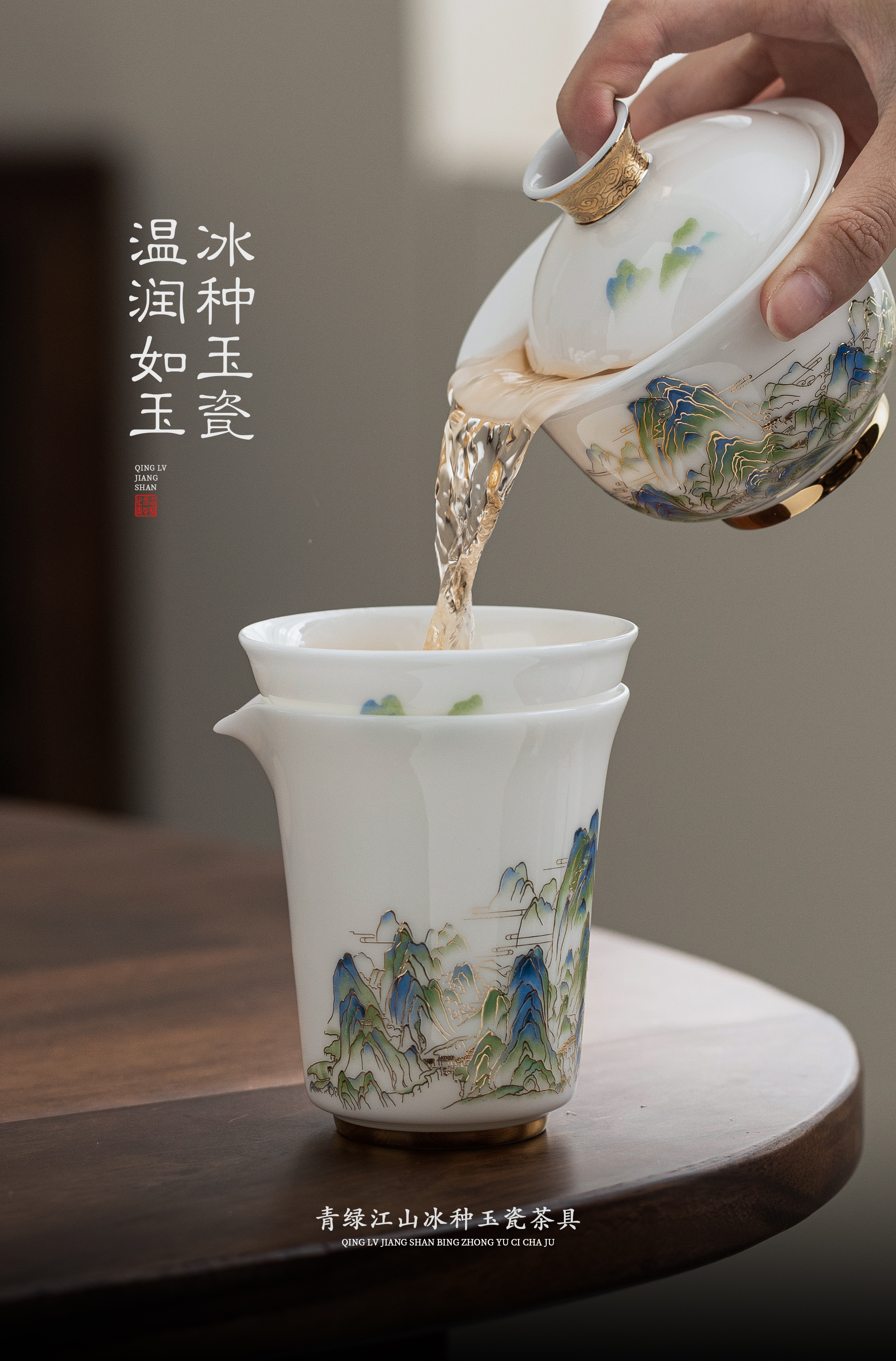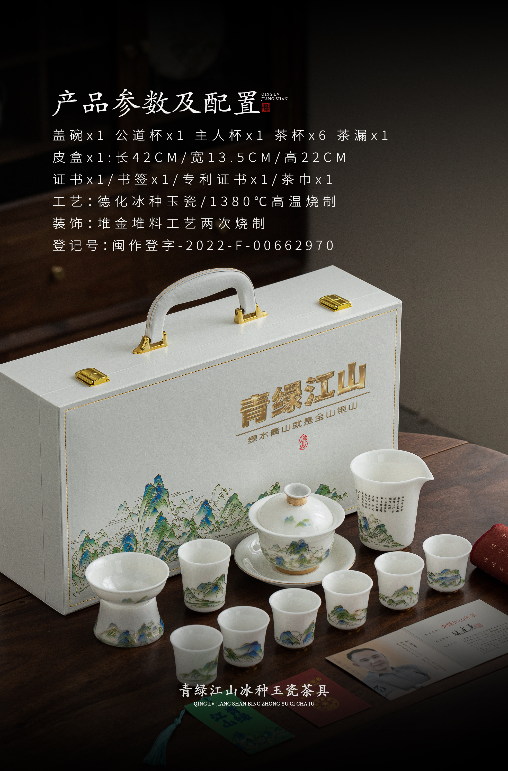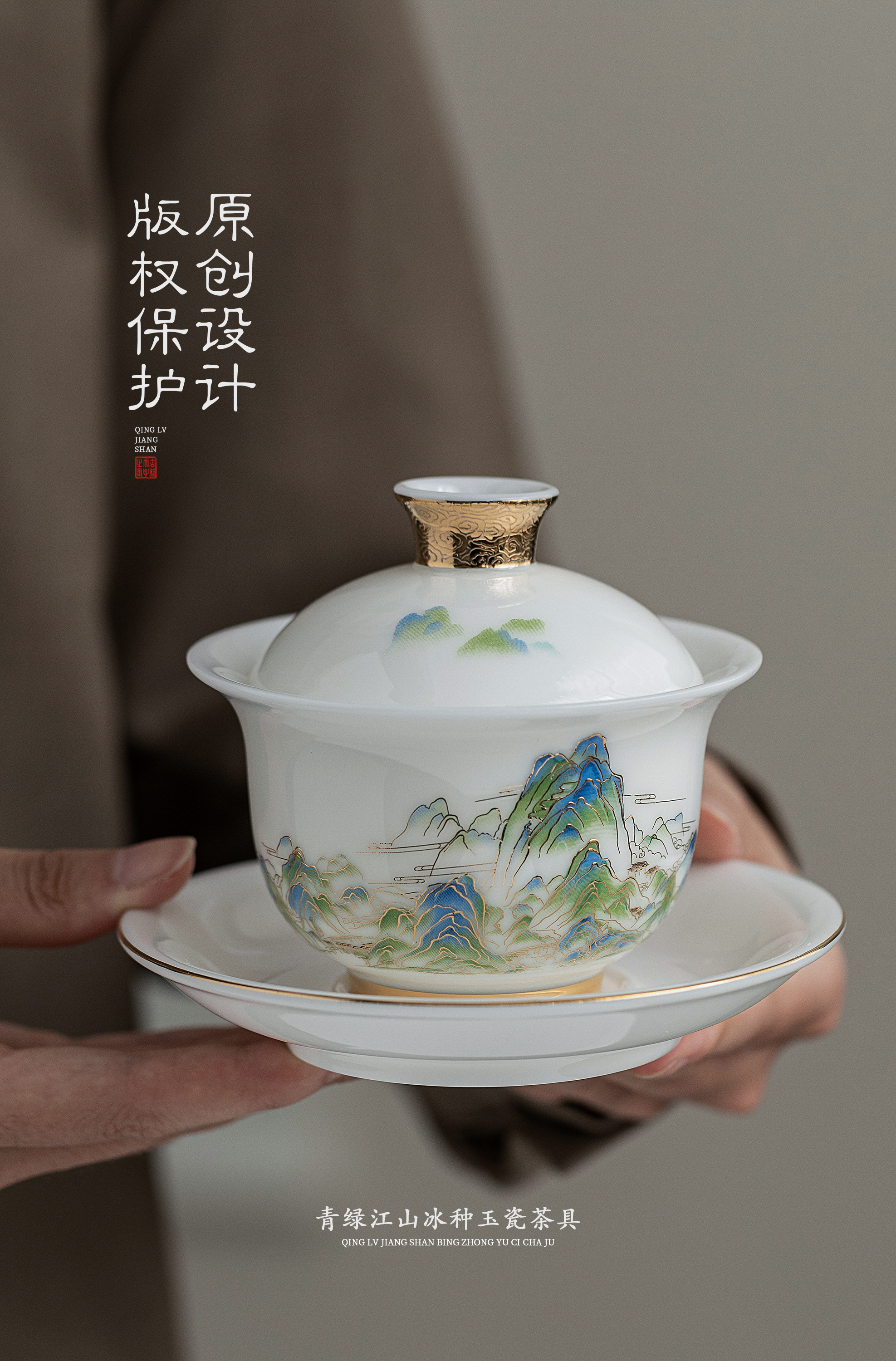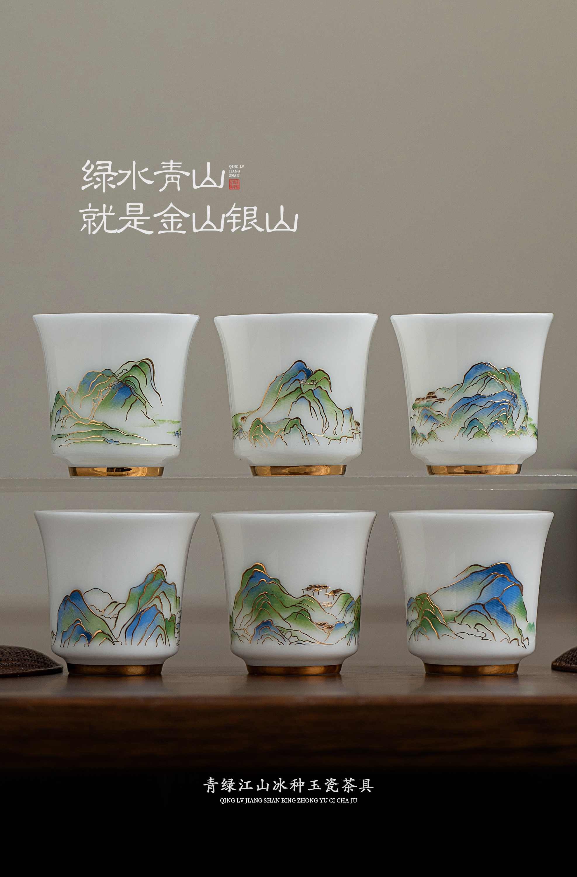 【只此青绿 也只有青绿】青绿江山茶具莲花杯、铃铛杯、禅定杯、圆融杯、水杯三件套,徐建勇老师签章,瓷质温润如玉 迎光透亮,浮雕堆金工艺 触感立体,珍藏品鉴 送礼臻品