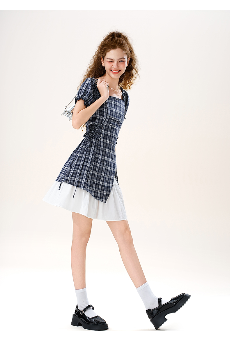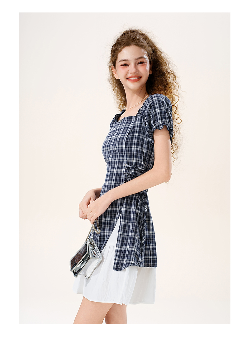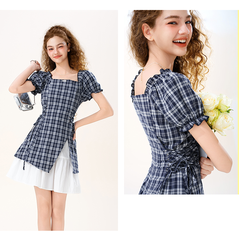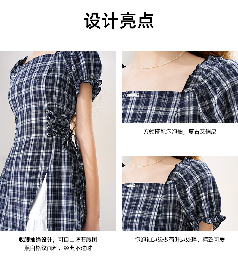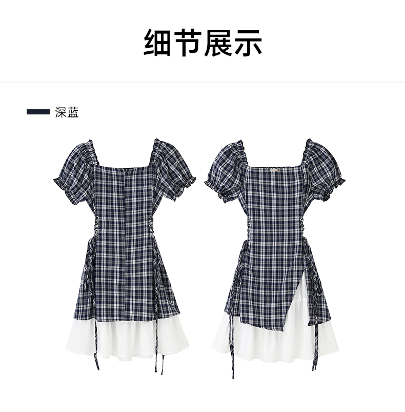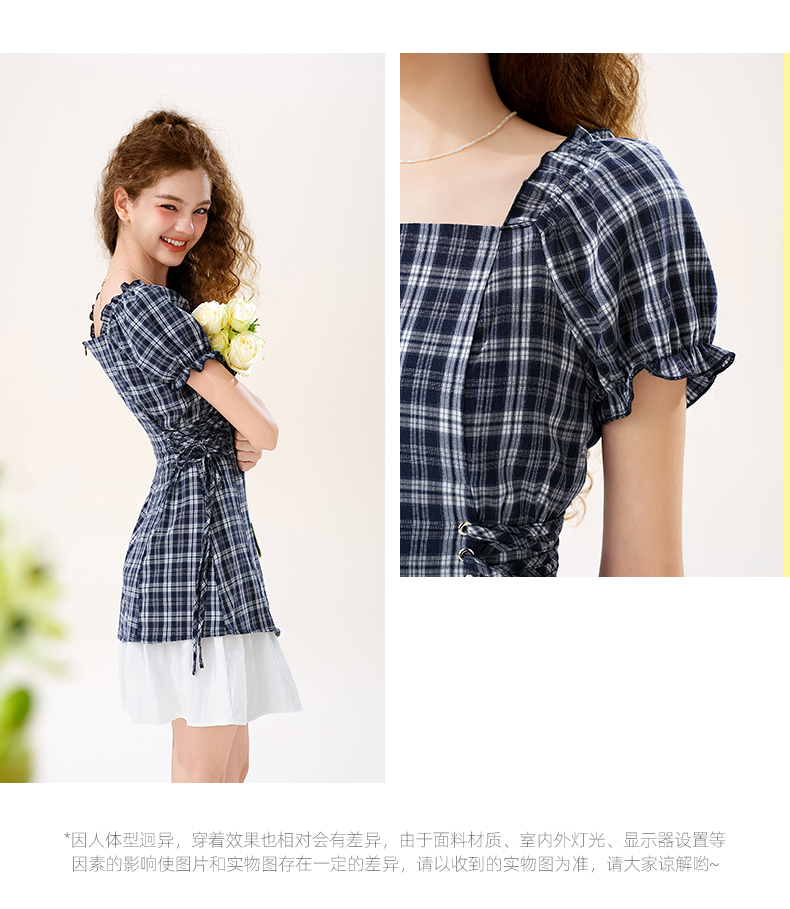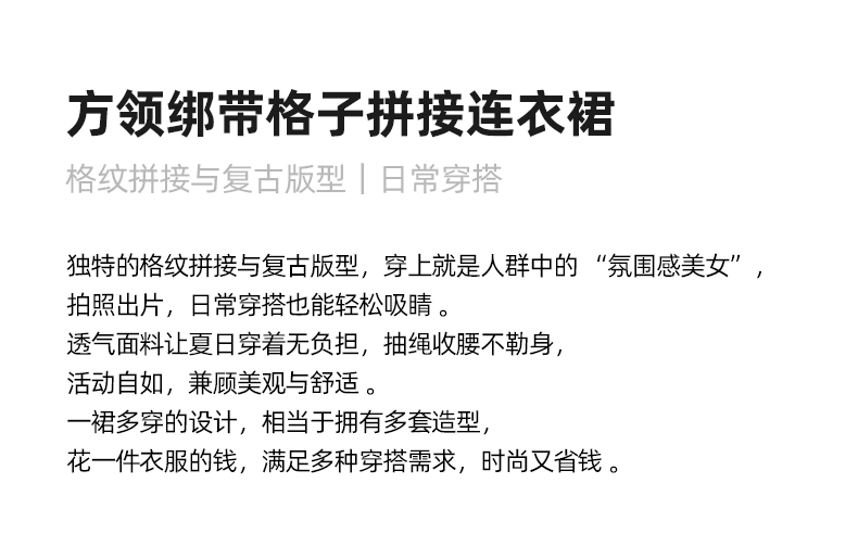mc2女装方领腰节绑带格子拼接连衣裙夏季新款小个子时尚收腰好看