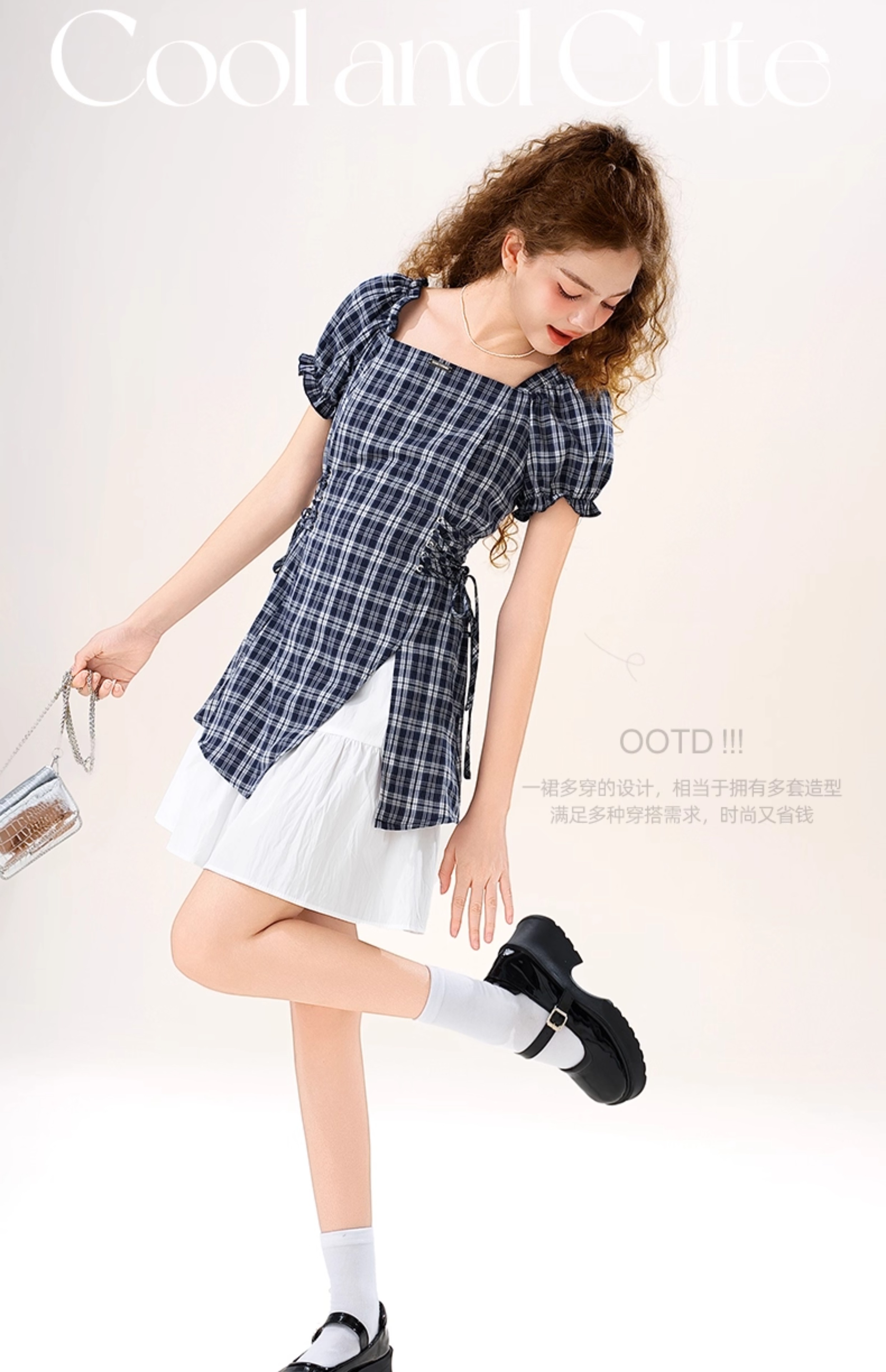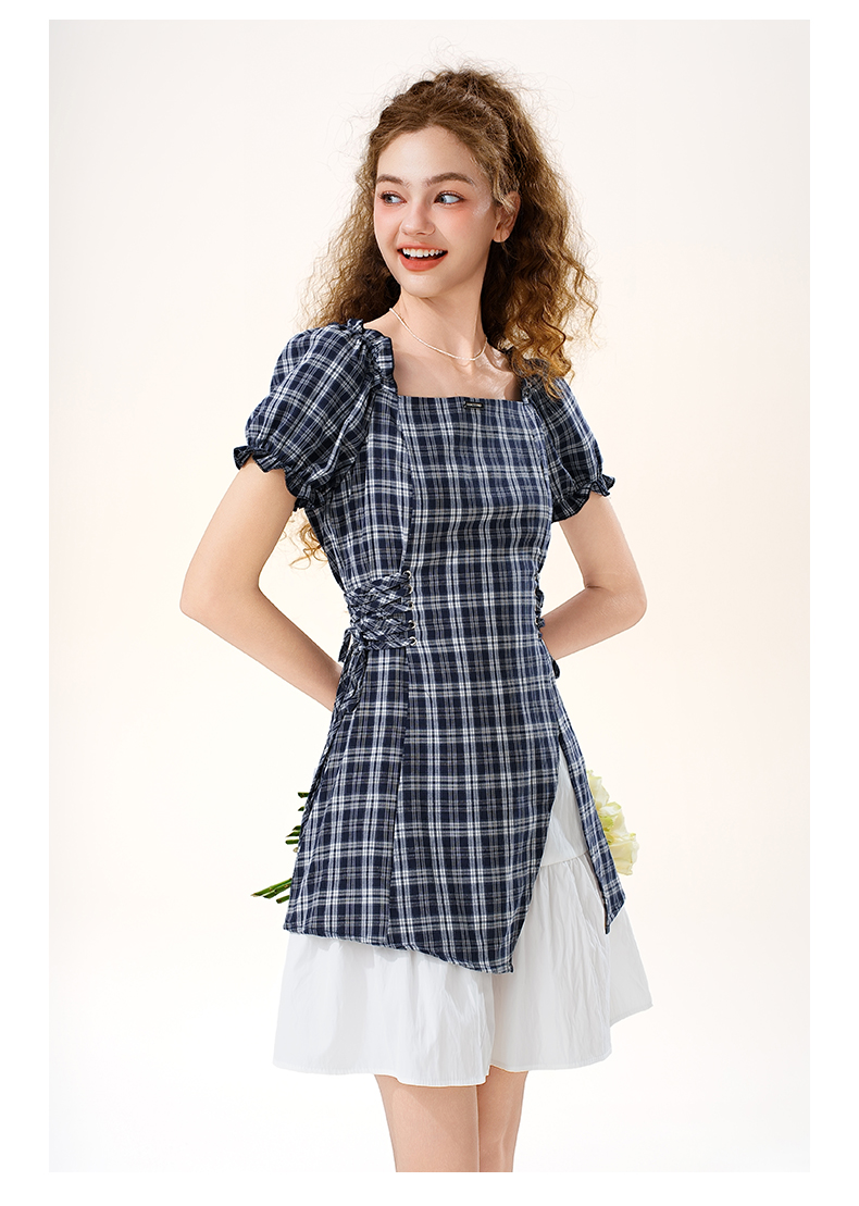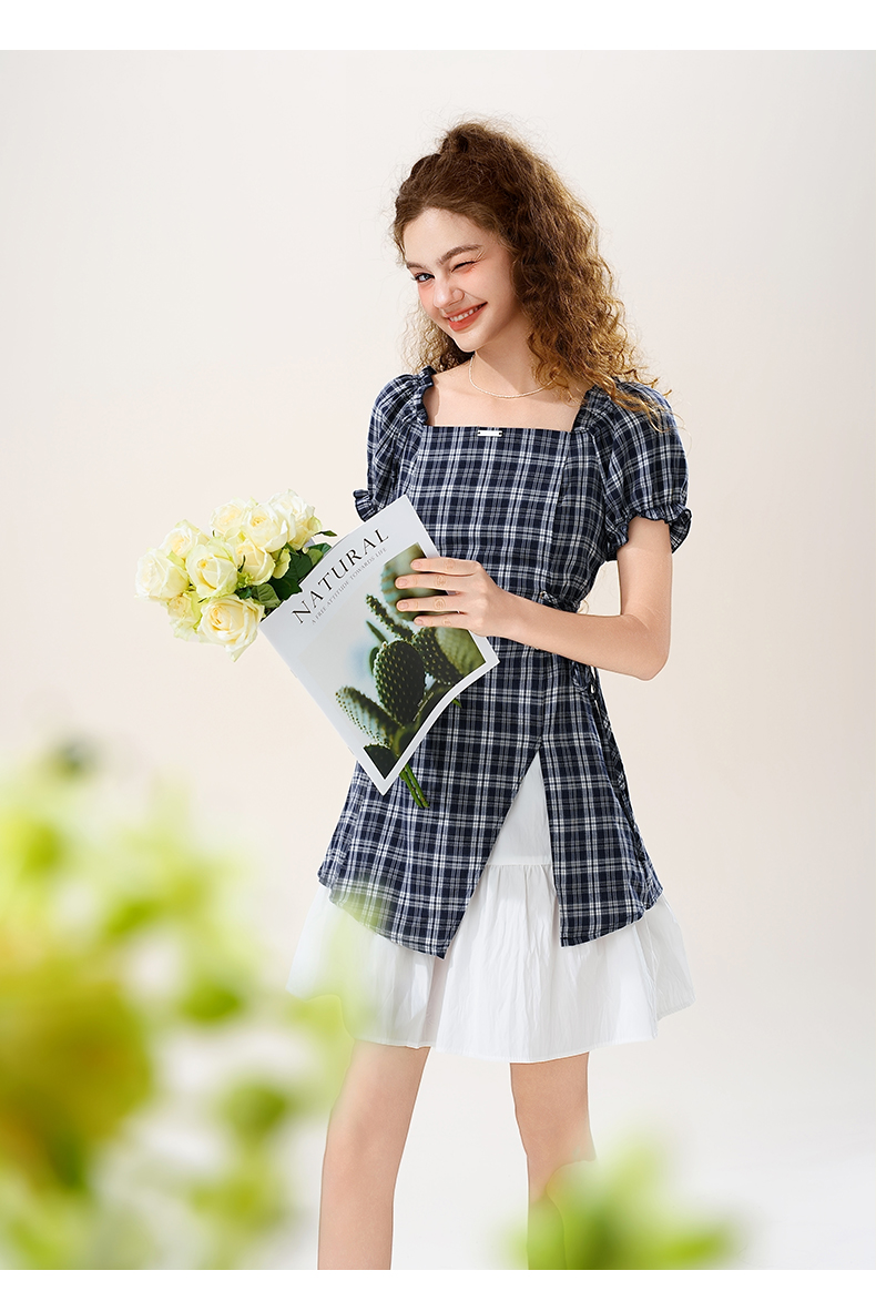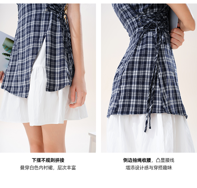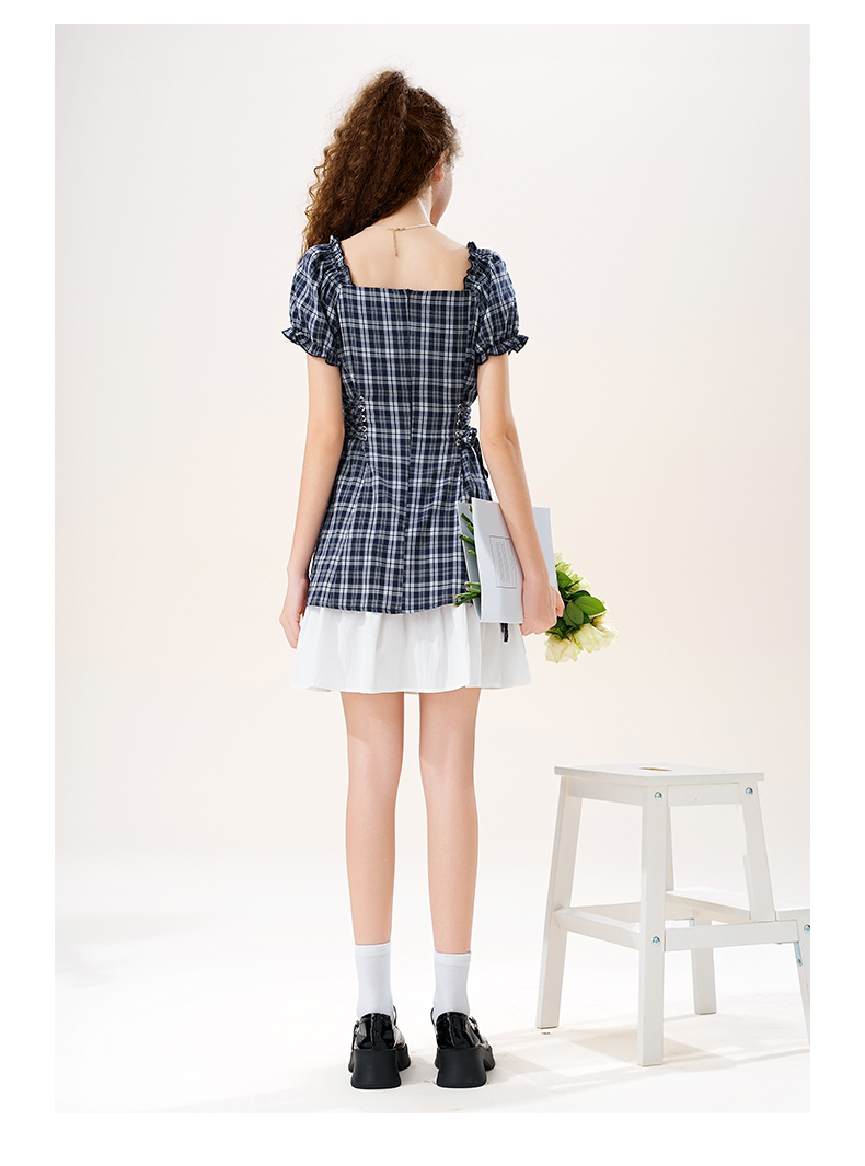 mc2女装方领腰节绑带格子拼接连衣裙夏季新款小个子时尚收腰好看