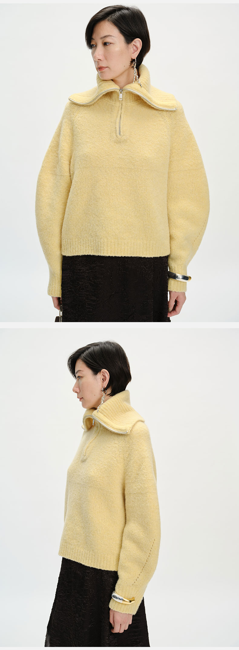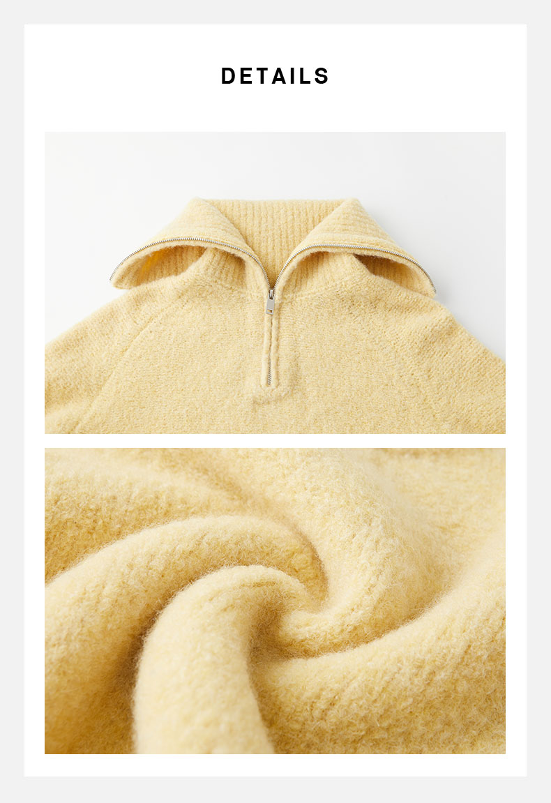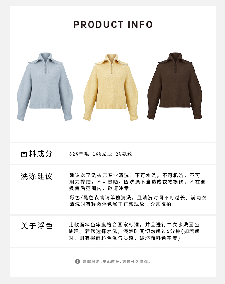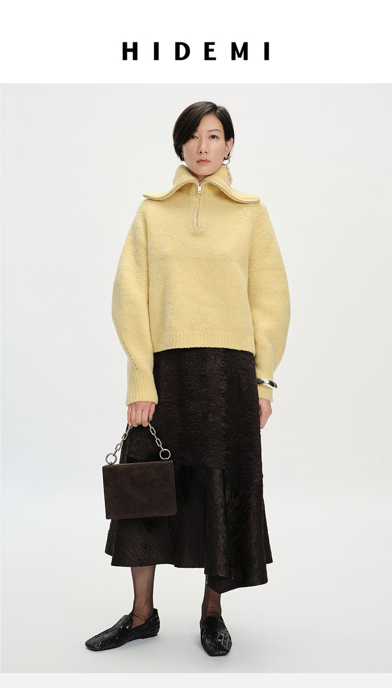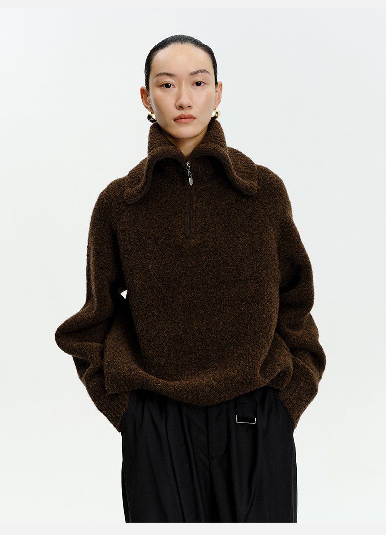HIDEMI 美利奴羊毛缩绒圈圈粗针厚款拉链立领茧型袖毛衣 奶油黄/巧克力色/雾霾蓝