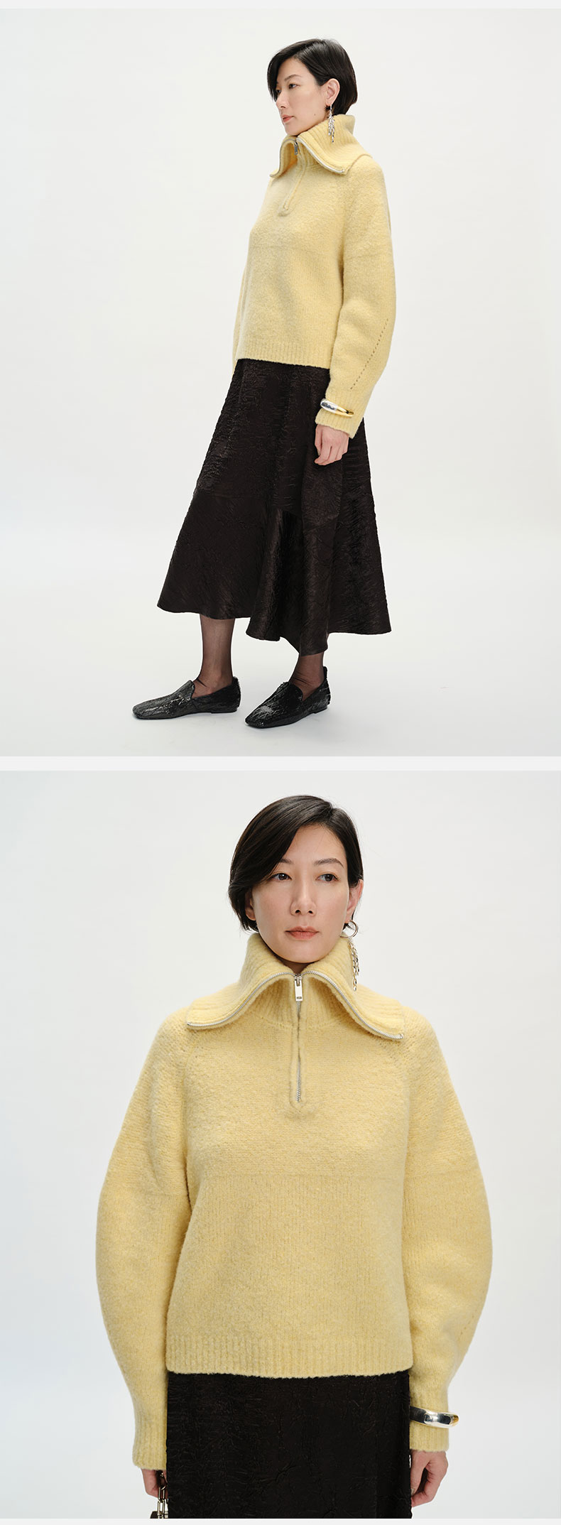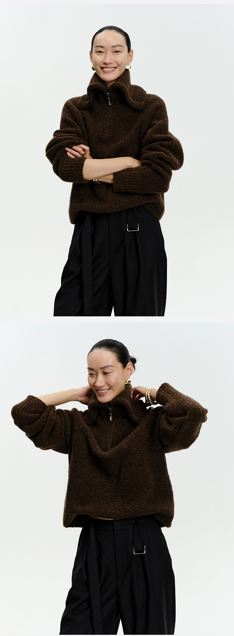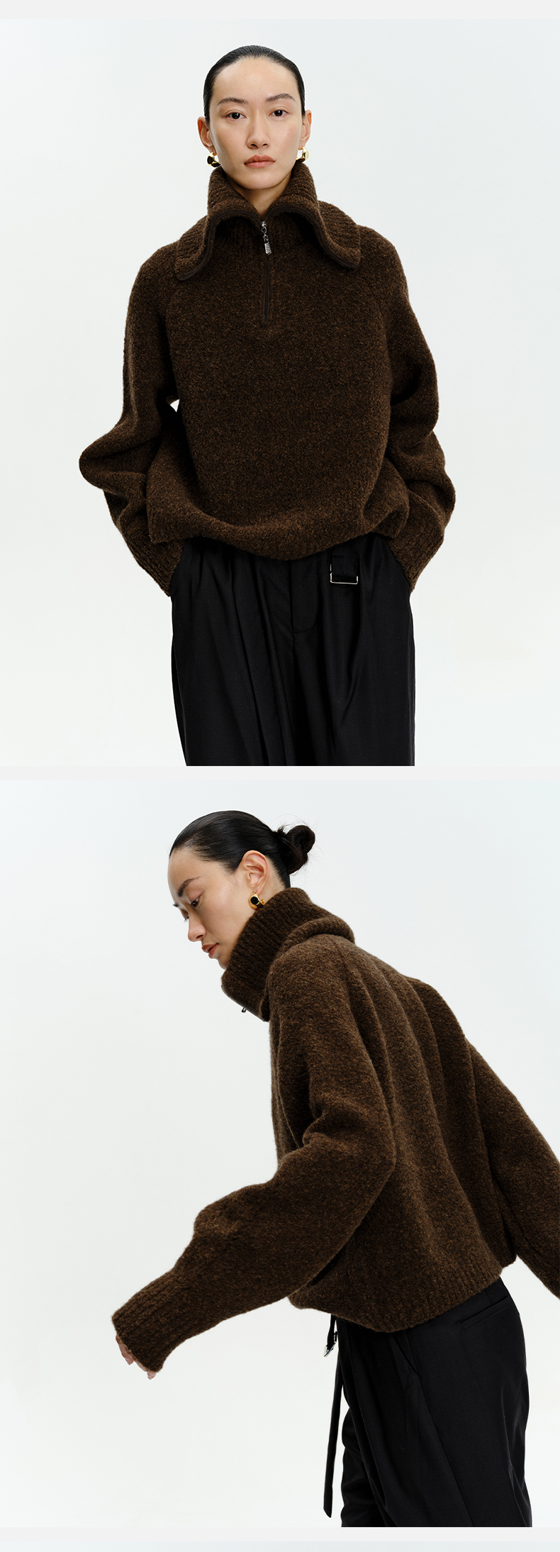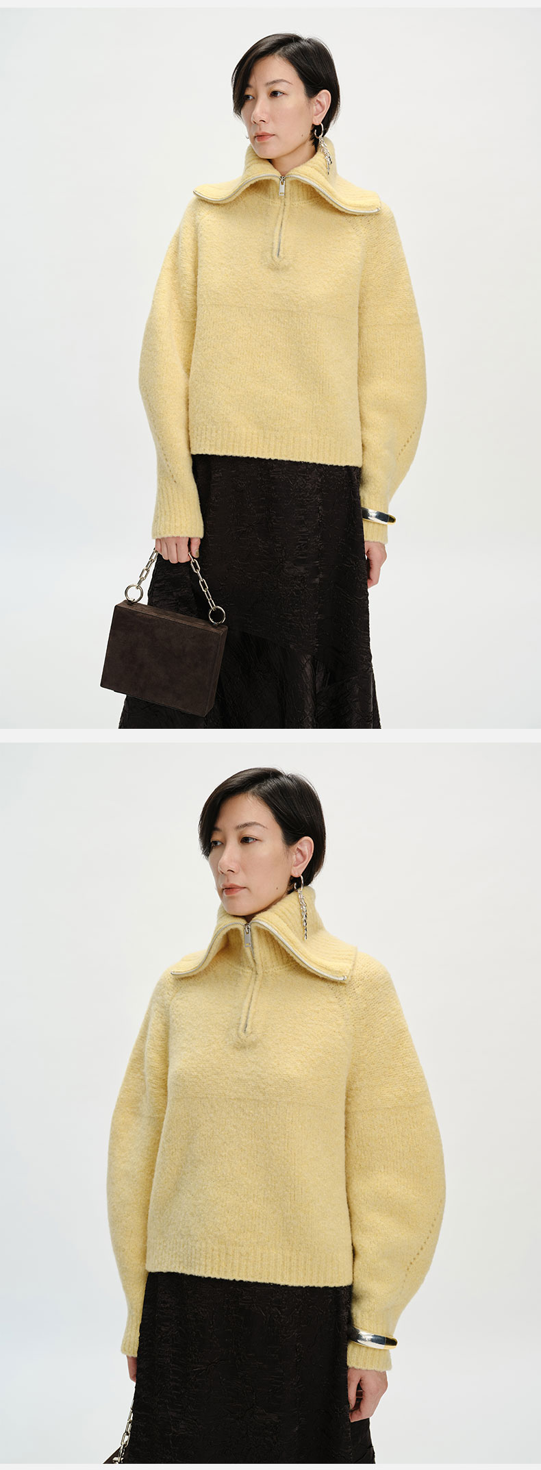 HIDEMI 美利奴羊毛缩绒圈圈粗针厚款拉链立领茧型袖毛衣 奶油黄/巧克力色/雾霾蓝