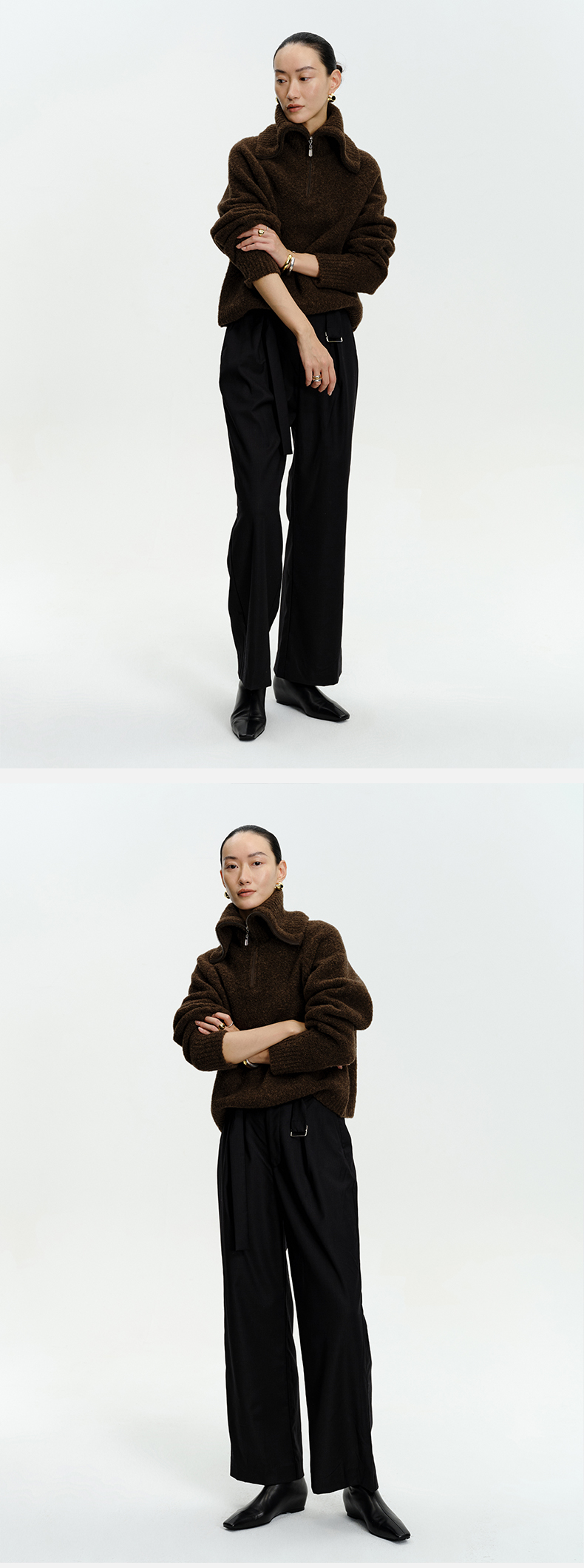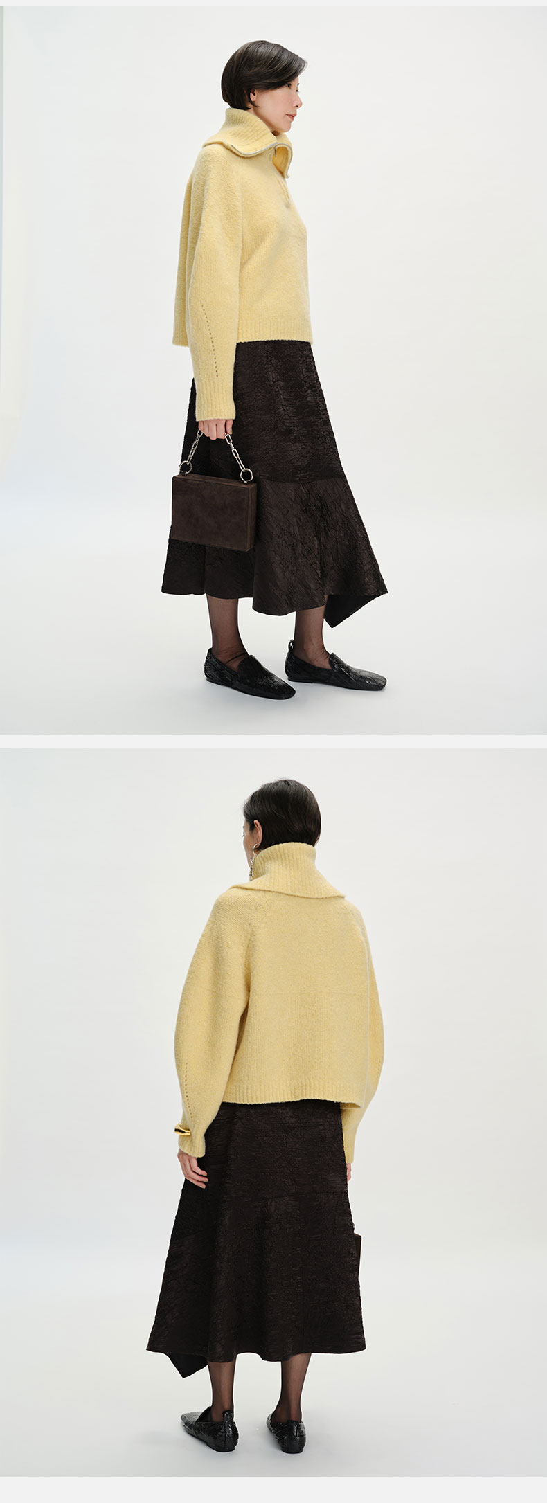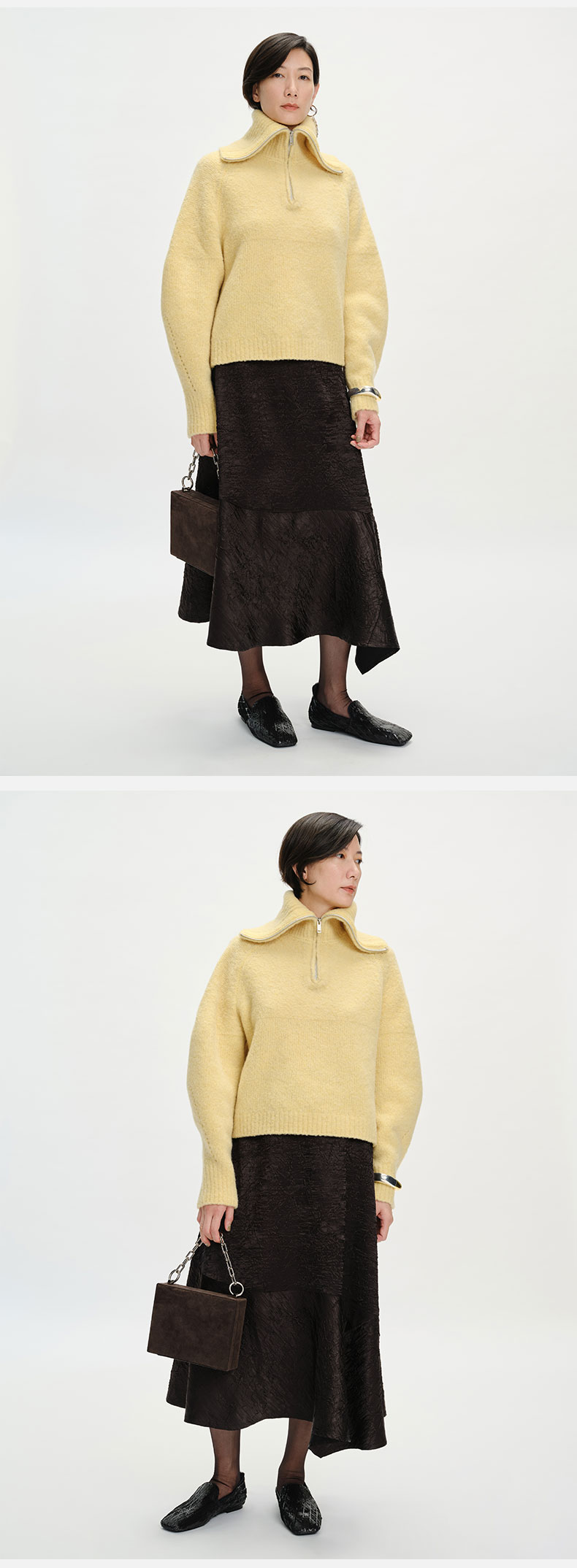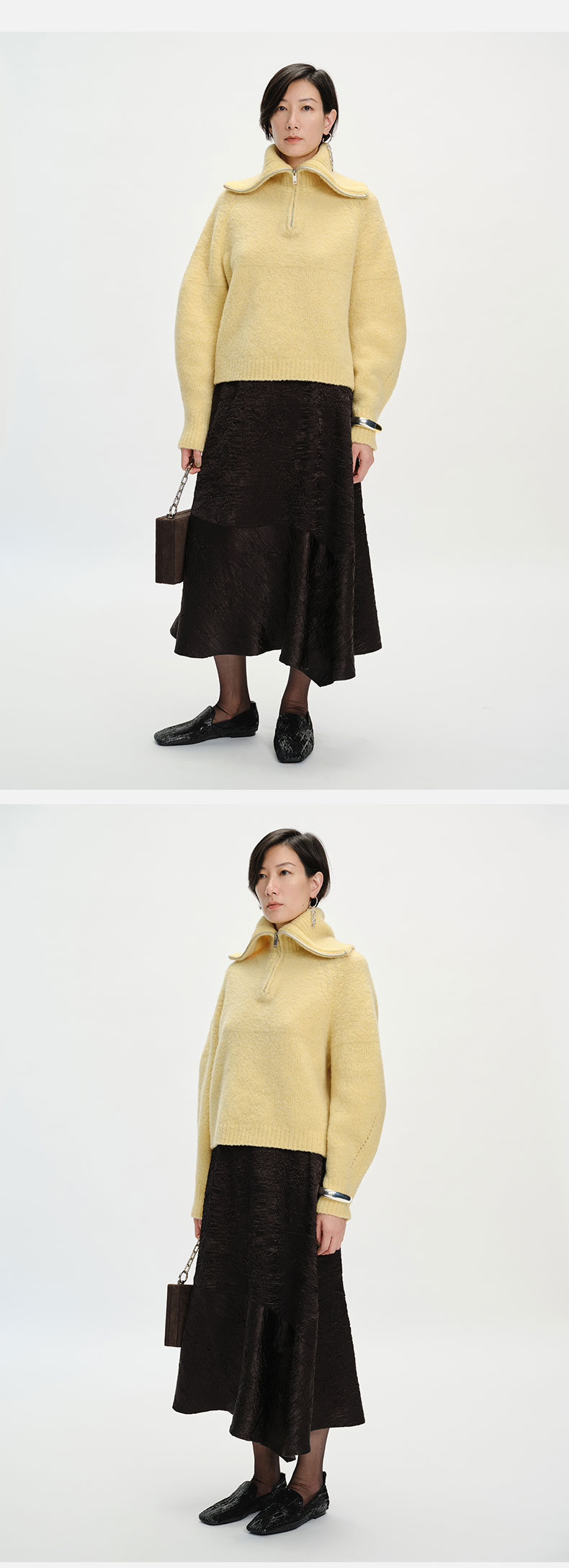 HIDEMI 美利奴羊毛缩绒圈圈粗针厚款拉链立领茧型袖毛衣 奶油黄/巧克力色/雾霾蓝