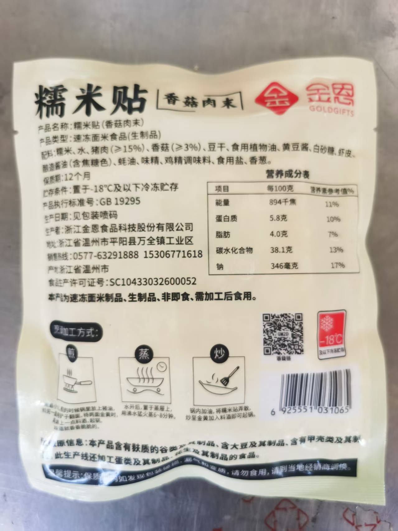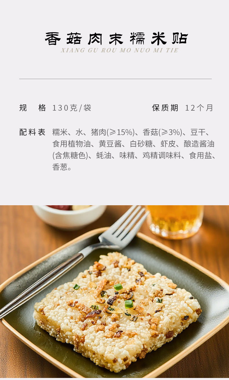 【品牌】金恩 【品名】糯米贴(香菇肉末) 【市场零售价格】74.8 【团价】54.8 【规格】130g*10包 【生产日期】2025年9月 【质保期】12个月 【产地】浙江 【储存方法】-18℃及以下冷冻储存 【食用方法】油煎 【快递】中通 【发货地】浙江 【发货时间】72小时 【加邮费地区】无 【不发货地区】新疆、西藏、内蒙古、青海、海南、宁夏、甘肃、黑龙江、吉林、辽宁、山西、陕西、广西、四川、重庆、贵州、云南、港澳台 【售后说明】 【售后说明1】冷冻生鲜食品不支持7天无理由退换货,若收到产品有质量问题,请在签收24小时之内尽快对产品拍照+快递面单照片联系售后处理,超时不予处理望谅解! 【售后说明2】 1、因生鲜冷冻品是特殊产品,一旦下单不支持撤单拦截拒收,如因客户自身原因导致需要拦退款拦截拒收,视为弃件处理,费用由客户承担,请谨慎下单。 2、因客户原因如联系方式有误、电话停机、不接电话、无理由拒收等造成快件无法正常签收的情况,不在赔付范围内; 3、请在签收后,第一时间检查商品。如果商品有异味、变质、破损等情况请将商品和快递面单一起拍照并在24小时内联系客服申请理赔,不能提供符合要求照片或未能在24小时内联系客服,将不予退货退款处理; 4、因顾客原因导致转寄、延派、误派、擅自拒收、退货等恕不理赔! 5、因买家地址太偏/快递超区/需自提不及时自提,导致派送时间过长,产品变质损耗,不予以赔付,望谅解。 如有问题!请联系客服咨询 此产品一经购买成功,不接受任何条件的退款和换货,请谨慎购买 到件将会有短信(具体以网点为准),请及时关注物流信息 特殊说明 1、收到软化常温属于正常现象(任何冷冻品都一样),先放进冰箱冷冻 冰袋变温并不代表产品变质,请大家理性对待,食品发出不能退款撤单 【注意事项】致敏原信息:本产品含有麸质的谷类及其制品、含大豆及其制品、含有甲壳类及其制品,此生产线还加工蛋类及其制品、花生及其制品的食品。 【产品亮点】温州特色早餐 1.温州特色早餐 2.小料多,营养健康 3.简单油煎即可完成,便捷