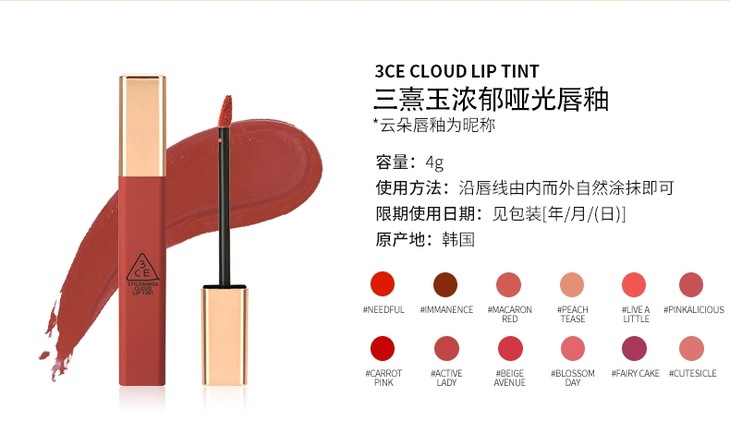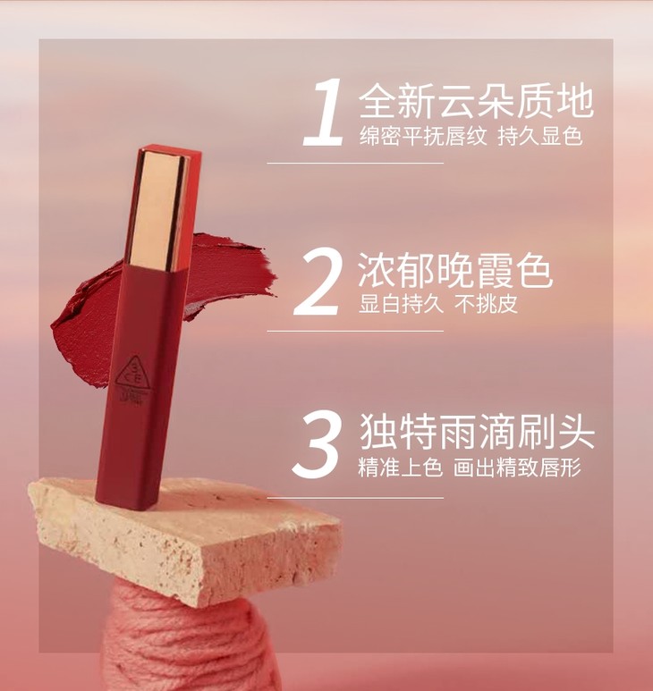 韩国 3CE三熹玉 云朵哑光雾面持久唇釉 口红 4g