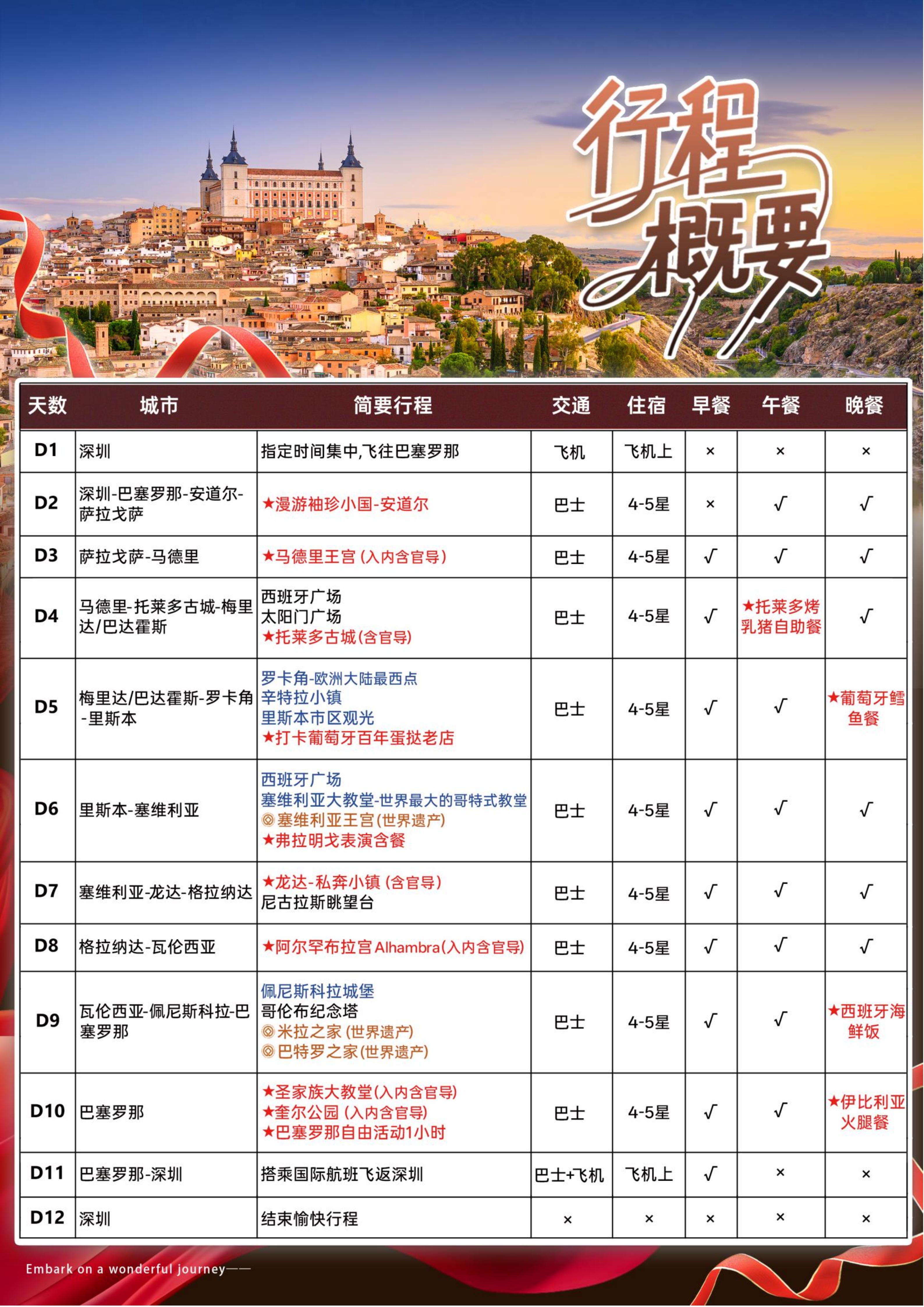 【五一】<南欧:西班牙+葡萄牙纯玩12天-深圳直飞>巴塞罗那、安道尔、马德里、托莱多古城、罗卡角、里斯本、塞维利亚、弗拉明戈表演、龙达、阿尔拜辛、阿尔罕布拉宫、佩尼斯科拉城堡、圣家族大教堂、奎尔公园
