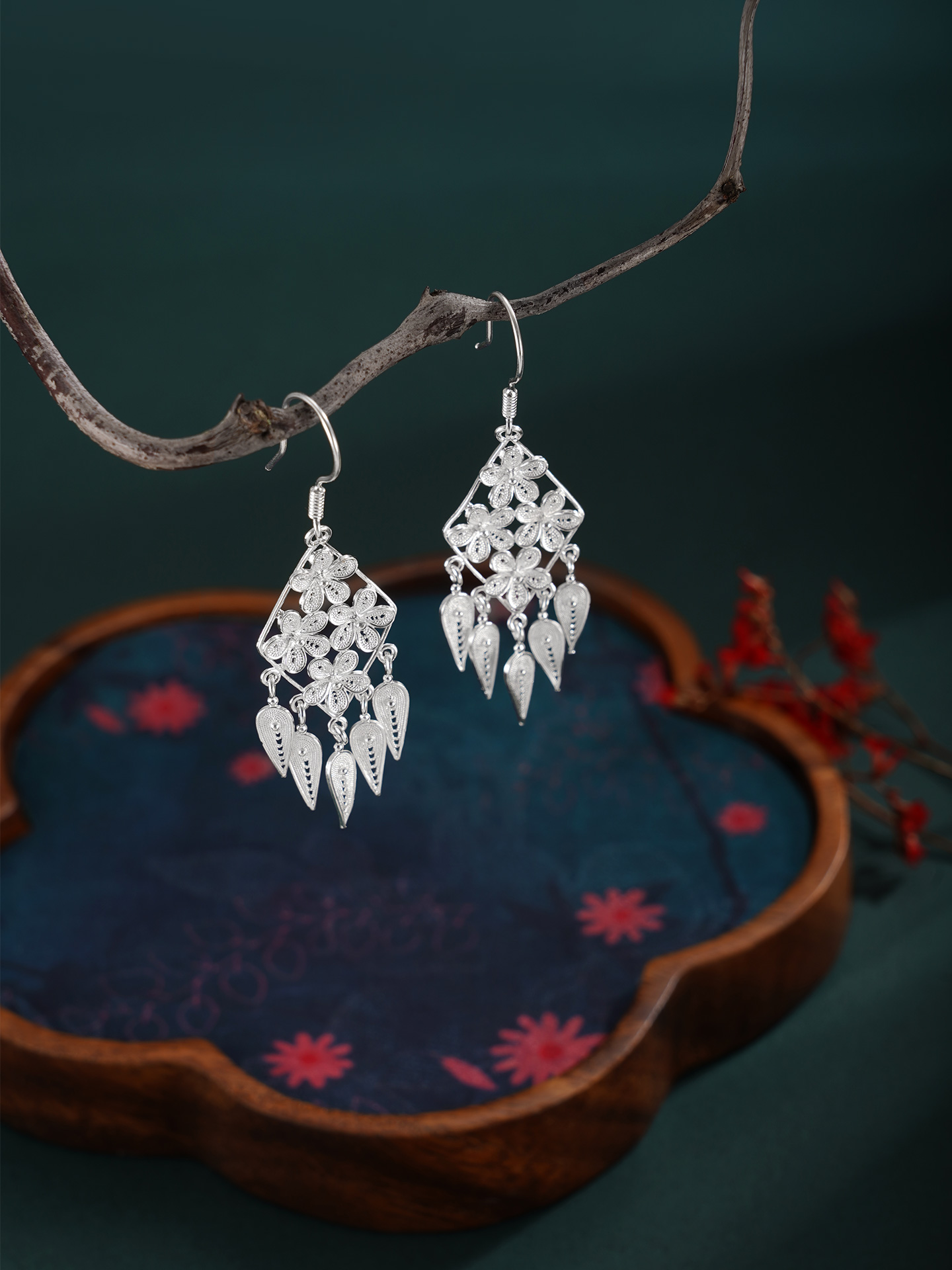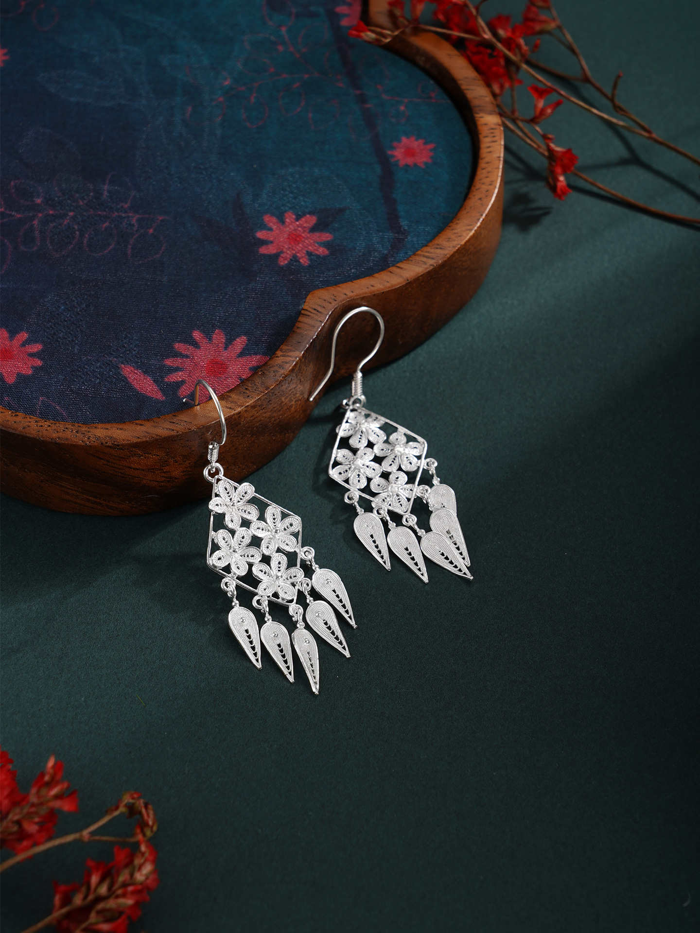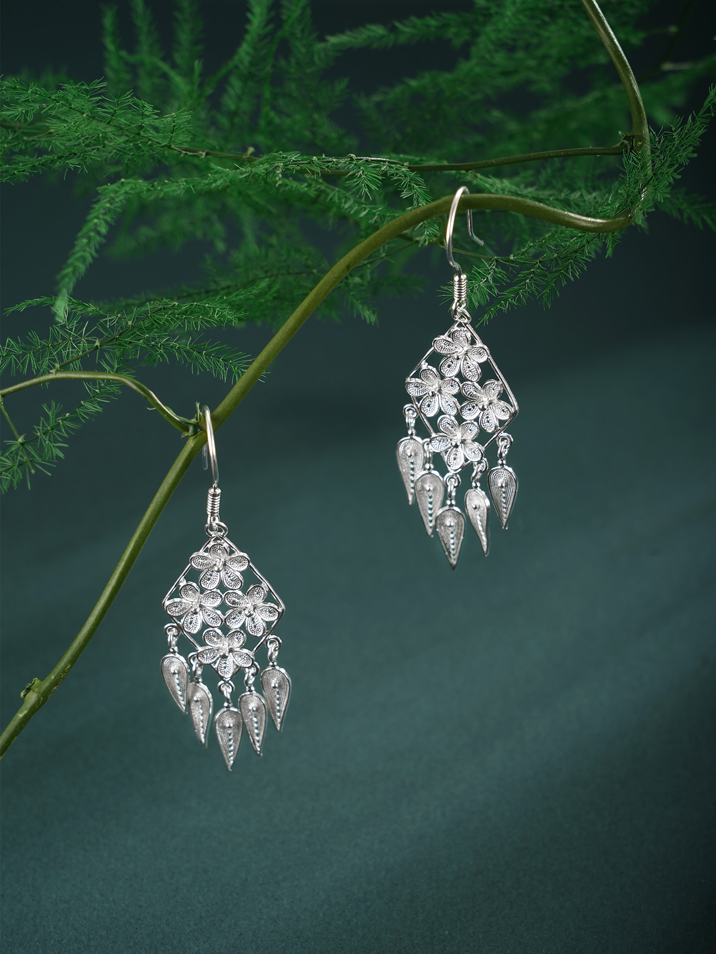 【寓意】:耳饰采用非遗银花丝工艺制作,银丝勾勒,花朵环环相扣。极尽妍丽、尽显雍容,寓意花开年年,美丽绵延。
