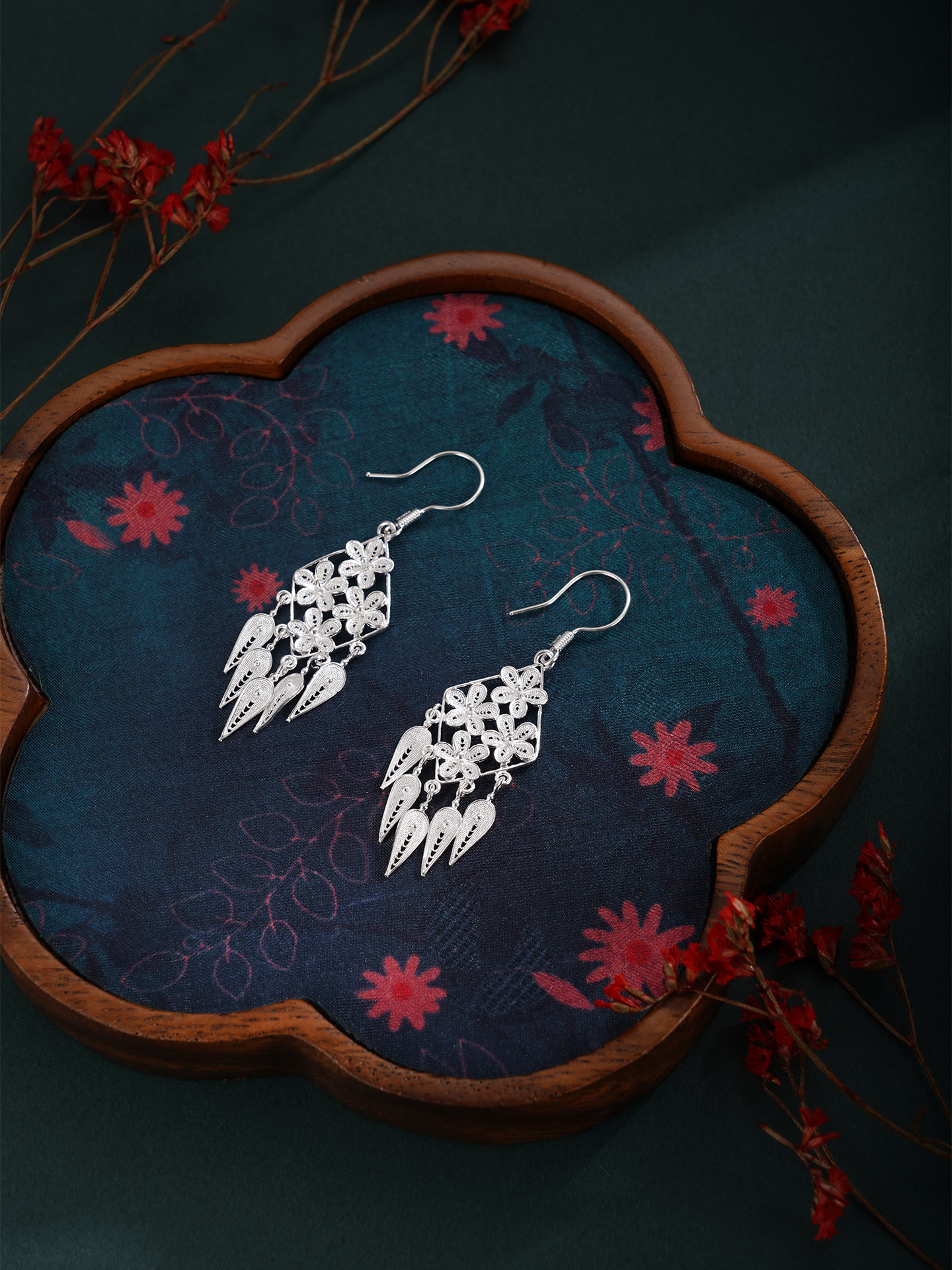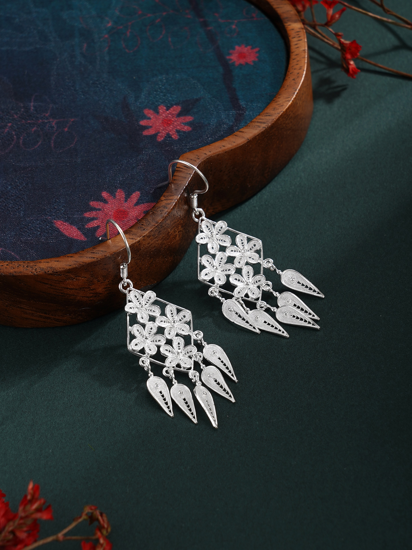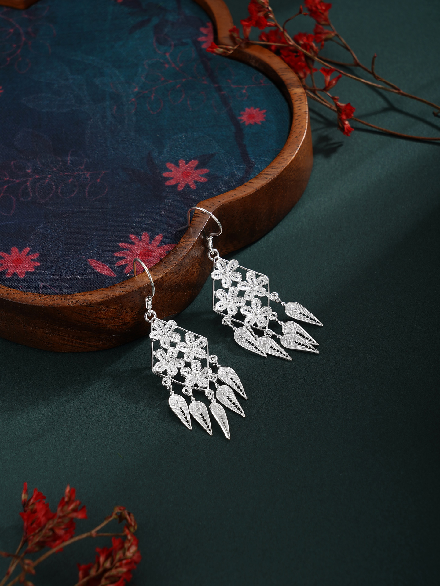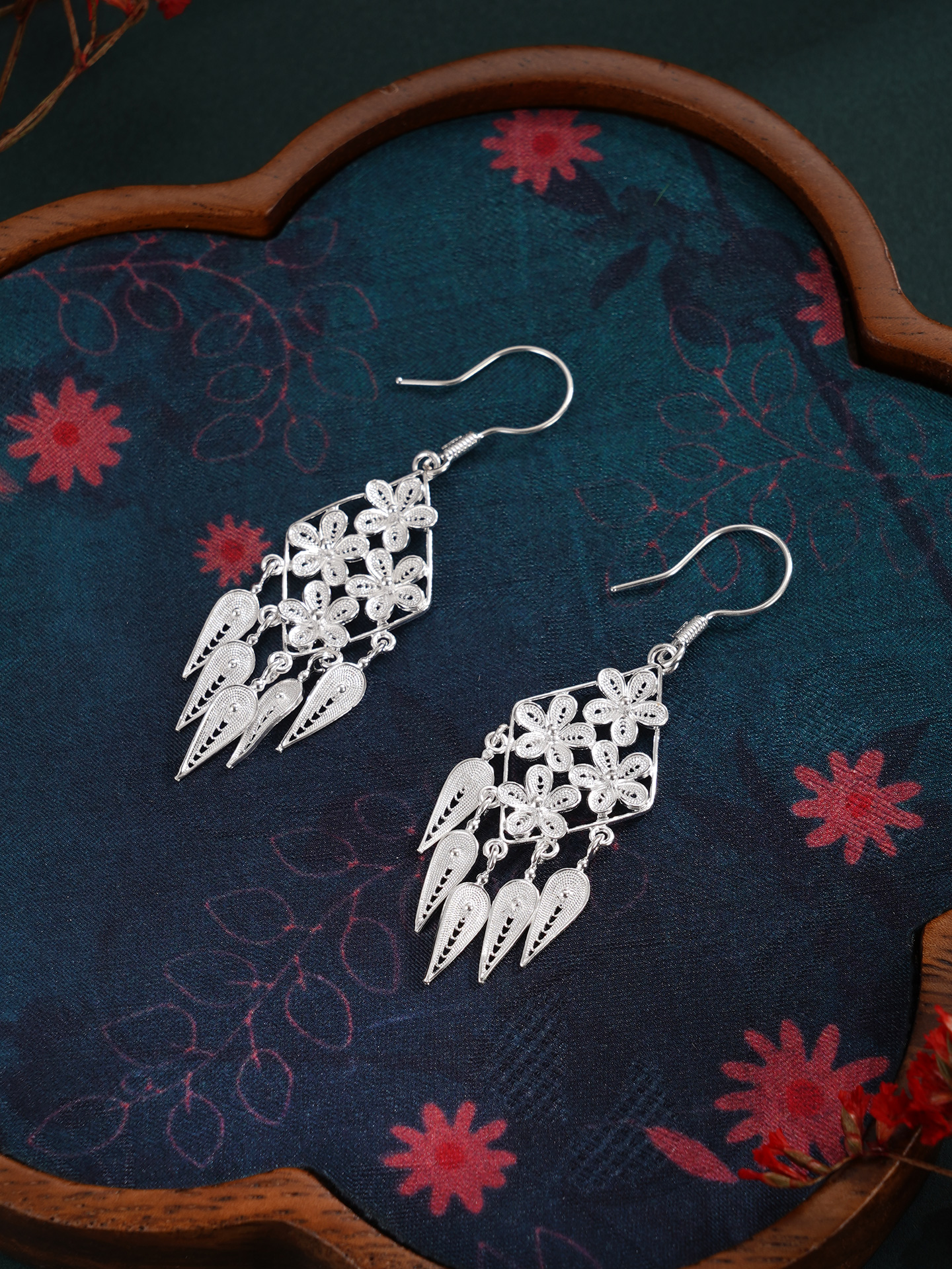 【寓意】:耳饰采用非遗银花丝工艺制作,银丝勾勒,花朵环环相扣。极尽妍丽、尽显雍容,寓意花开年年,美丽绵延。