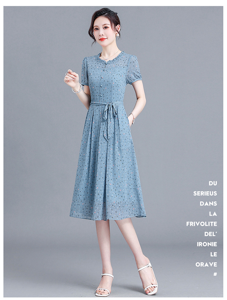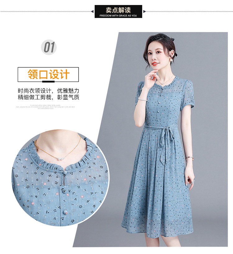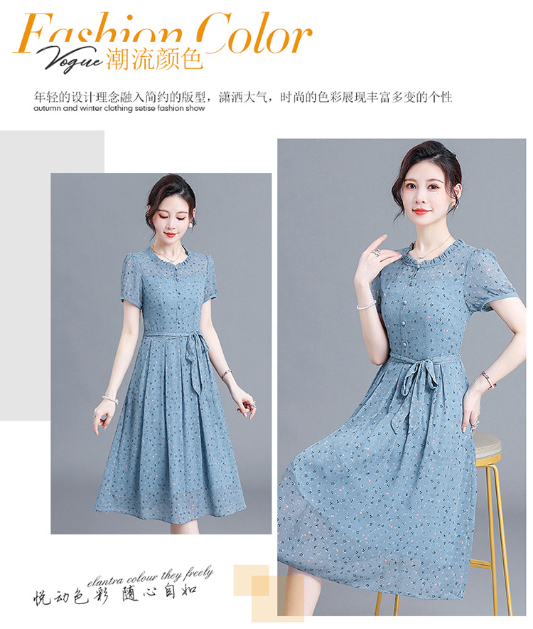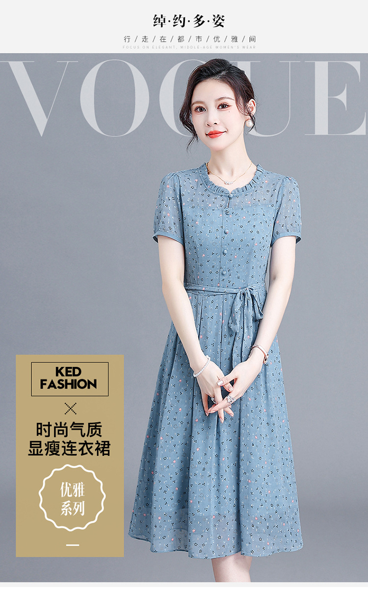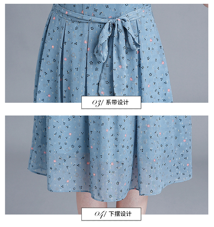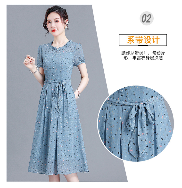 时尚中长款系带收腰,蓝色印花连衣裙QYM-R6611-1-Y