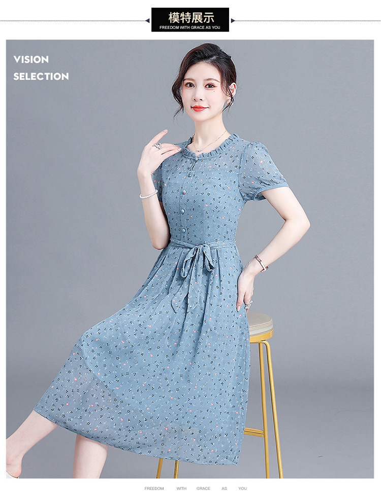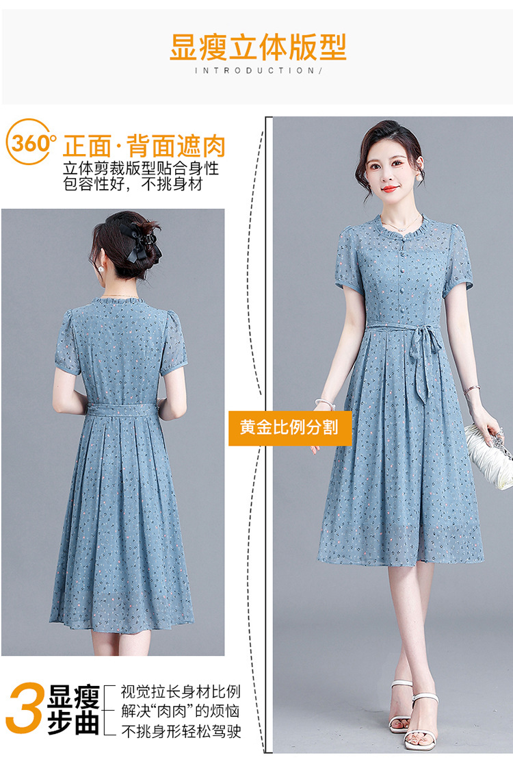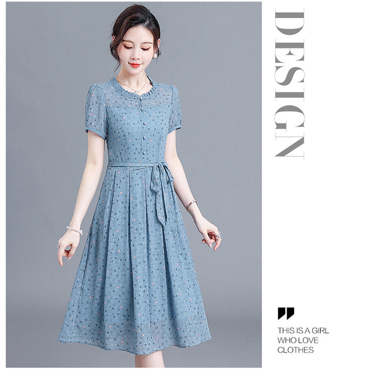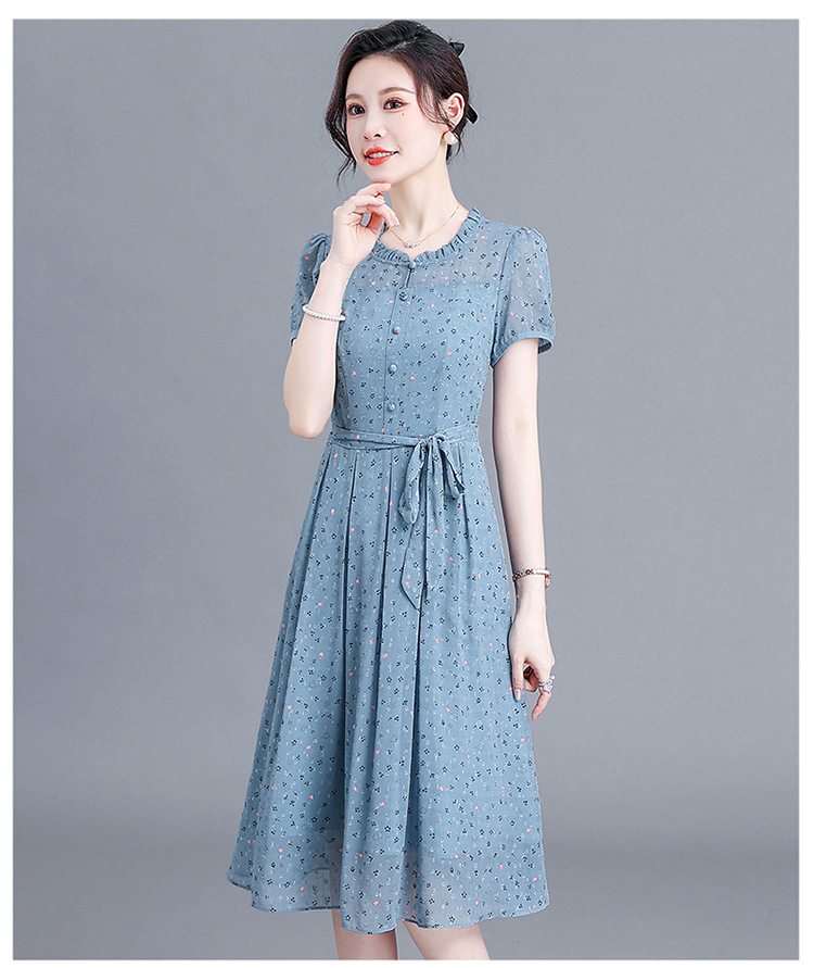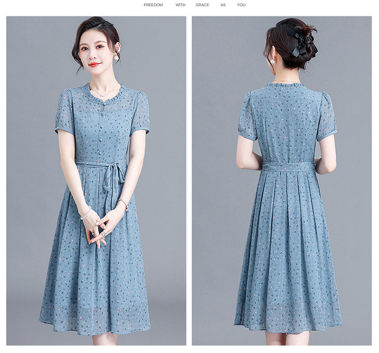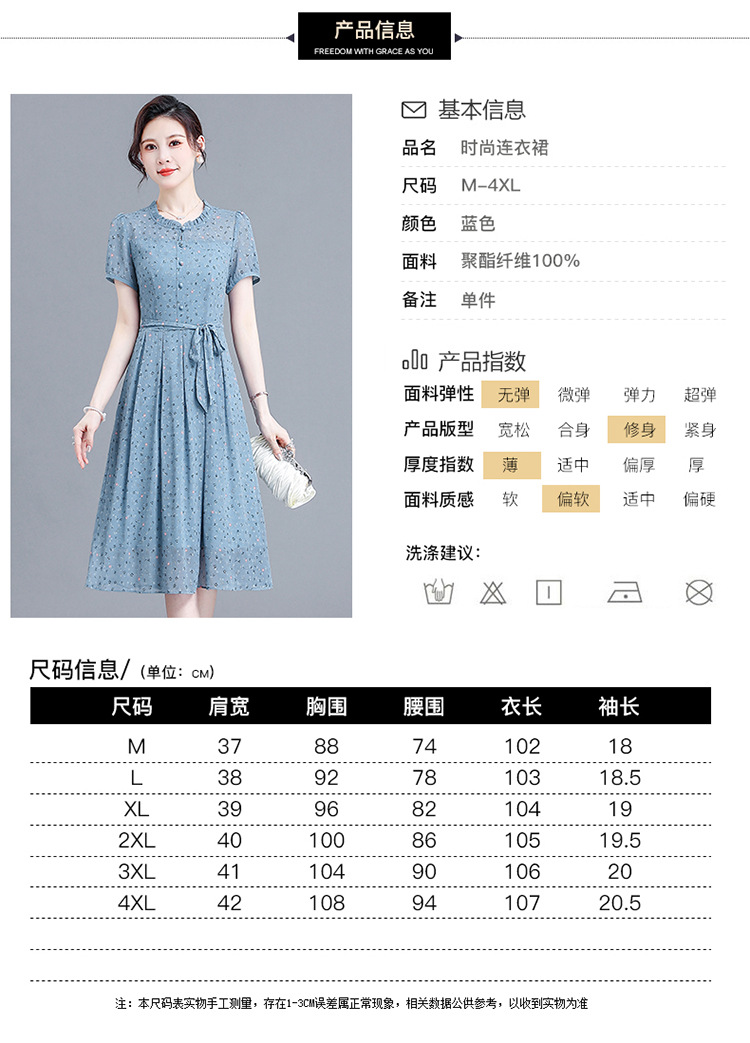 时尚中长款系带收腰,蓝色印花连衣裙QYM-R6611-1-Y