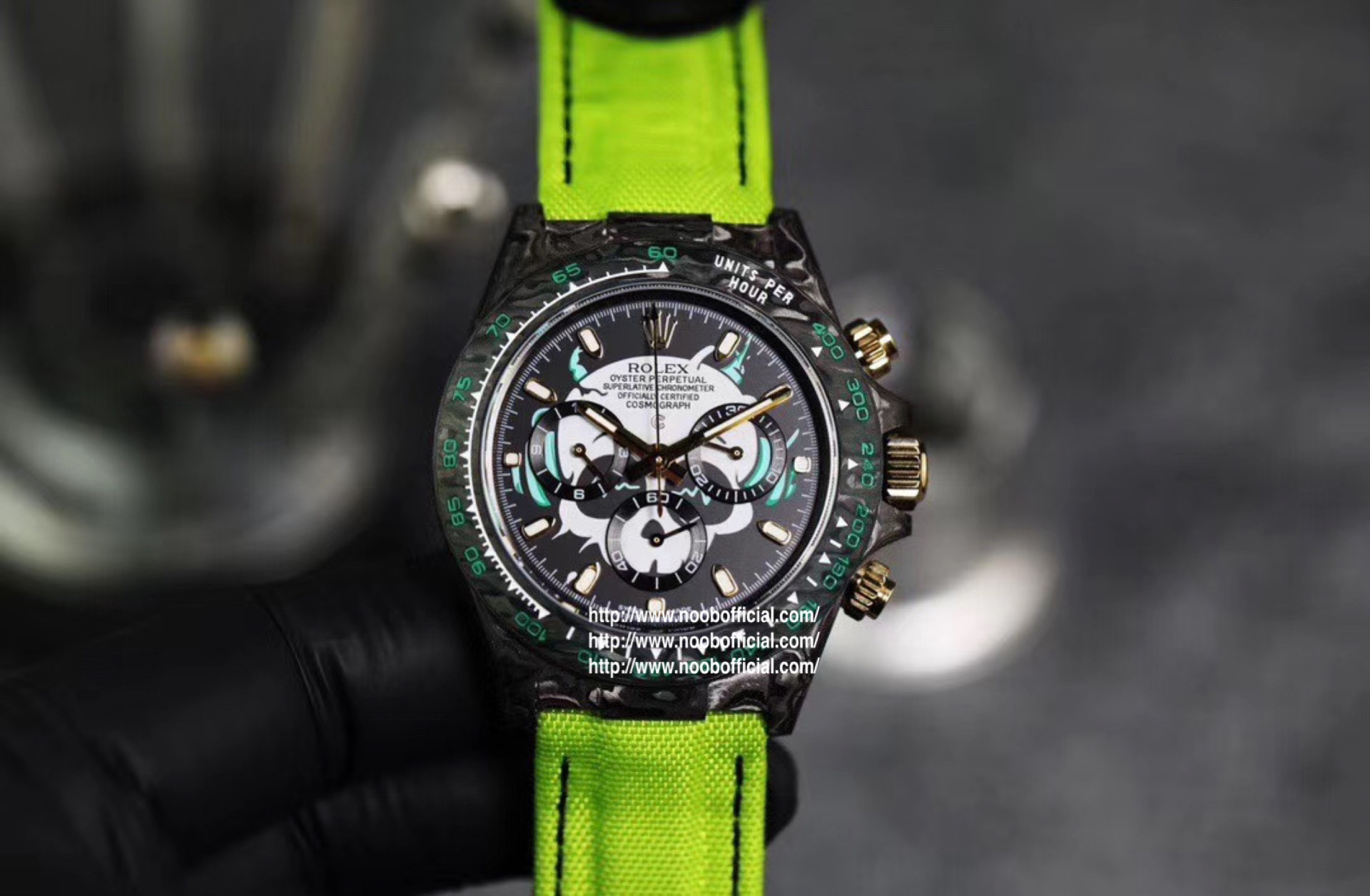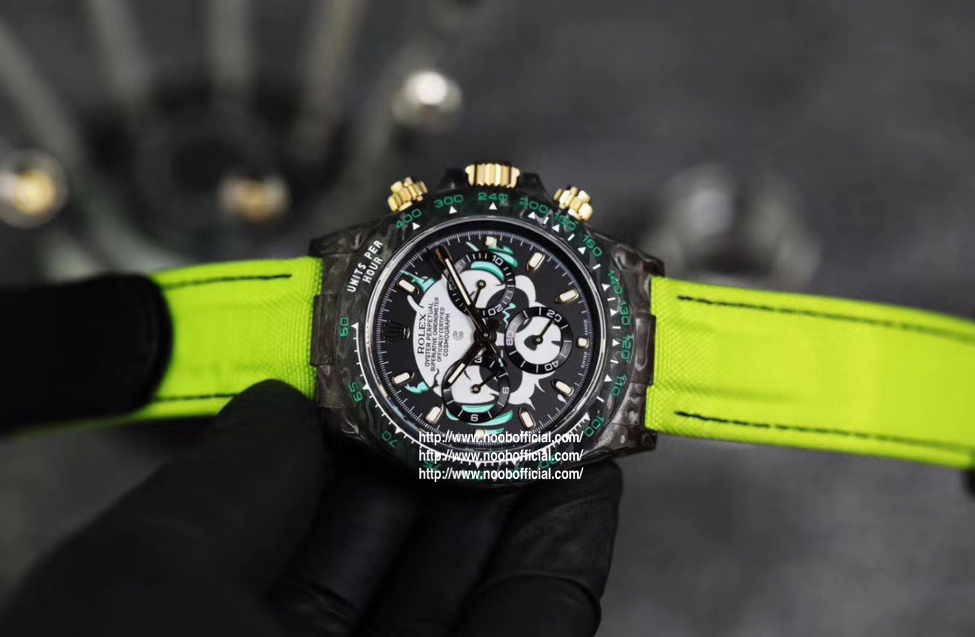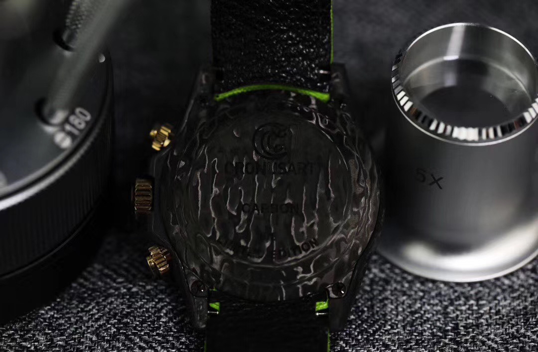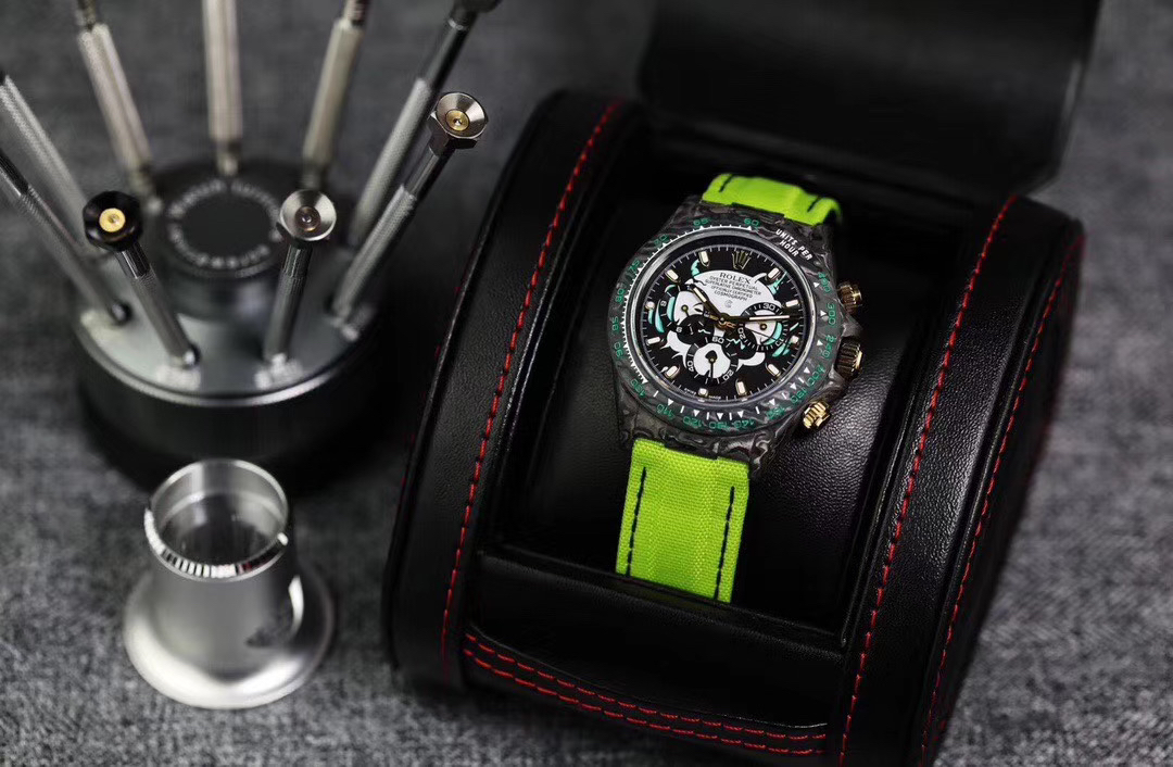 WWF Factory新品推荐 劳力士Rolex迪通拿系列【表壳】采用碳纤维材质打造,轻盈佩戴舒适,每一只腕表都拥有独一无二的碳纤花纹。 由于碳纤维材质的非常坚硬,表壳在CNC成型过程中损耗也是非常大的!【镜面】采用双面电镀高透膜工艺,使整个蓝宝石镜面通透性增加50%;一片好的镜面可以很好的提升整个手表质感!【字面】款式新颖,每一个条钉刻度都有倒角打磨处理,增强字面的质感和光泽度!【表带】采用降落伞布料手工编织而成,内里牛皮,透气舒适,质地柔软非常贴手,且表带车线和字面颜色相呼应,完全吻合原装!【机芯】采用精准而成熟的上海7750计时机芯,功能同步原装!WWF诚意之作 你值得拥有!