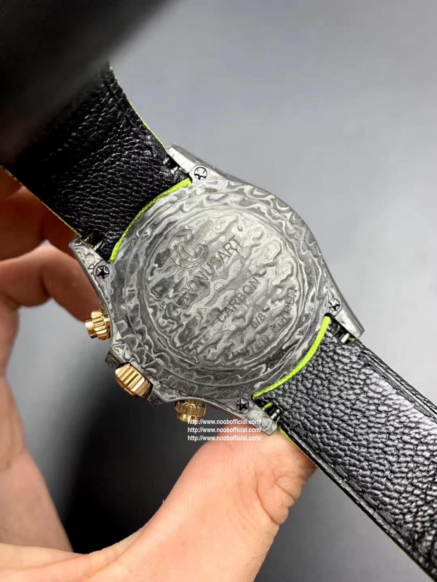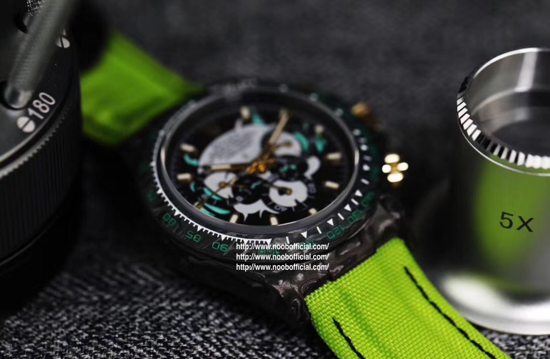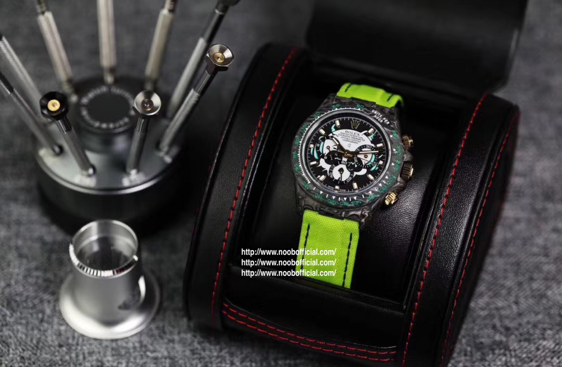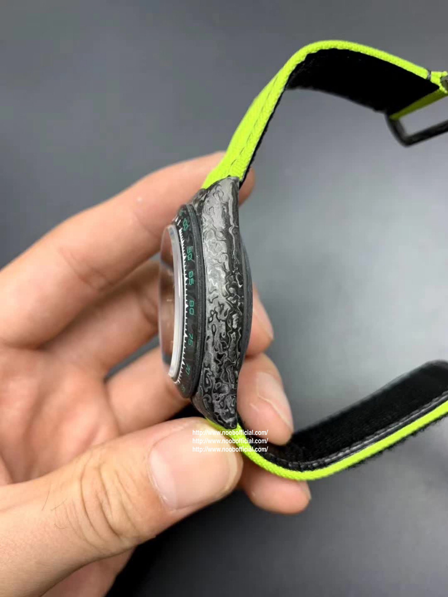 WWF Factory新品推荐 劳力士Rolex迪通拿系列【表壳】采用碳纤维材质打造,轻盈佩戴舒适,每一只腕表都拥有独一无二的碳纤花纹。 由于碳纤维材质的非常坚硬,表壳在CNC成型过程中损耗也是非常大的!【镜面】采用双面电镀高透膜工艺,使整个蓝宝石镜面通透性增加50%;一片好的镜面可以很好的提升整个手表质感!【字面】款式新颖,每一个条钉刻度都有倒角打磨处理,增强字面的质感和光泽度!【表带】采用降落伞布料手工编织而成,内里牛皮,透气舒适,质地柔软非常贴手,且表带车线和字面颜色相呼应,完全吻合原装!【机芯】采用精准而成熟的上海7750计时机芯,功能同步原装!WWF诚意之作 你值得拥有!