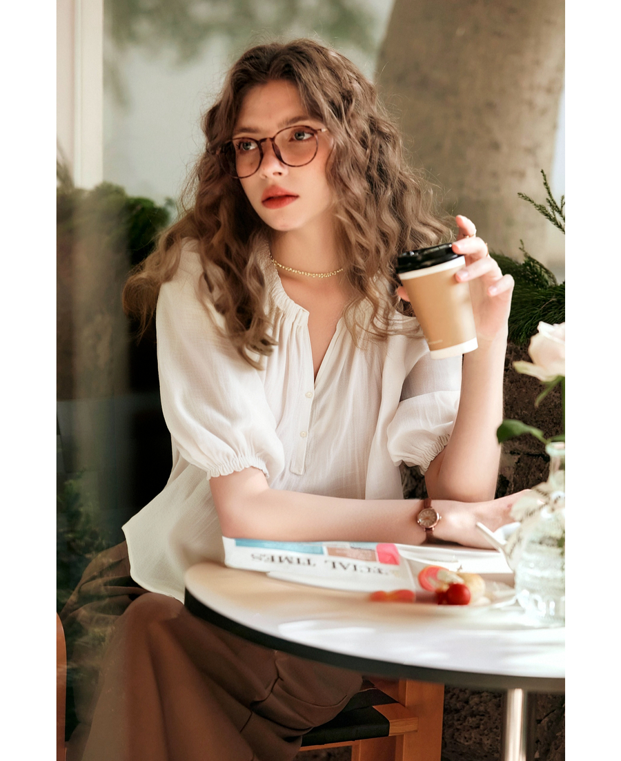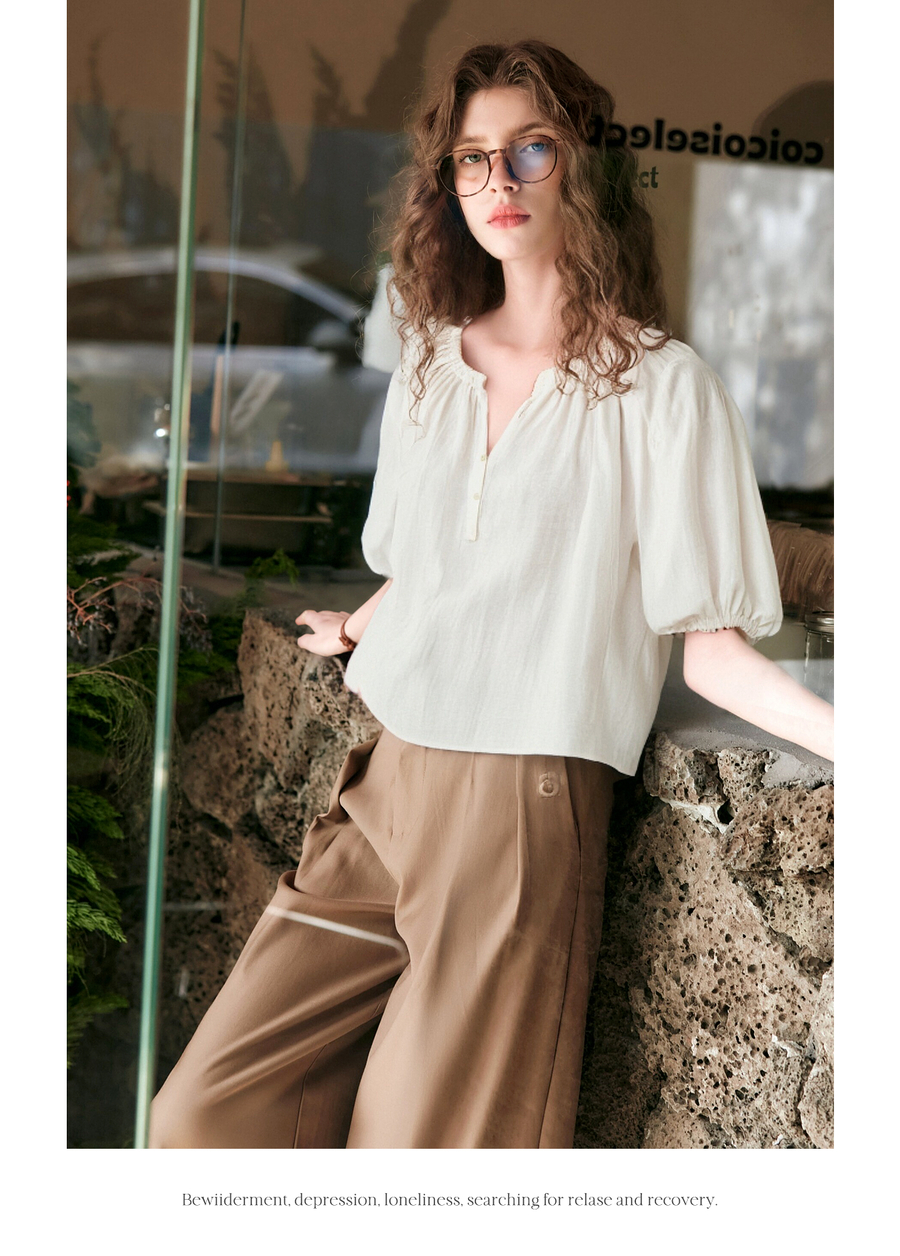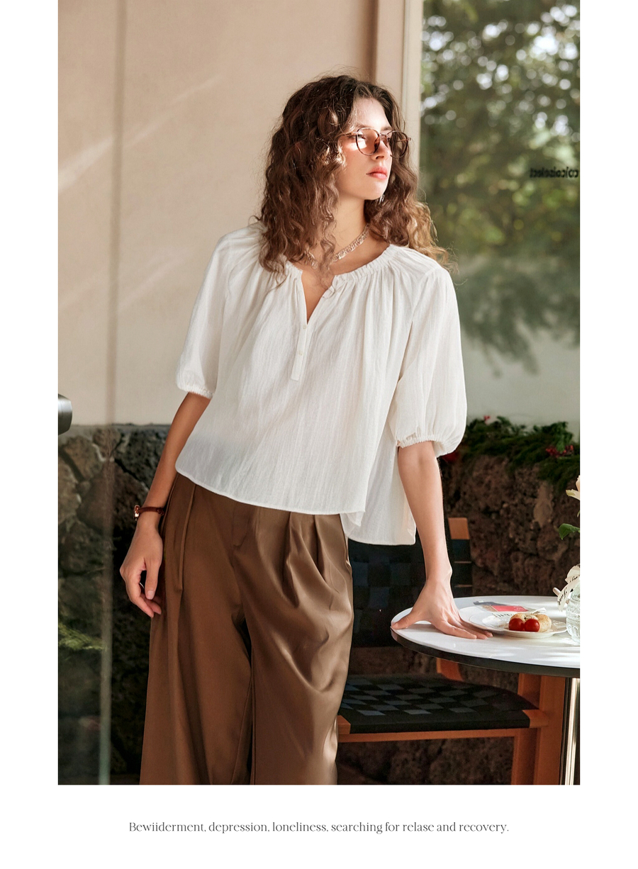 OLrain欧芮儿V领法式白色小上衣女夏季2025新款泡泡袖宽松套头衫