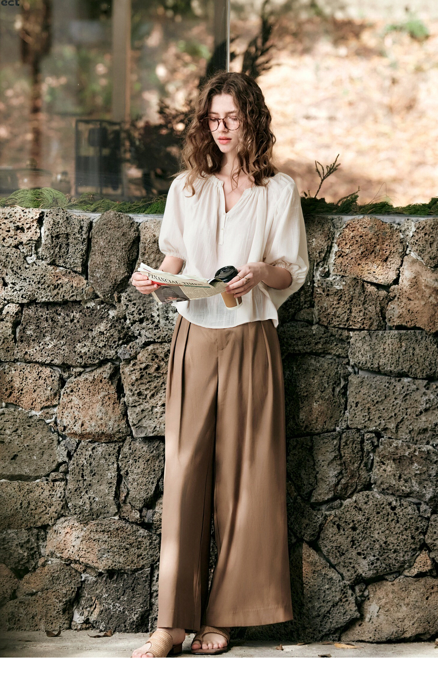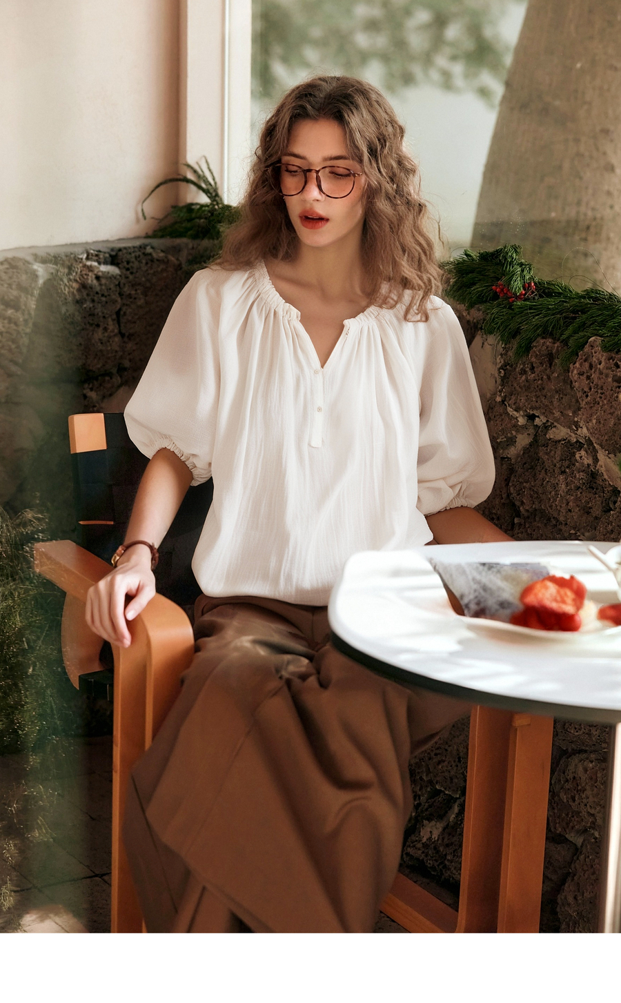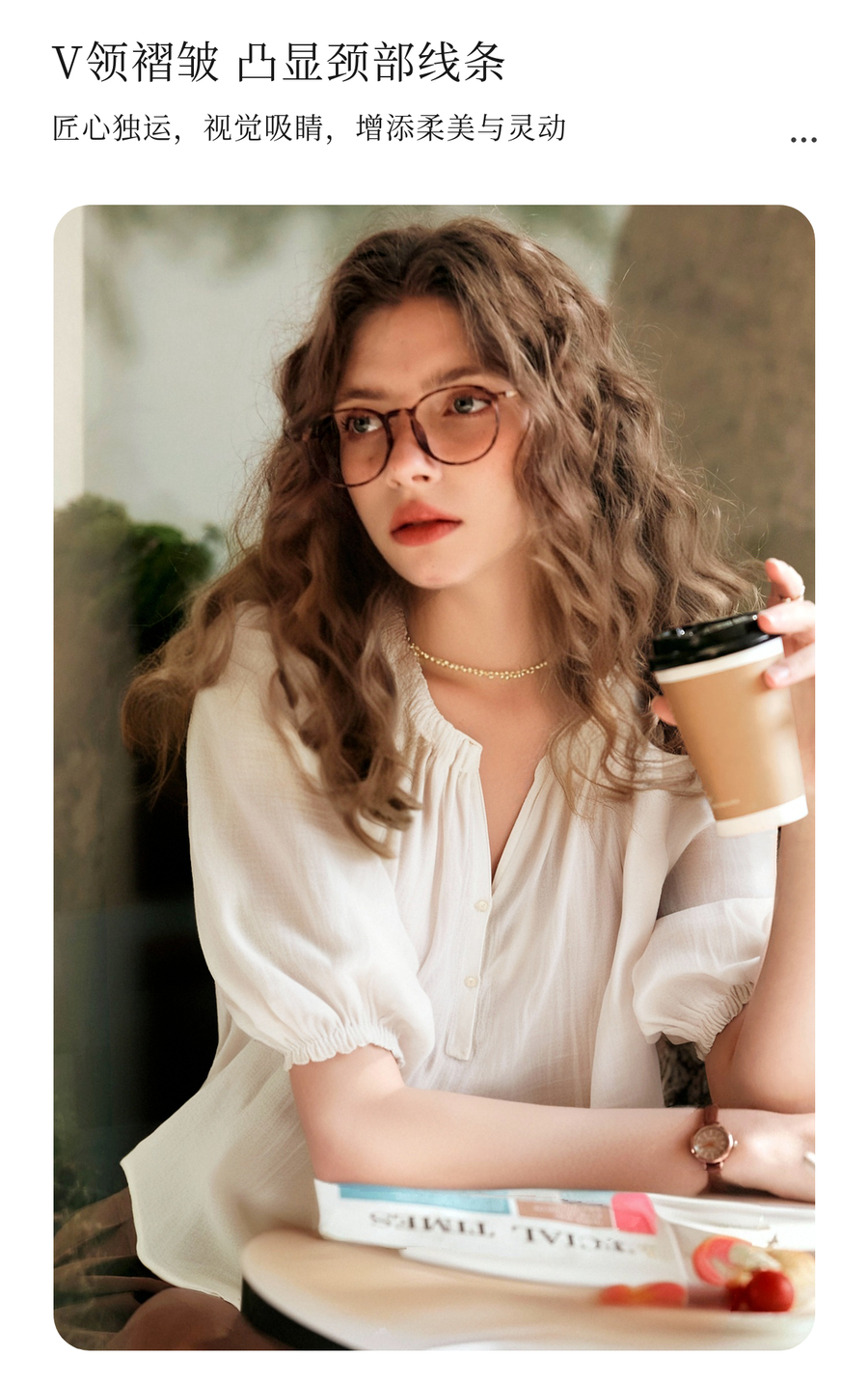 OLrain欧芮儿V领法式白色小上衣女夏季2025新款泡泡袖宽松套头衫