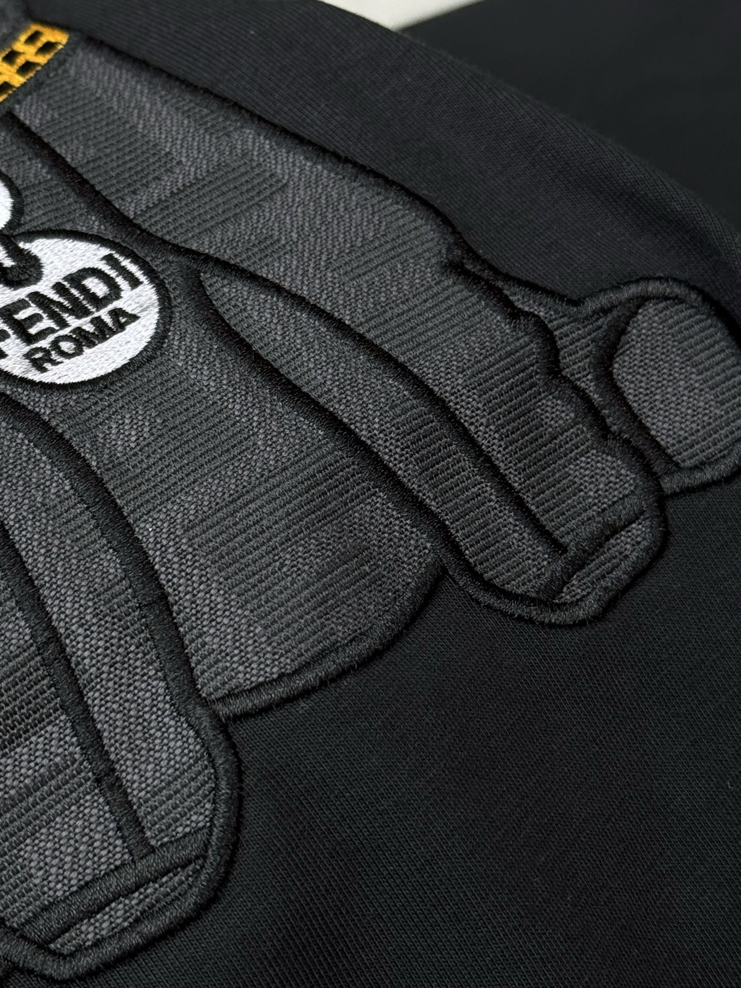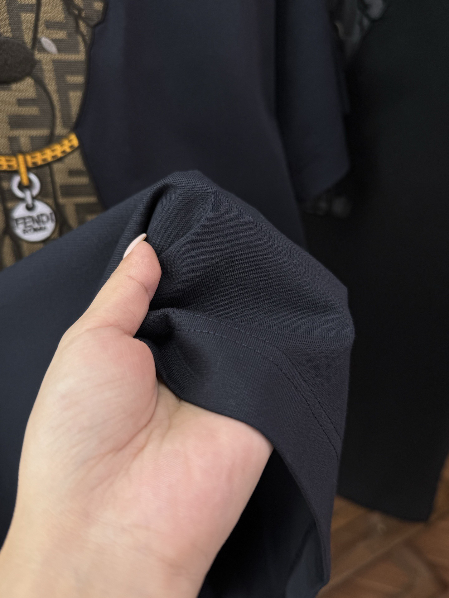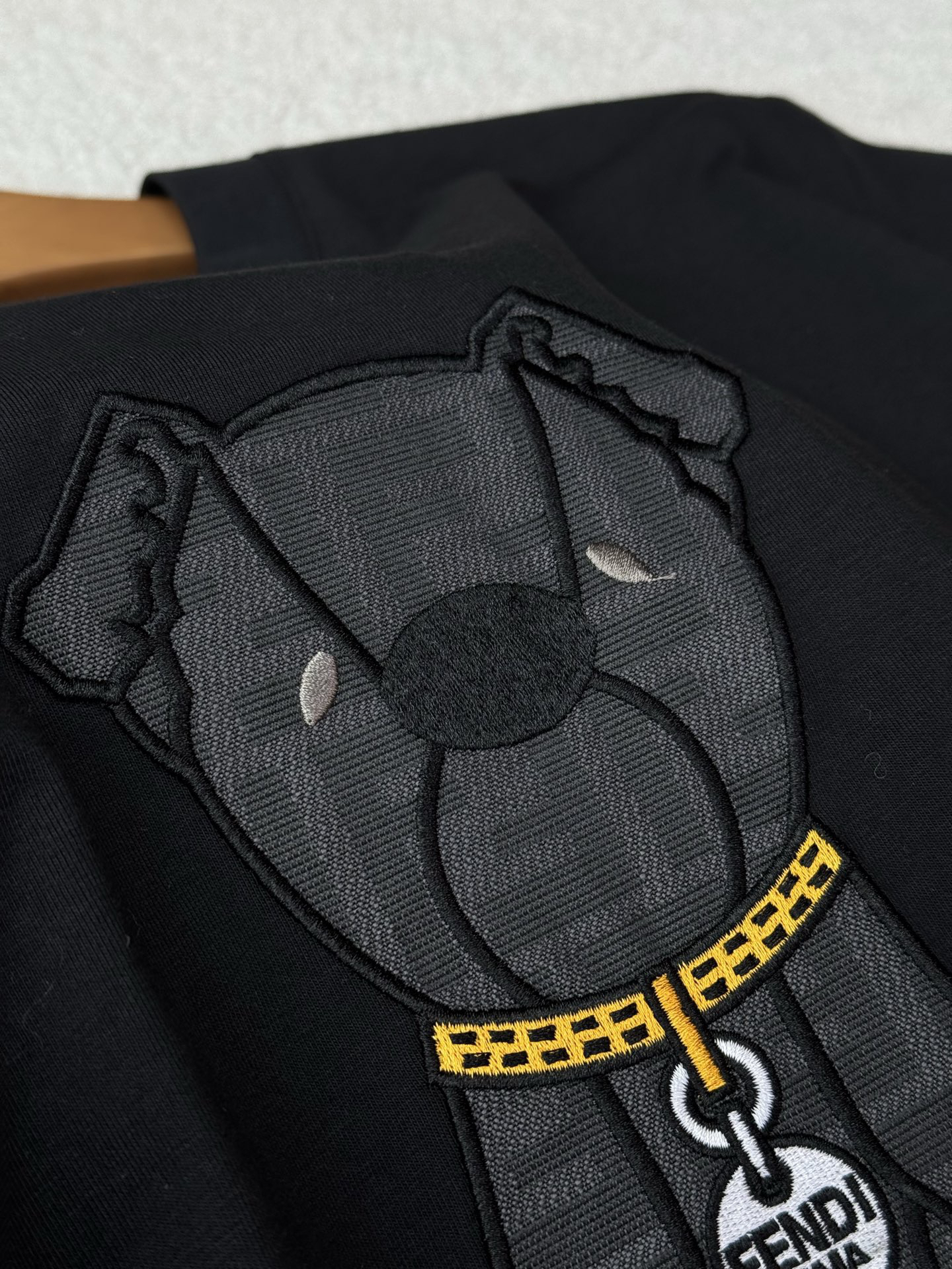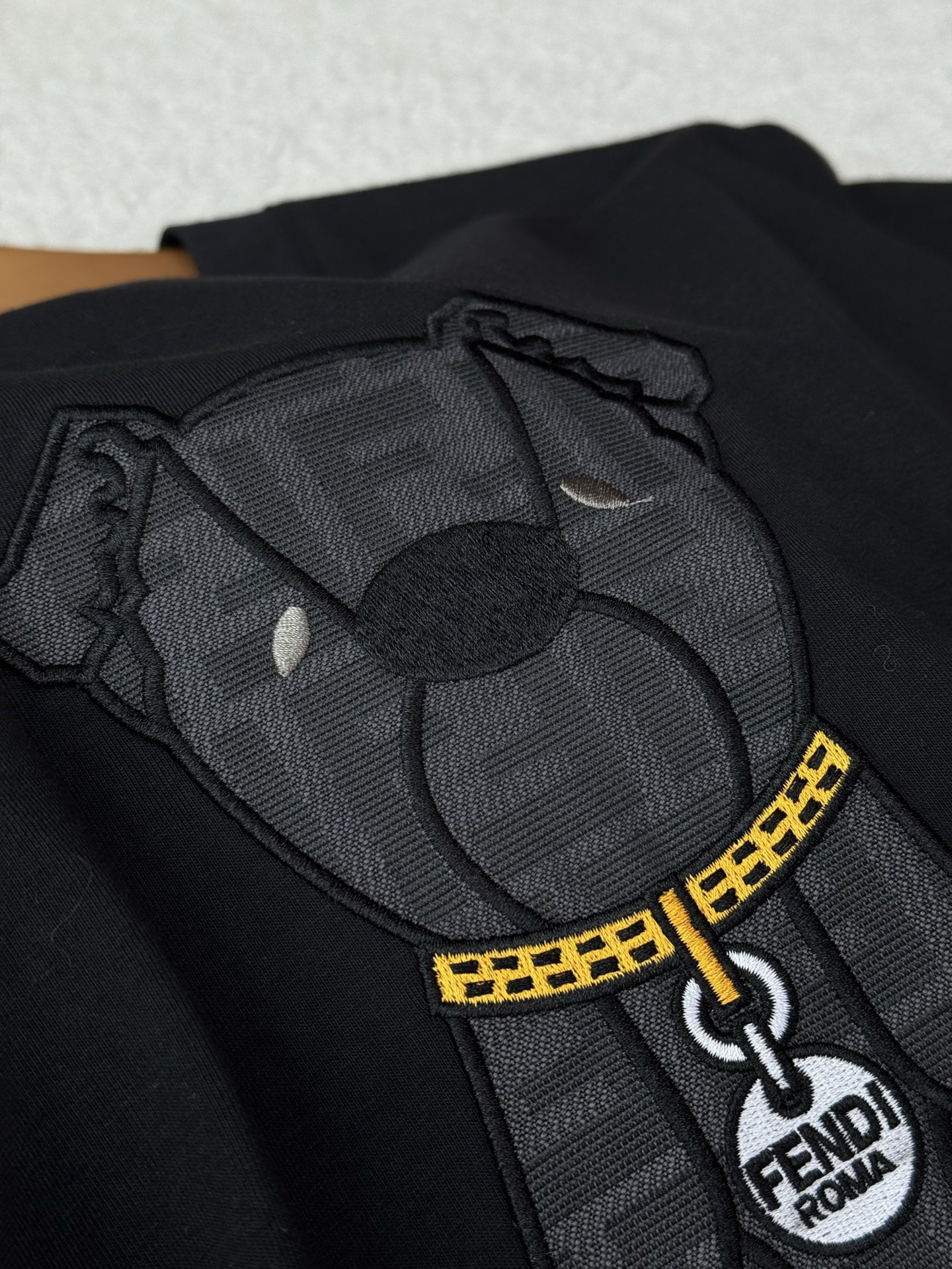 T恤正面的小狗贴布图案是点睛设计,采用棕色FF老花提花面料制作,搭配带有品牌标识的黄色皮质项圈与"FENDI ROMA"吊牌,生动又充满辨识度