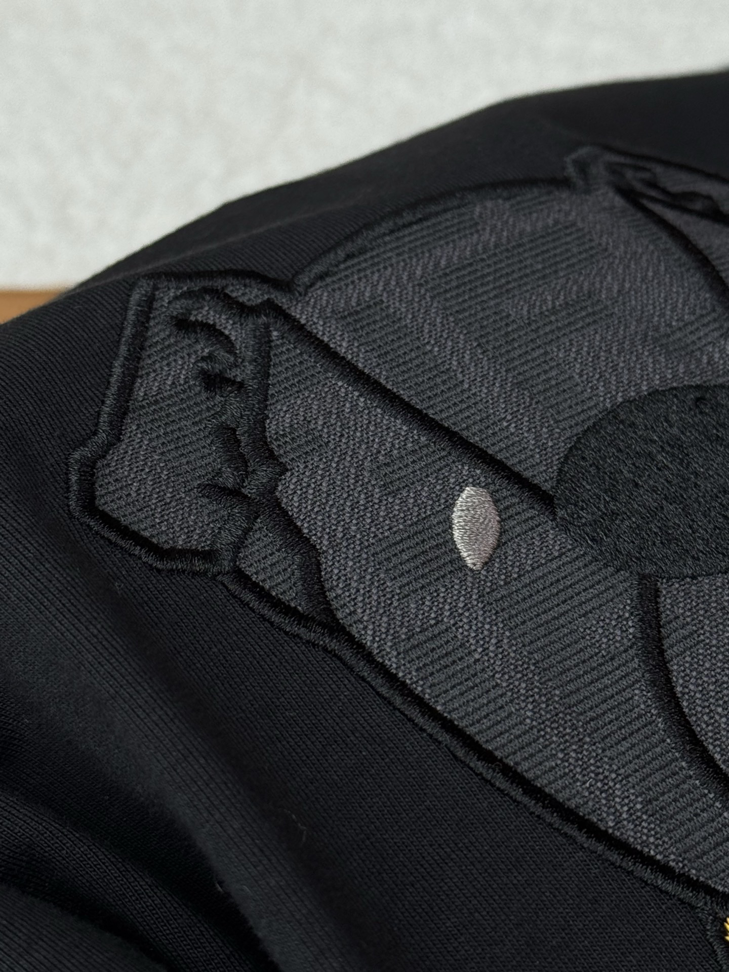 采用工整细密的走线,肩袖、下摆及贴布边缘针脚均匀利落,从细节处彰显品牌精湛工艺。