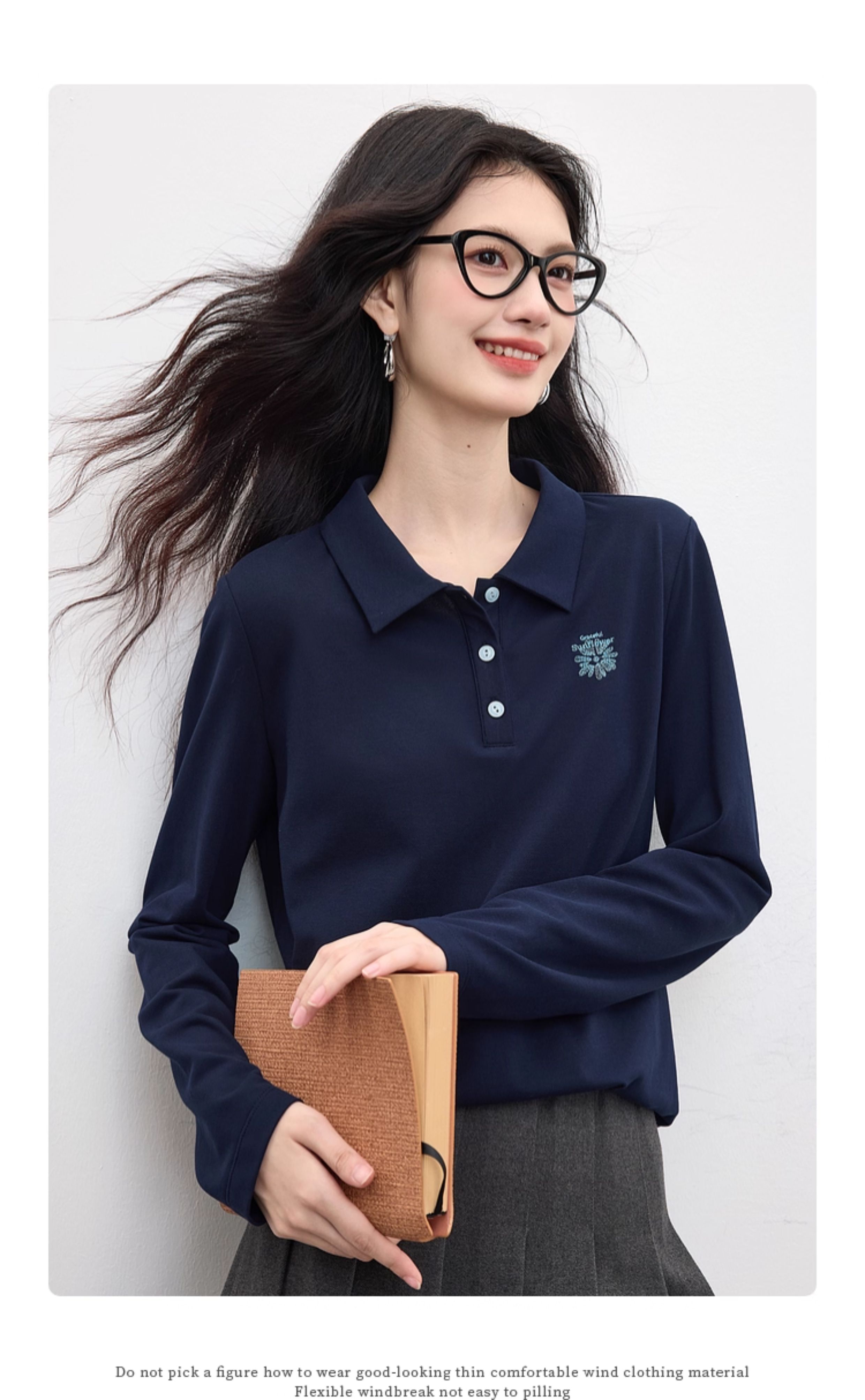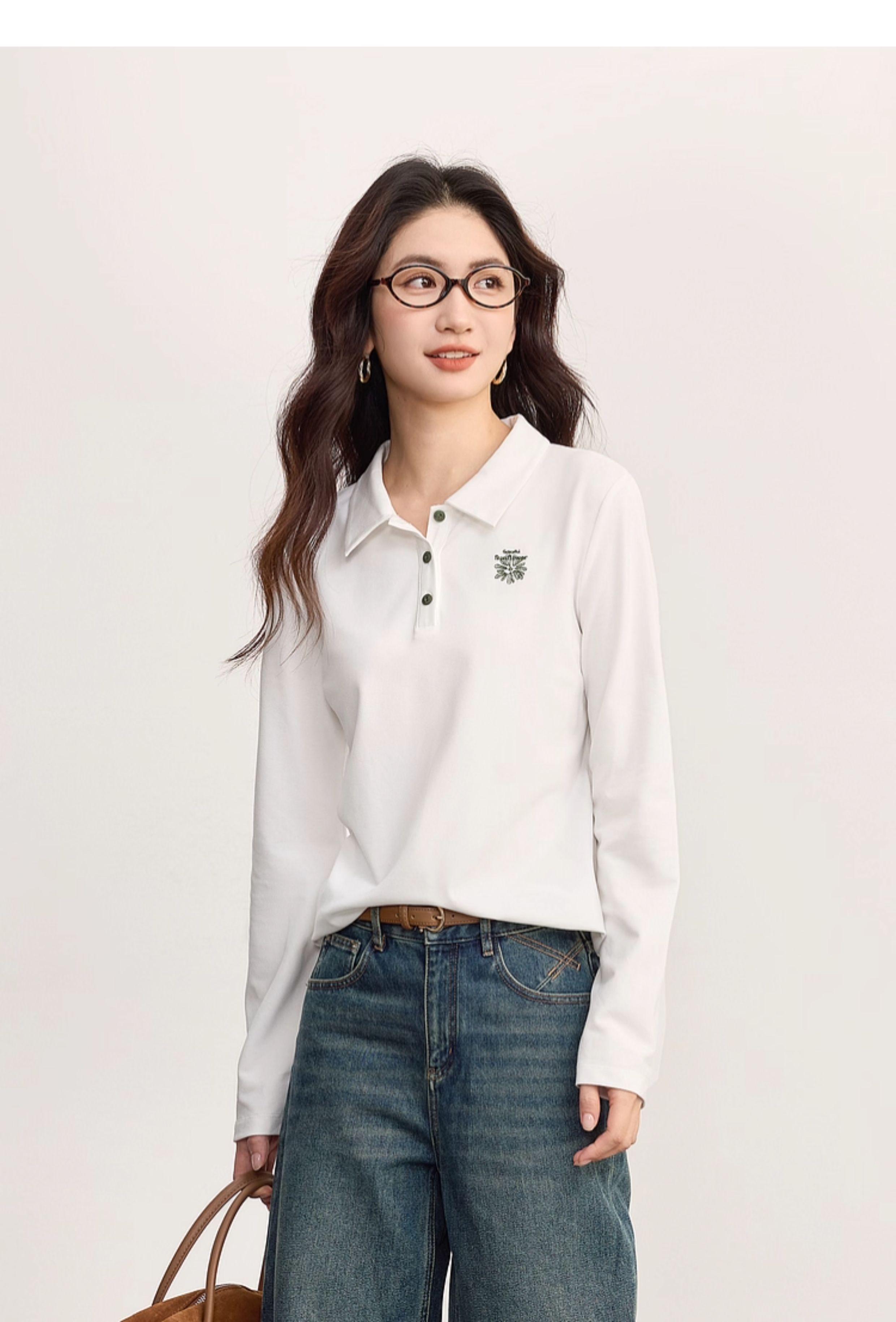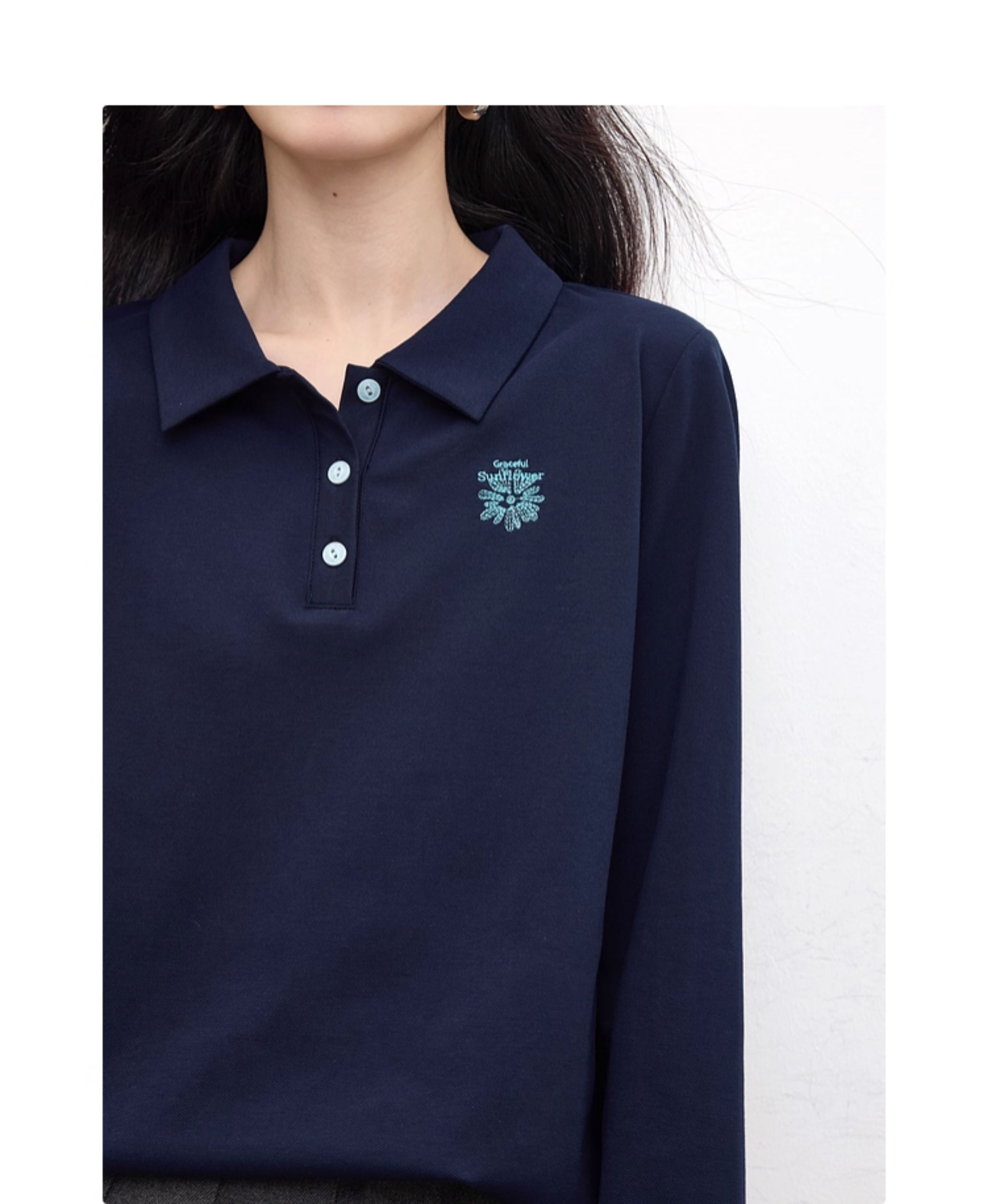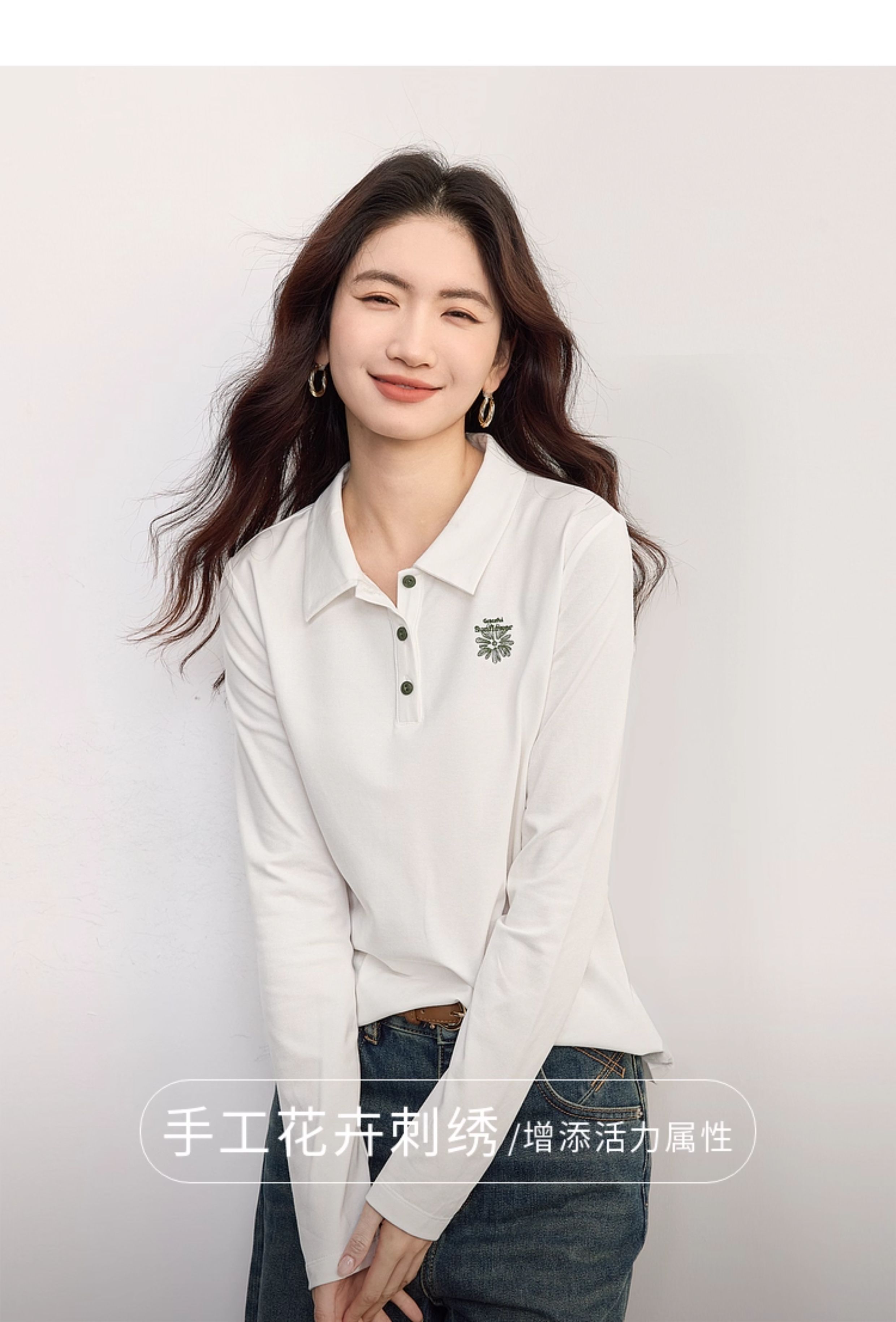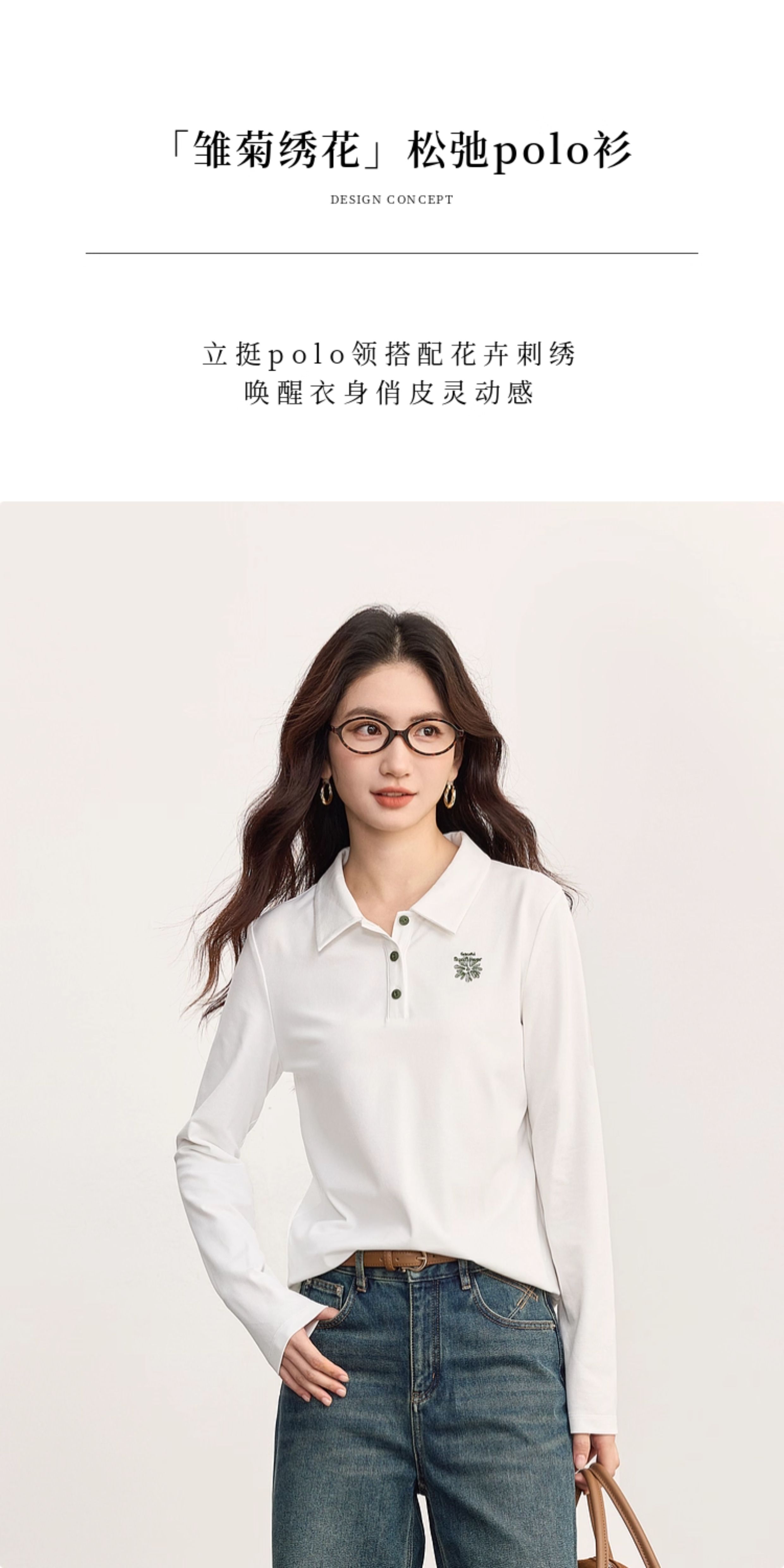 【09/17新品】熙世界小雏菊绣花POLO领T恤女长袖通勤休闲正肩上衣2025秋季新款