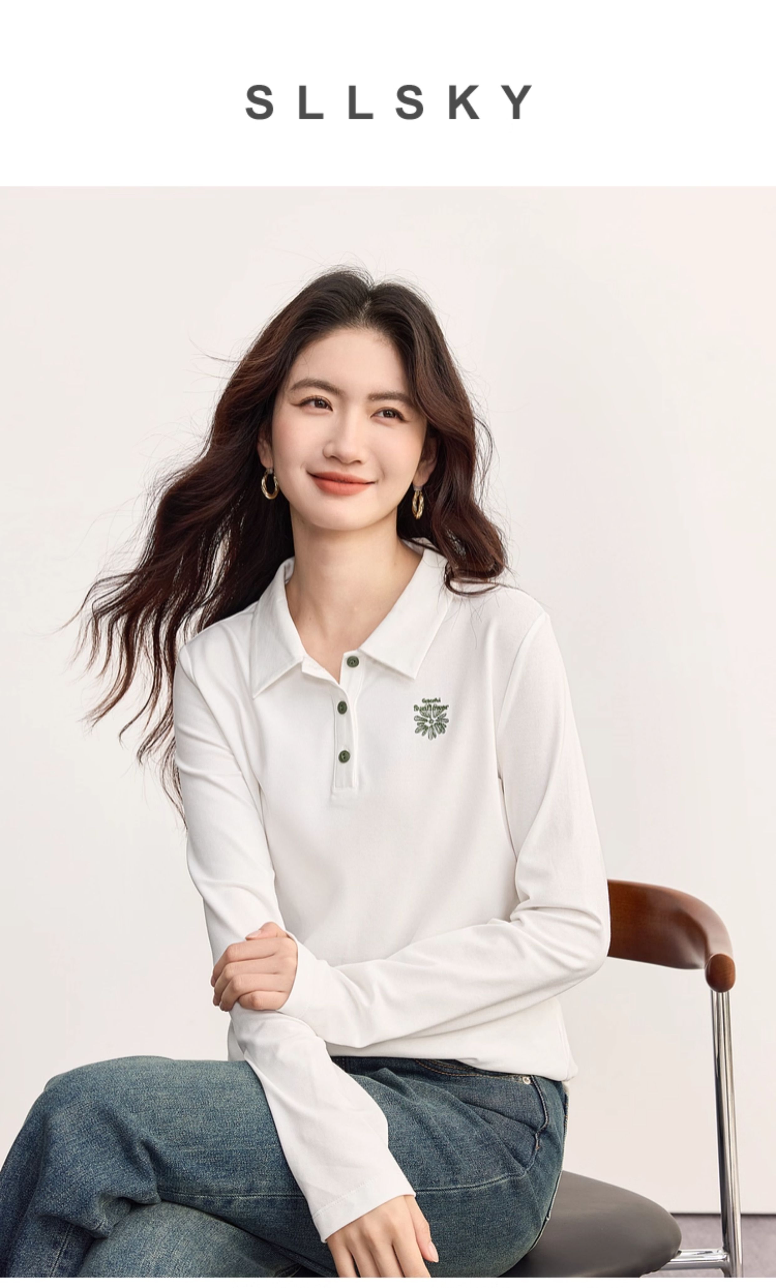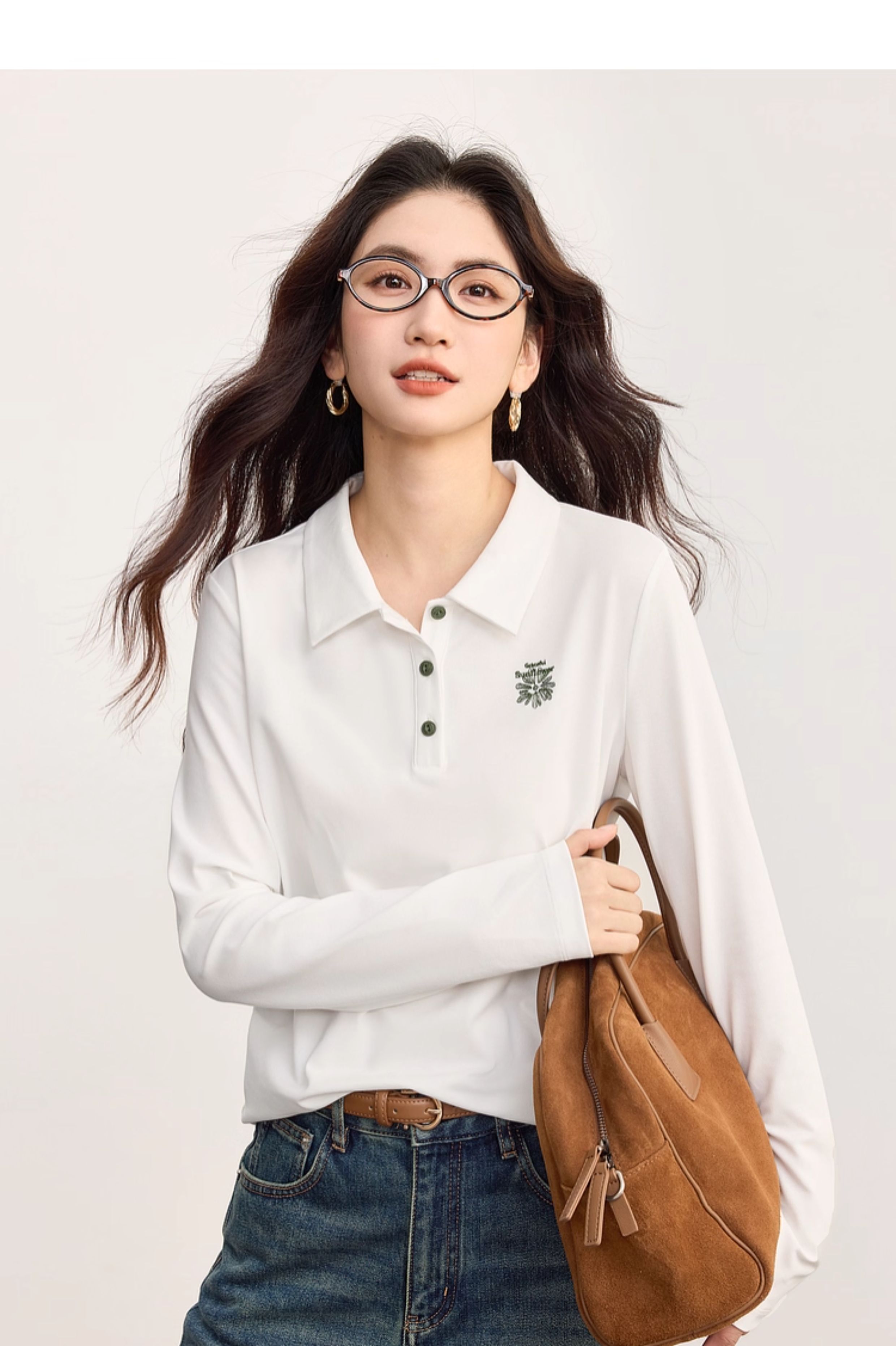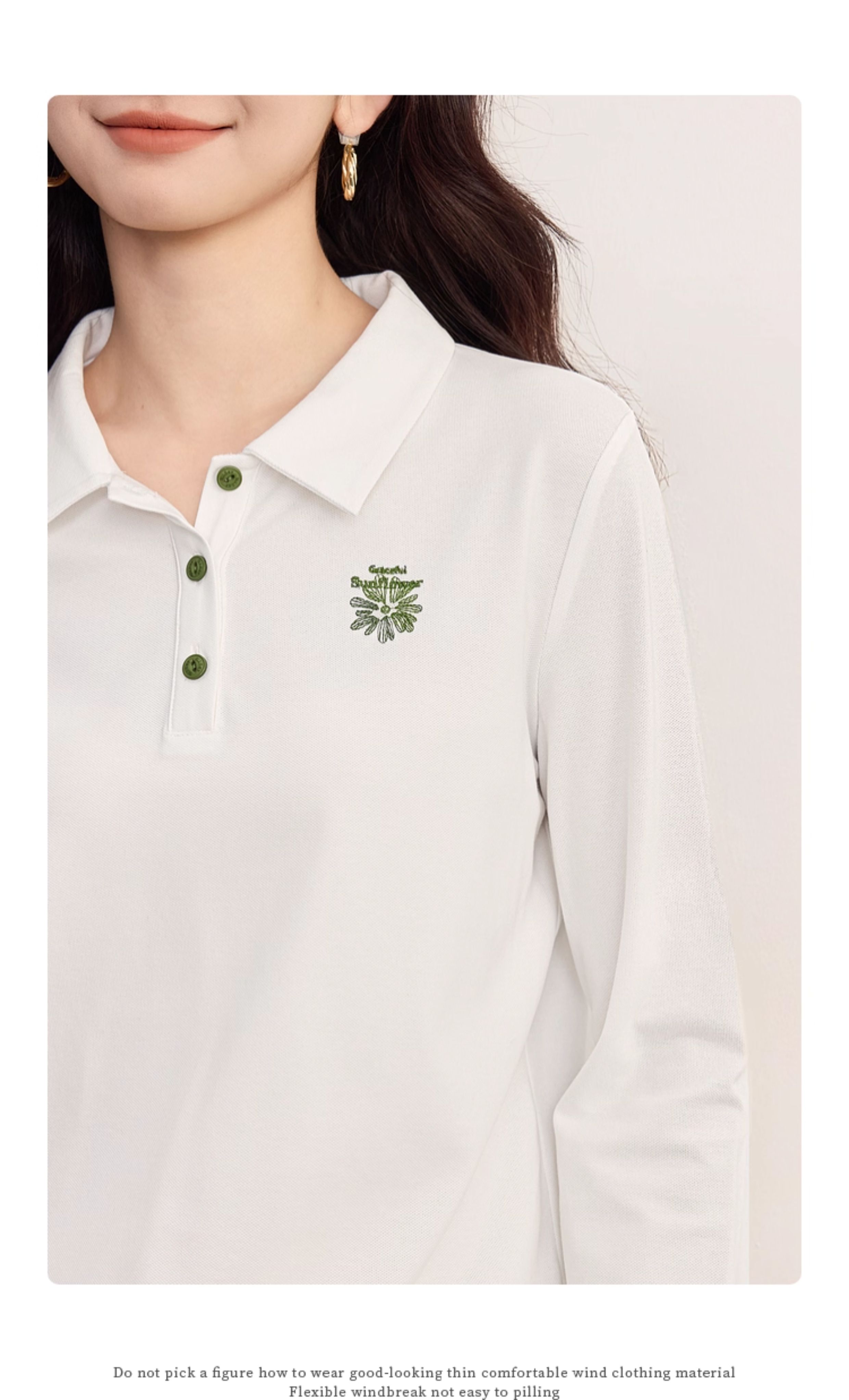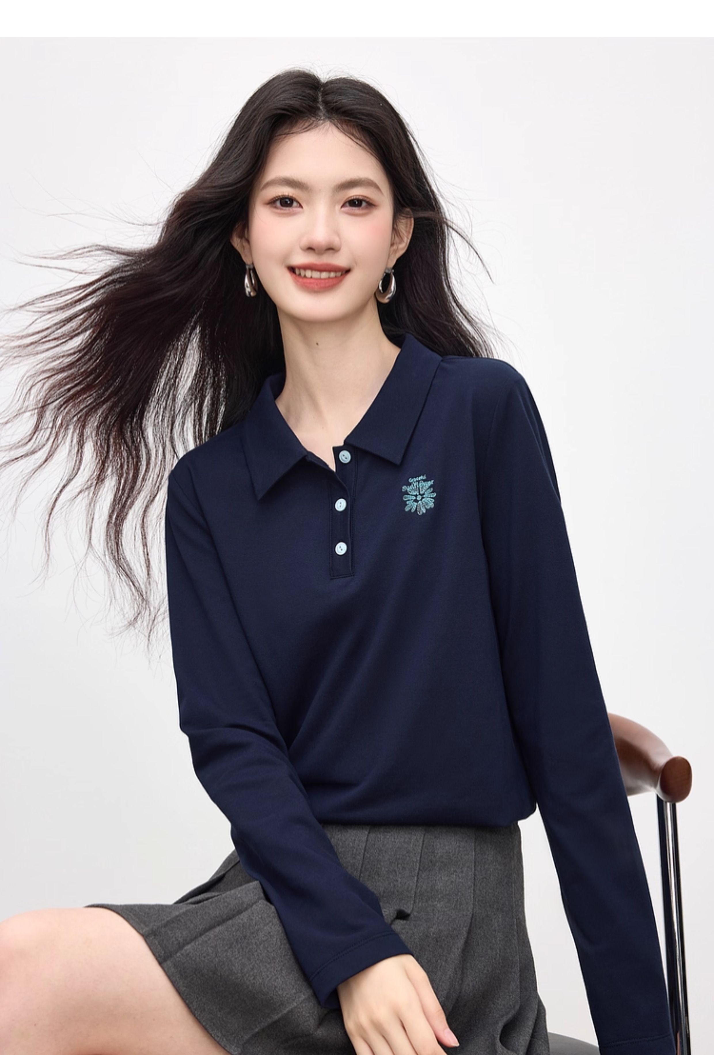【09/17新品】熙世界小雏菊绣花POLO领T恤女长袖通勤休闲正肩上衣2025秋季新款