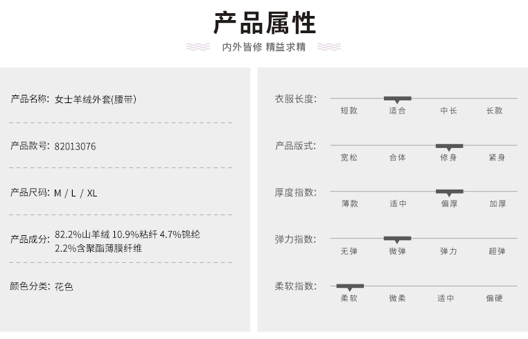 | 材质成分: 山羊绒(羊绒)82.2% 粘胶纤维(粘纤)10.9% 聚酰胺纤维(锦纶)4.7% 聚酯纤维2.2% |