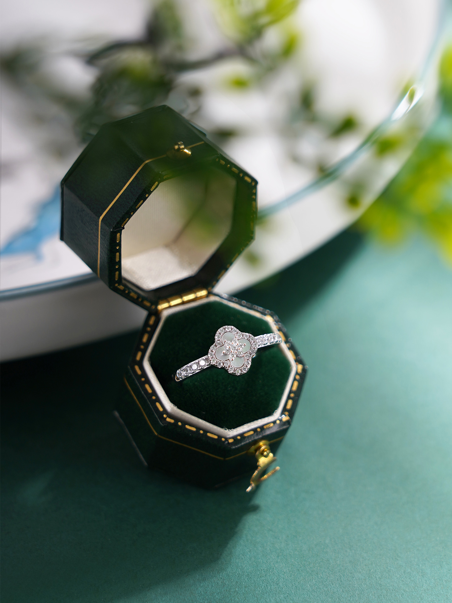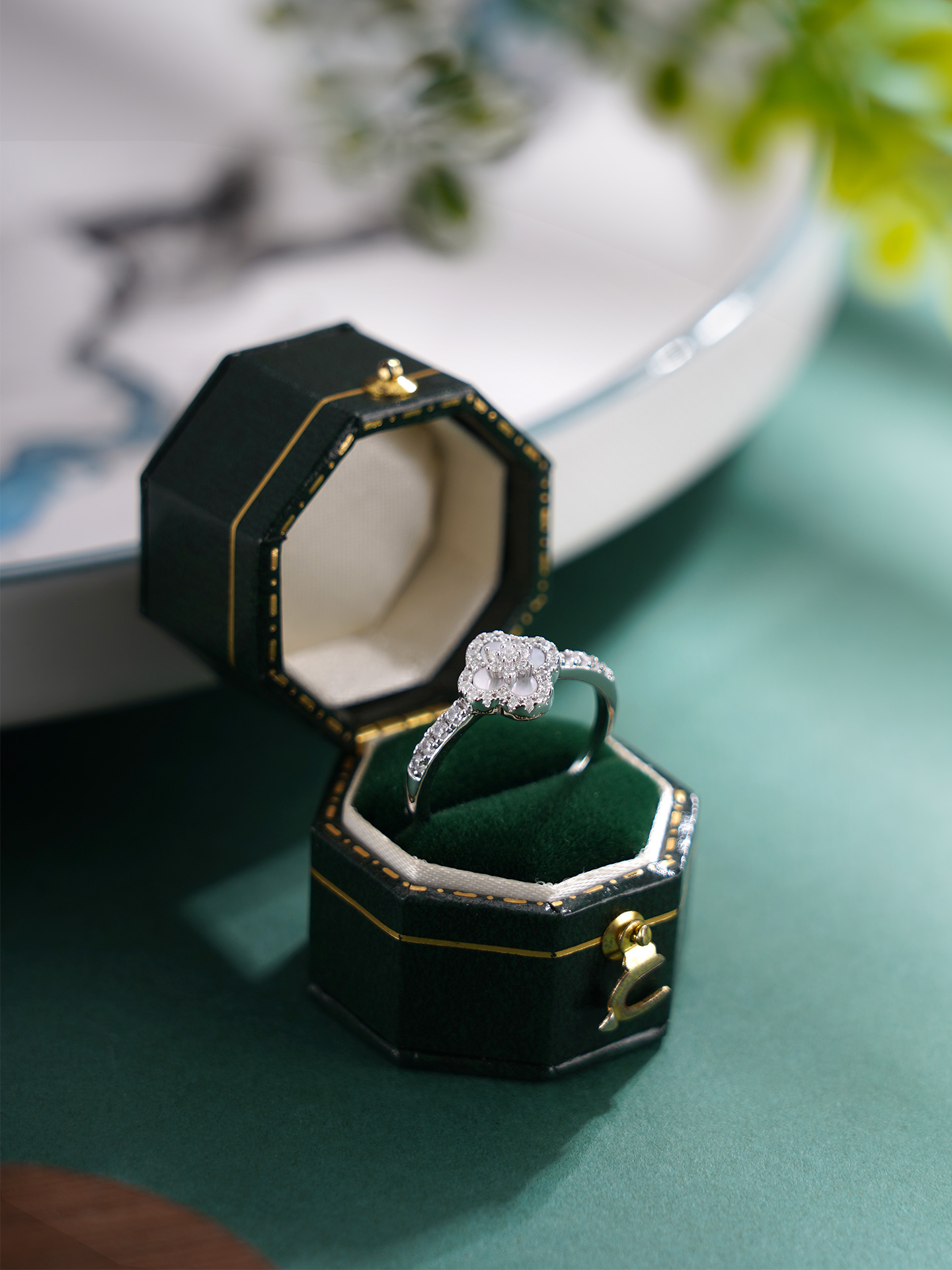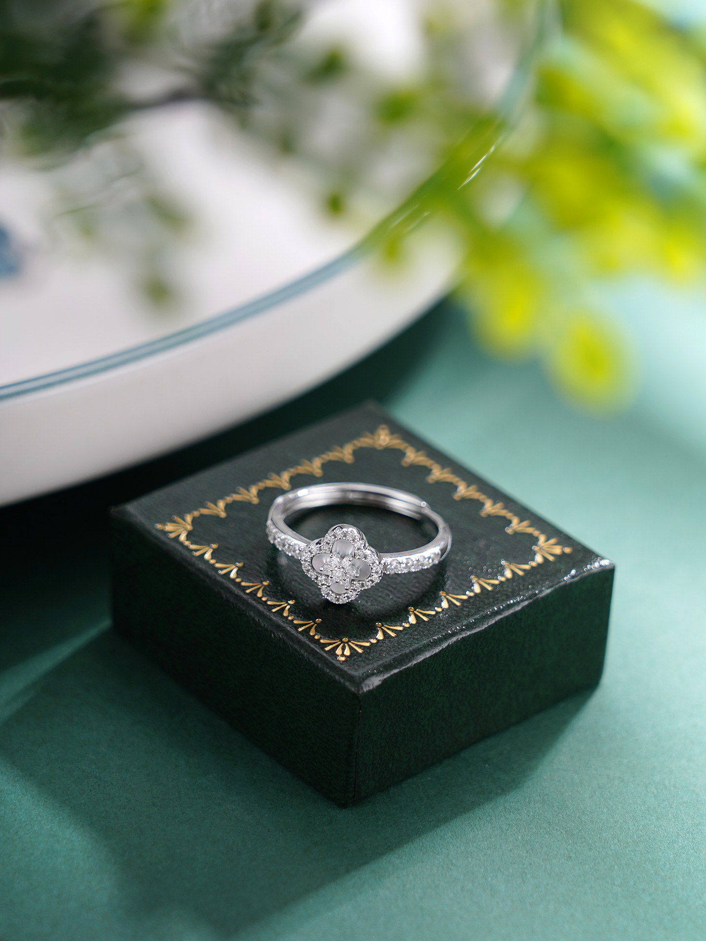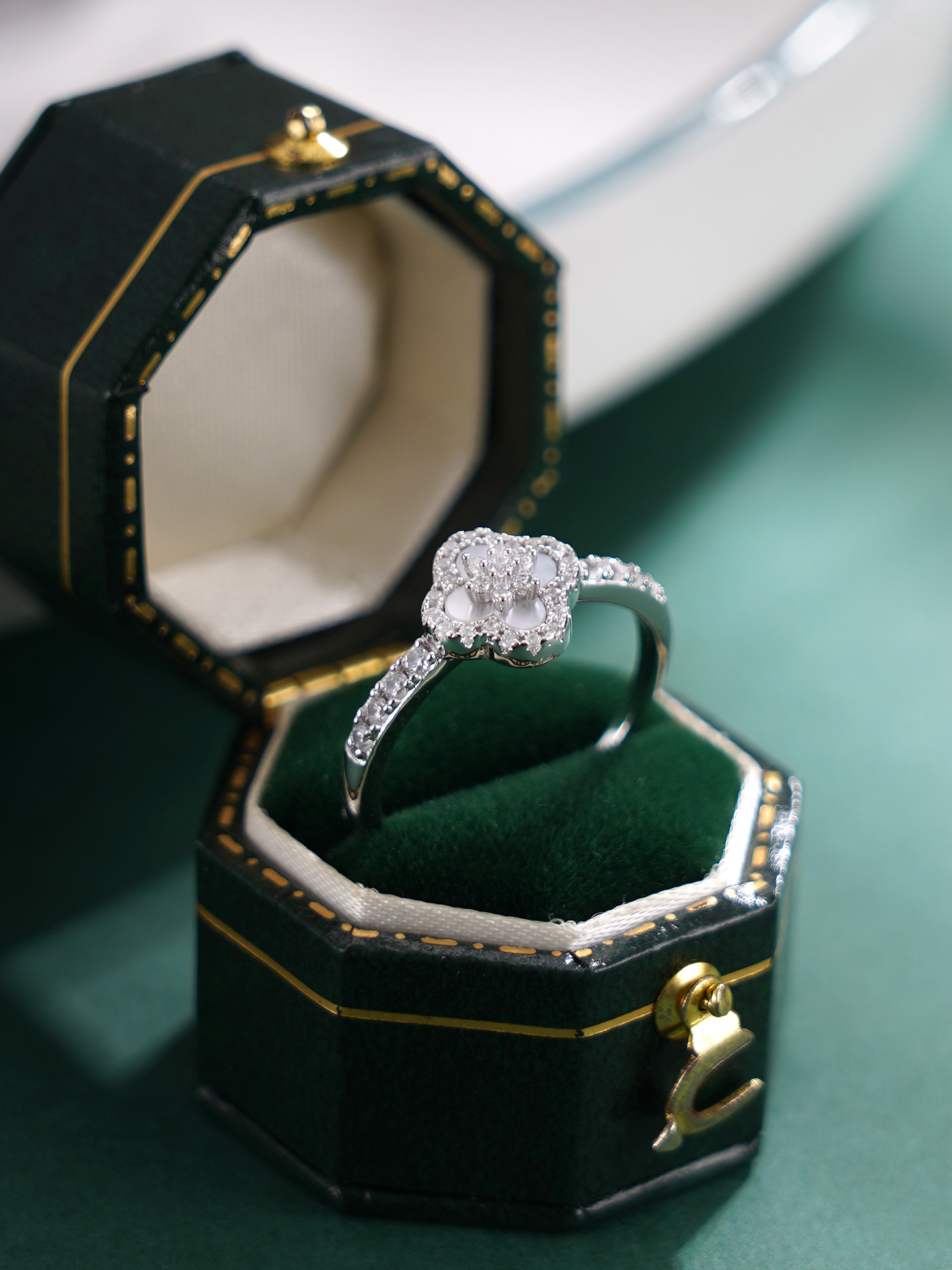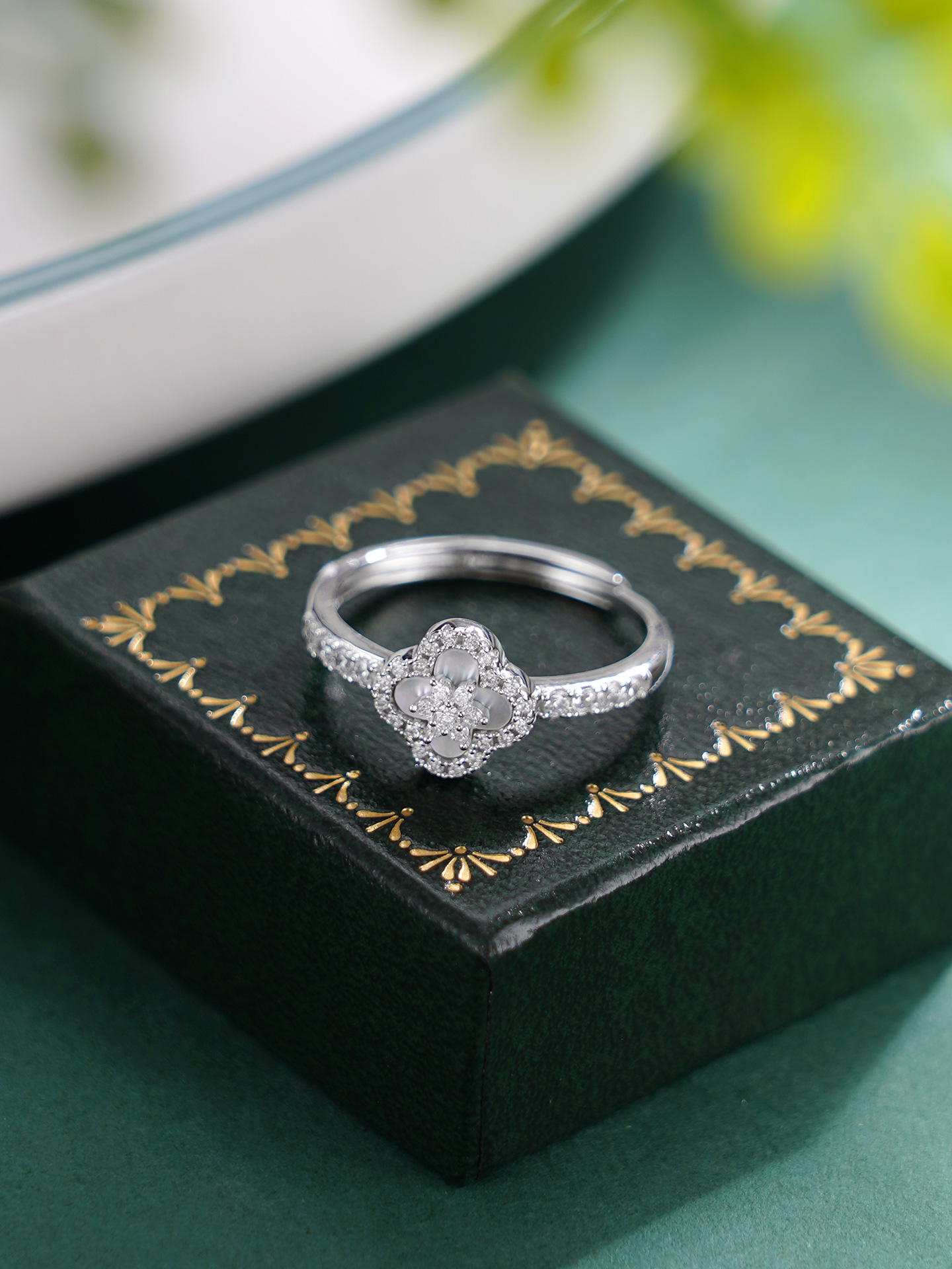 【寓意】:戒指以四叶草为灵感设计,甄选天然贝母,搭配锆石环绕镶嵌,独到的质感衬托出光彩照人的好气色。寓意幸运相随,福运长远。