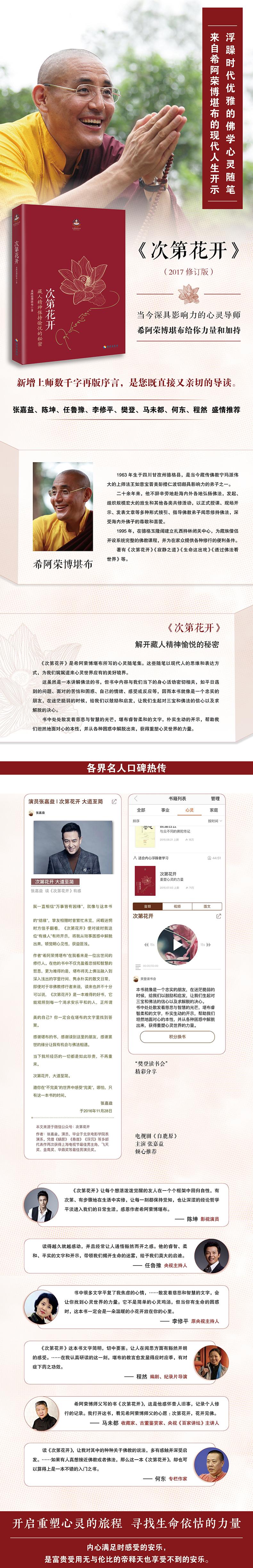 | ★累计销量超过50万册的佛教哲学经典——《次第花开》2017全新版。 ★希阿荣博堪布送给读者的现代人生开示,是现代人安顿心灵的智慧之 书。 ★希阿荣博堪布是当今颇具影响力的心灵导师,曾改变十几万人的生命轨迹。 ★透过藏人精神保持愉悦的秘密,得到快乐生活的启发,用内在的智慧面对生命的起伏。 ★陈坤、张嘉译、任鲁豫、李修平、樊登、马未、何东、程然盛情推荐。 |
