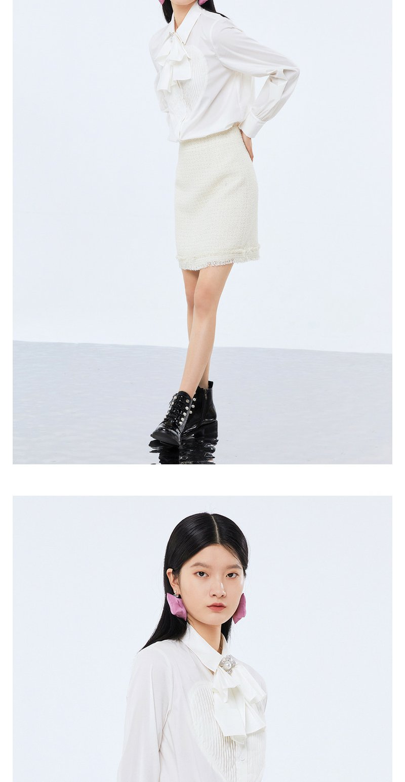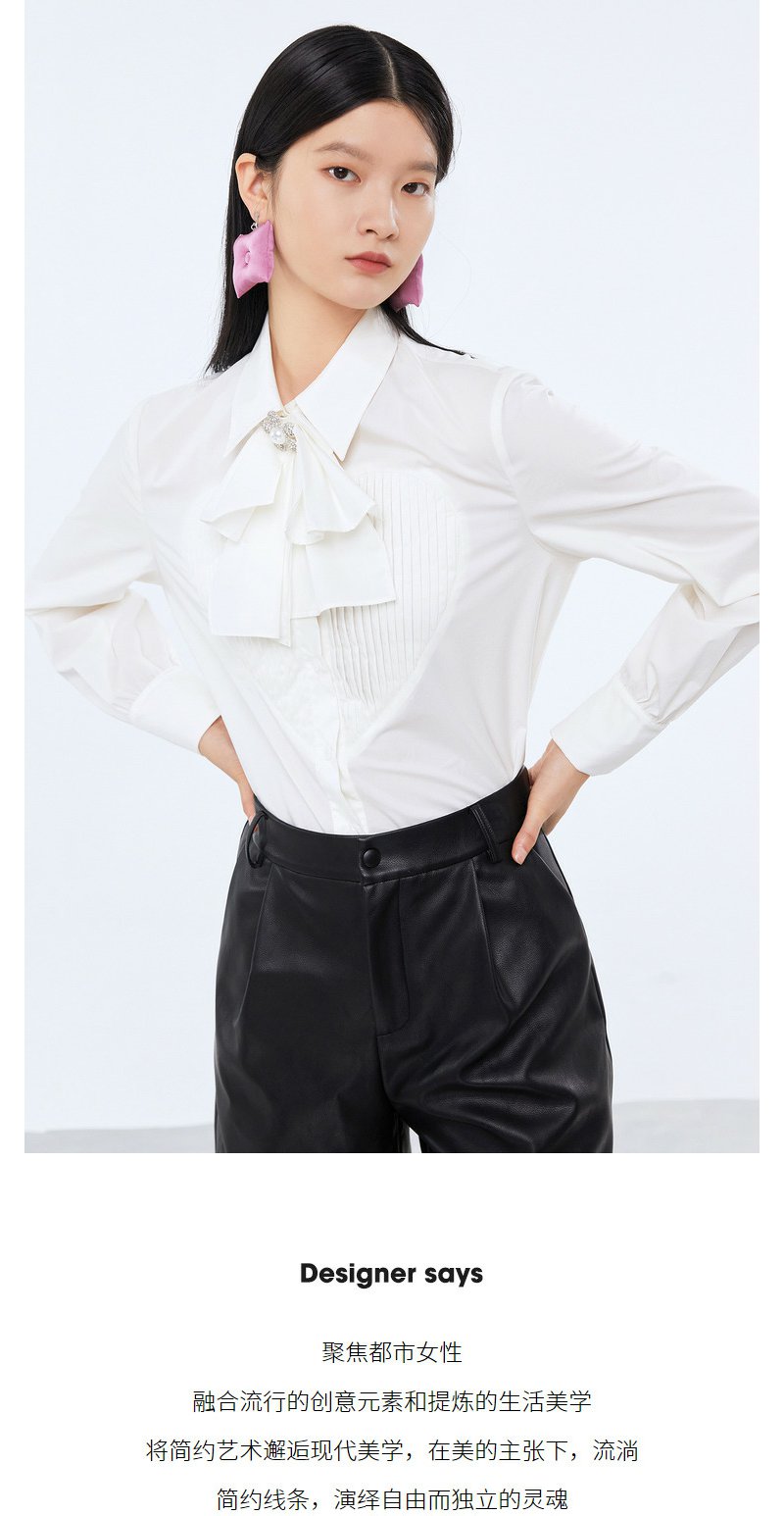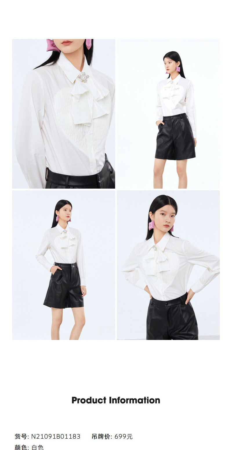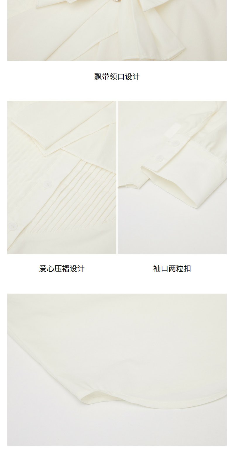 NEELLY纳俪西装领飘带白色衬衫女爱心压褶长袖上衣简约通勤秋季N21091B01183