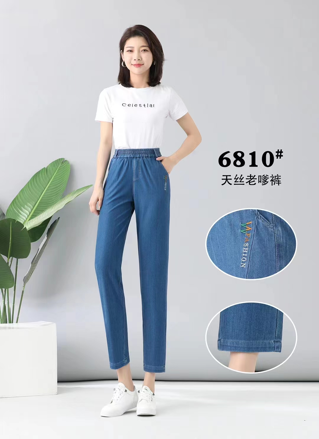 面料:天丝牛仔裤,面料柔软舒适、弹性好,不易起褶,版型简单大方,适合25岁以上人群穿着,搭配衬衫、体恤衫均可