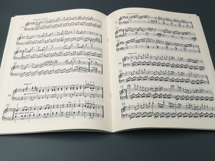 第59首右手十六分音符三连音的短小乐句应弹得轻巧、活泼。左手的双音及和弦重复较多,要弹得轻而匀,不能响而重,只有最后一行可伴随右手作渐强进行。