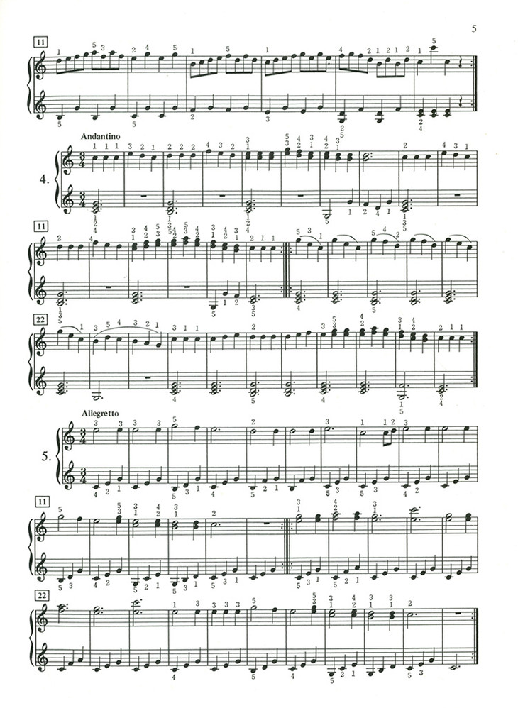 第43首要注意左、右手都有持续的保留音。第3小节与第4小节中,连续进行的平行六度也可以用相同的指法。