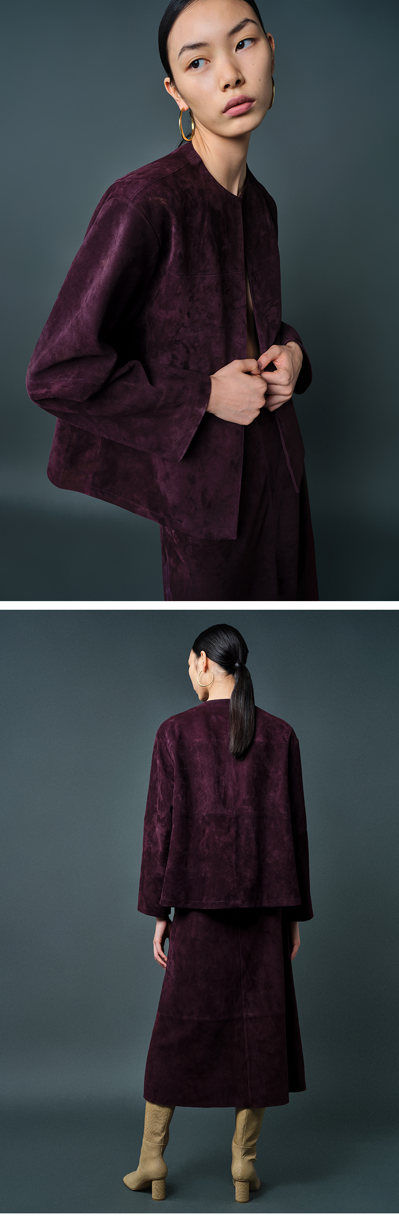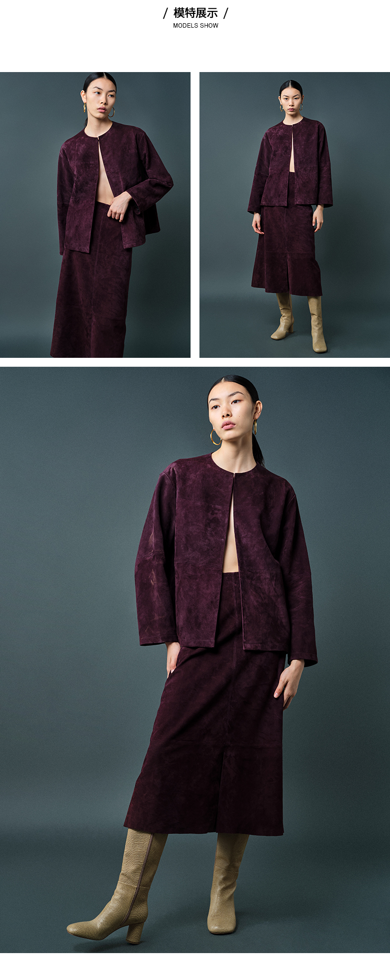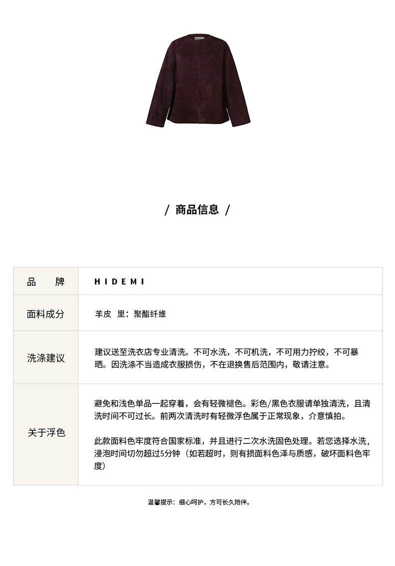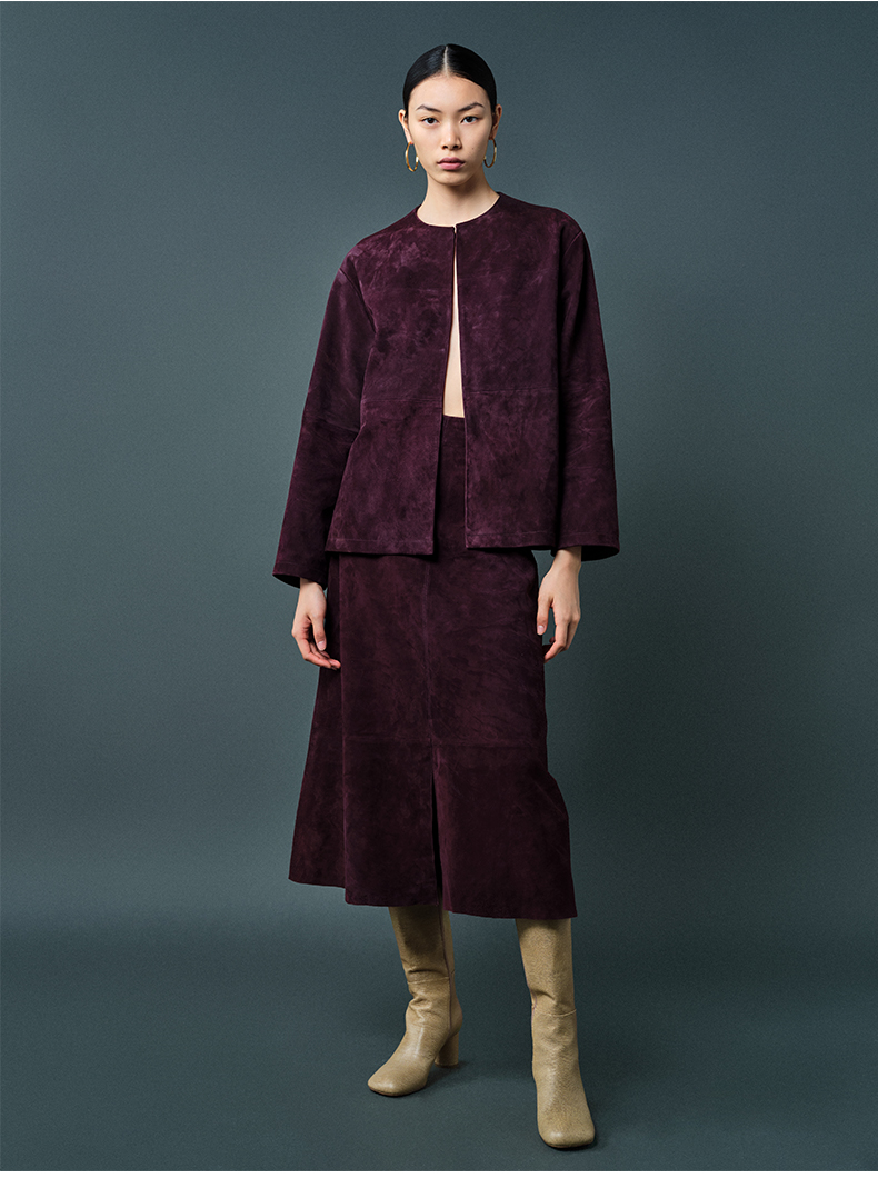 HIDEMI 勃艮第酒红色麂皮圆领短款外套