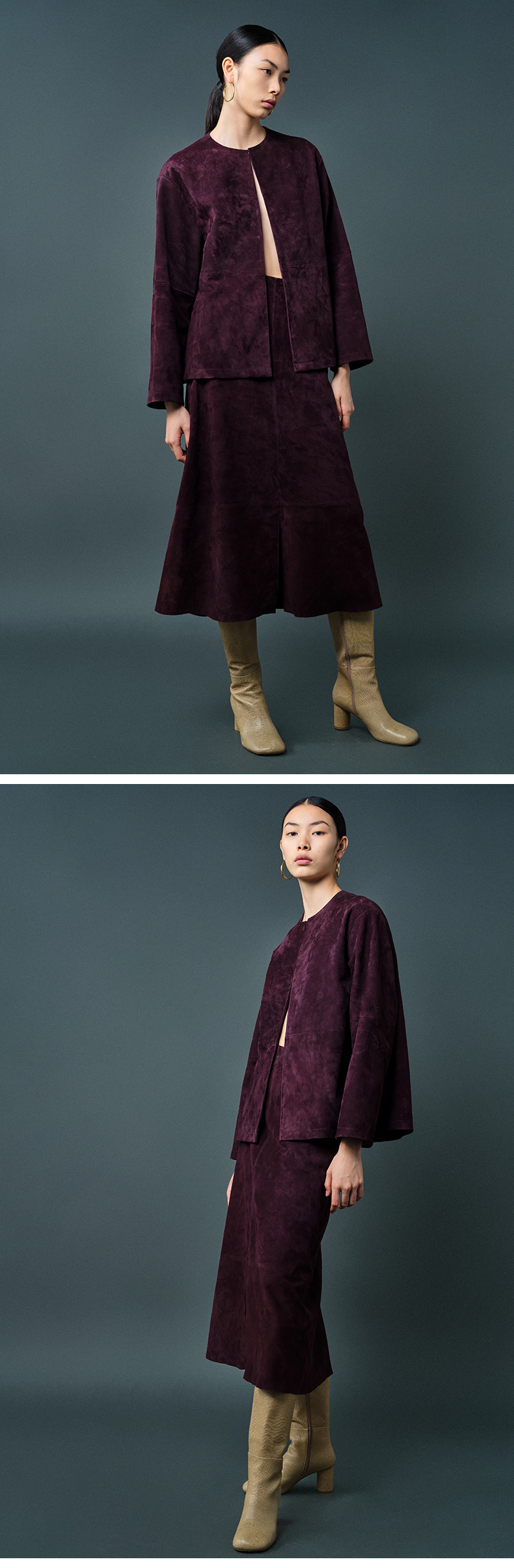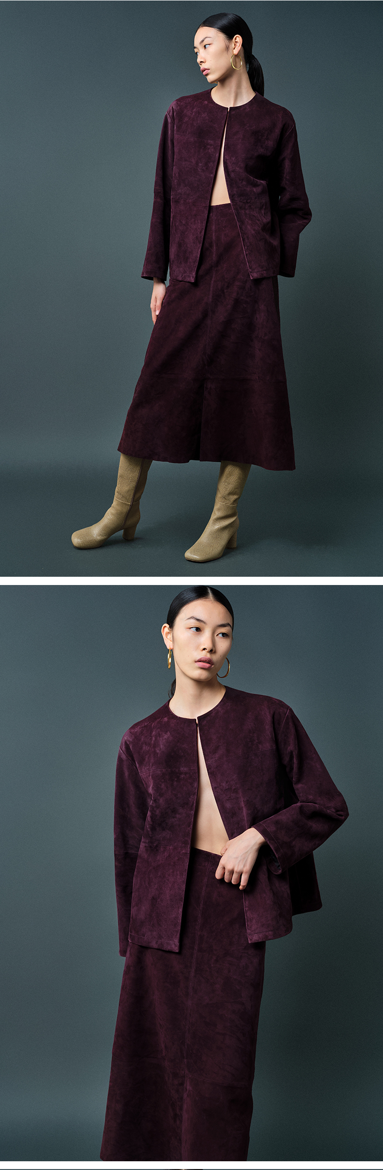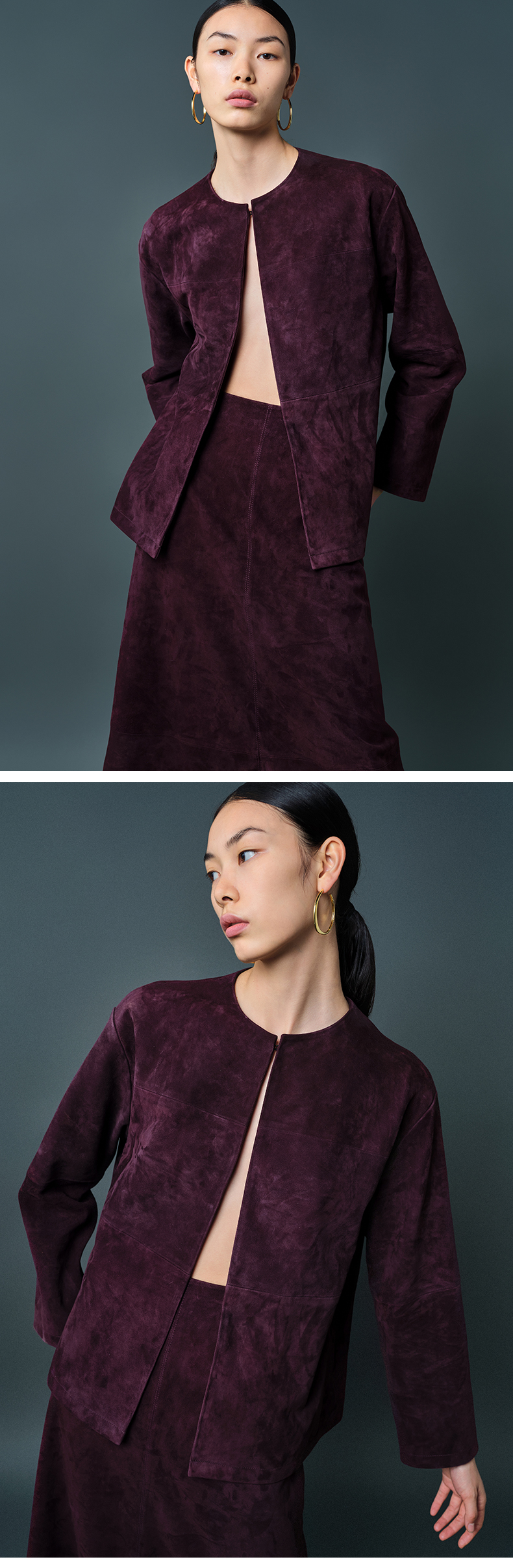 HIDEMI 勃艮第酒红色麂皮圆领短款外套