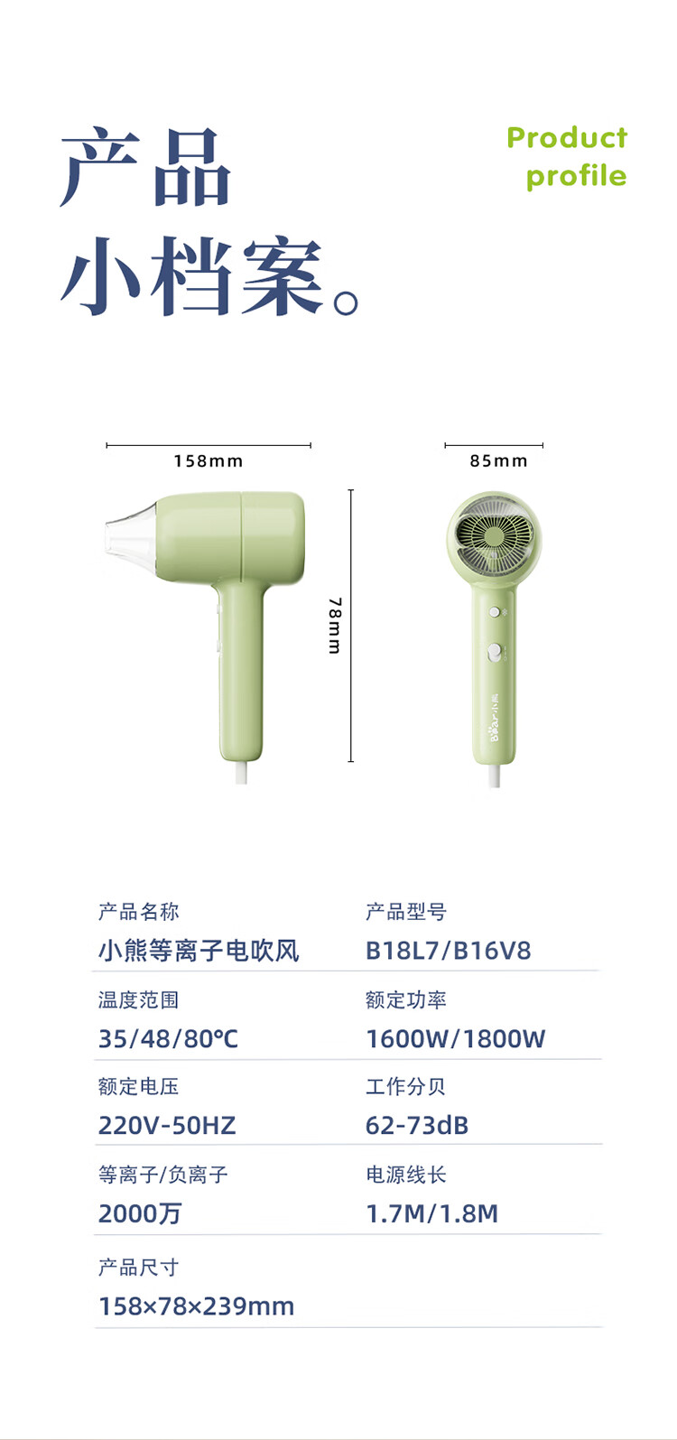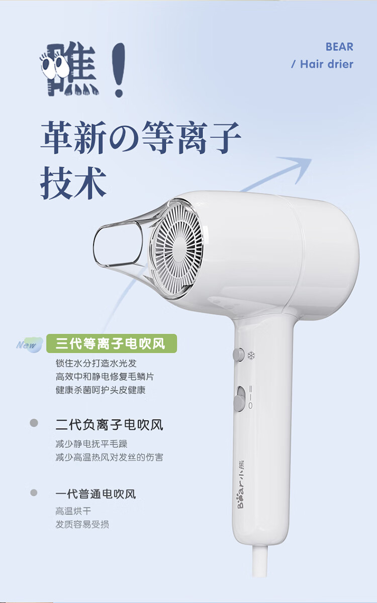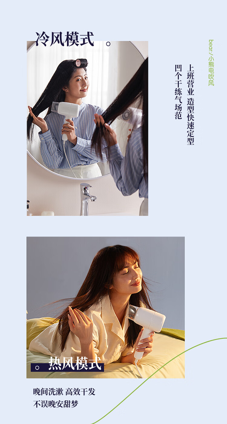 小熊电吹风机家用大功率负离子护发恒温速干迷你学生宿舍吹风机负离子 B18L7