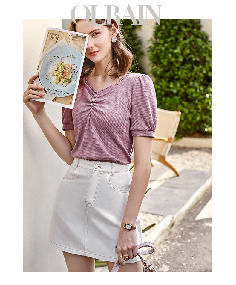 OLrain欧芮儿V领短袖刺绣图案POLO衫女夏季2025新款气质上衣